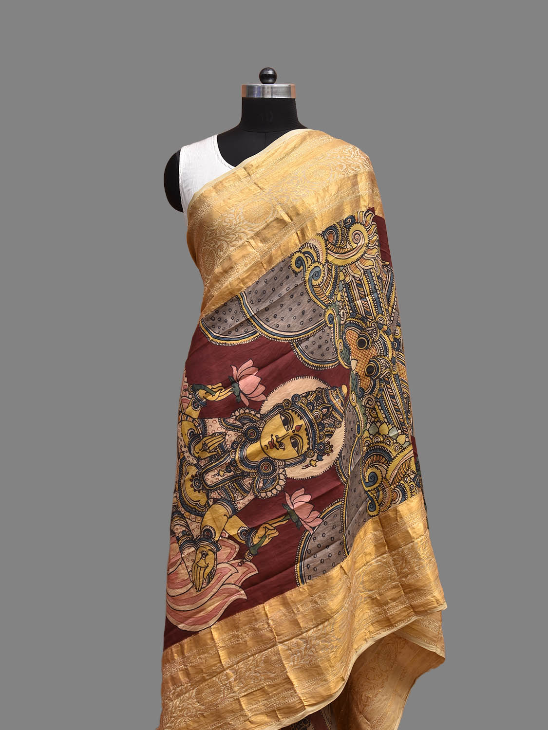 Dark Red and Cream Kalamkari Hand Painted Kanchipuram Silk Dupatta with Saraswati Design. This hand painted kalamkari is done using natural dyes. As they are natural colors they bleed with initial washes, so we suggest Dry clean.
