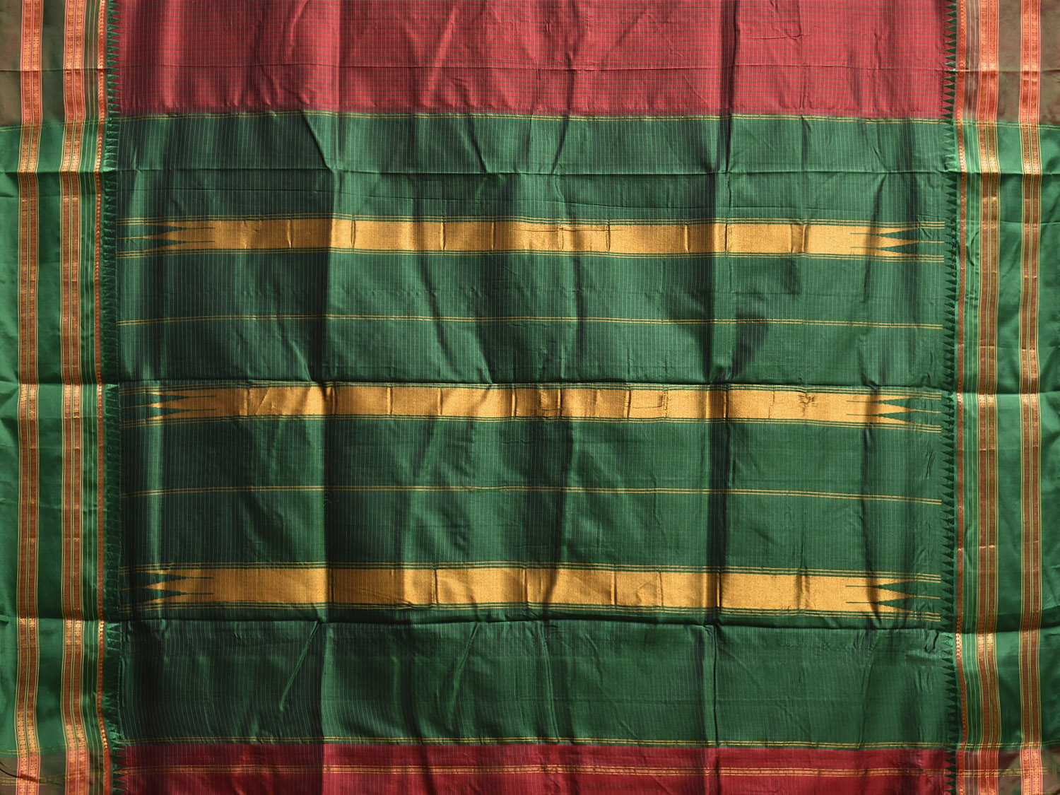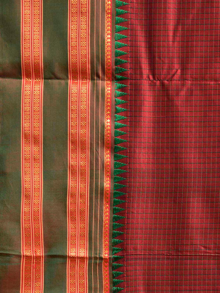 Dark Red and Green Narayanpet Silk Saree with Checks and Contrast Pallu Design No Blouse. These are Traditional Narayanpet Design Sarees. For fabric care we advise dry clean. This Saree has no Blouse.