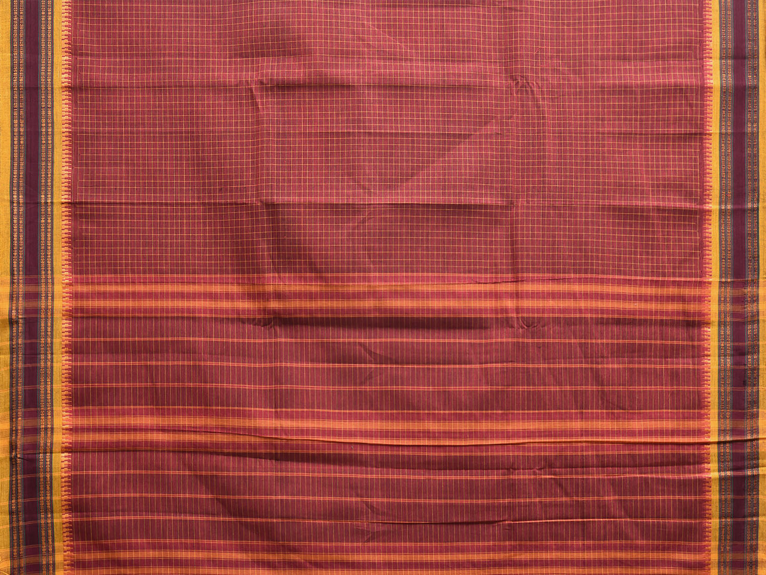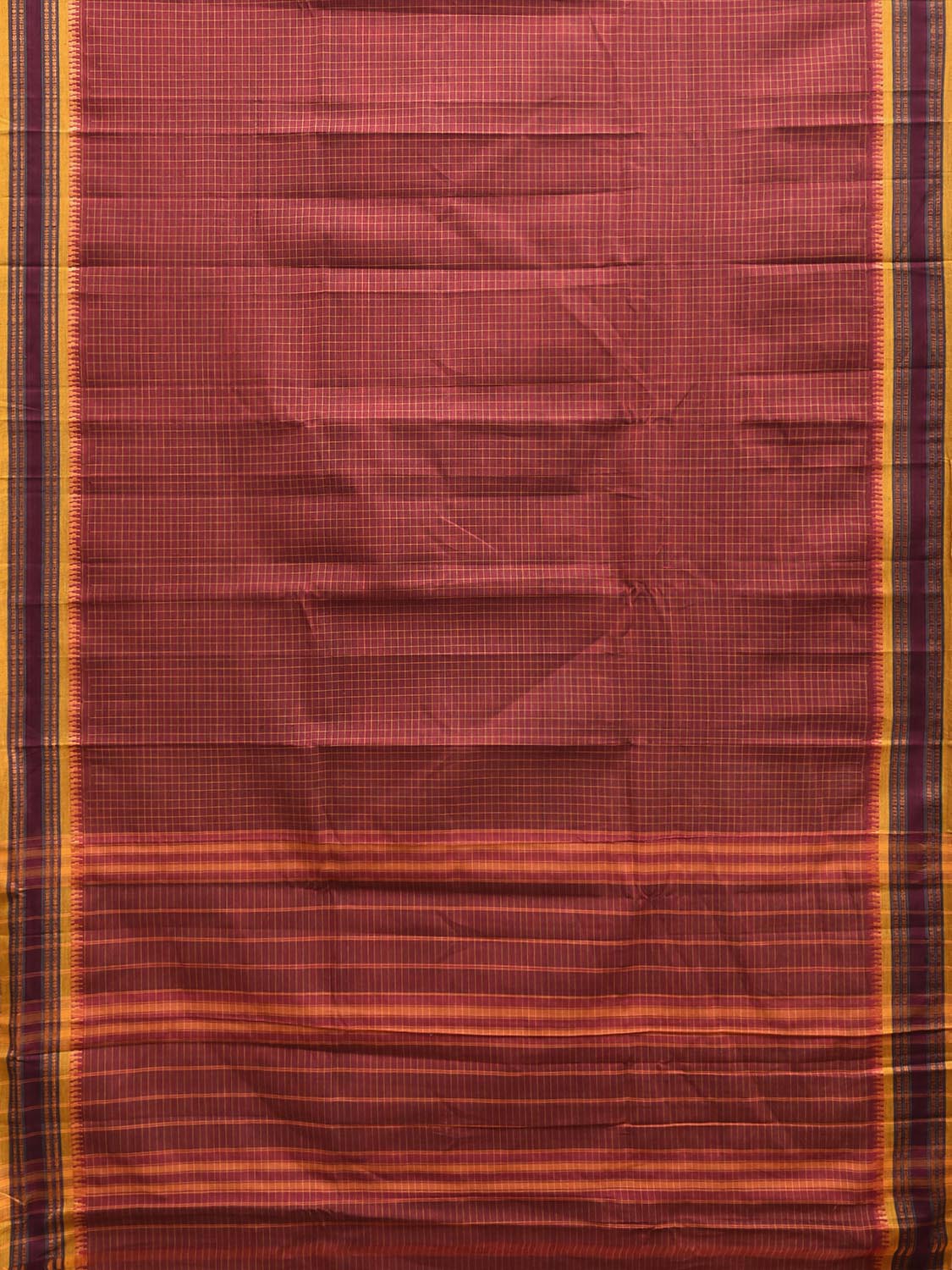 Dark Red and Yellow Narayanpet Cotton Handloom Saree with Checks Design No Blouse. These are Traditional Narayanpet Design Sarees. For fabric care we advise dry clean. This Saree has no Blouse.