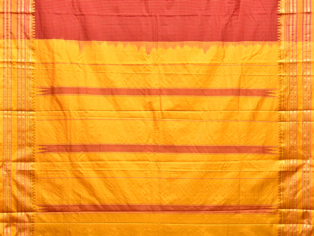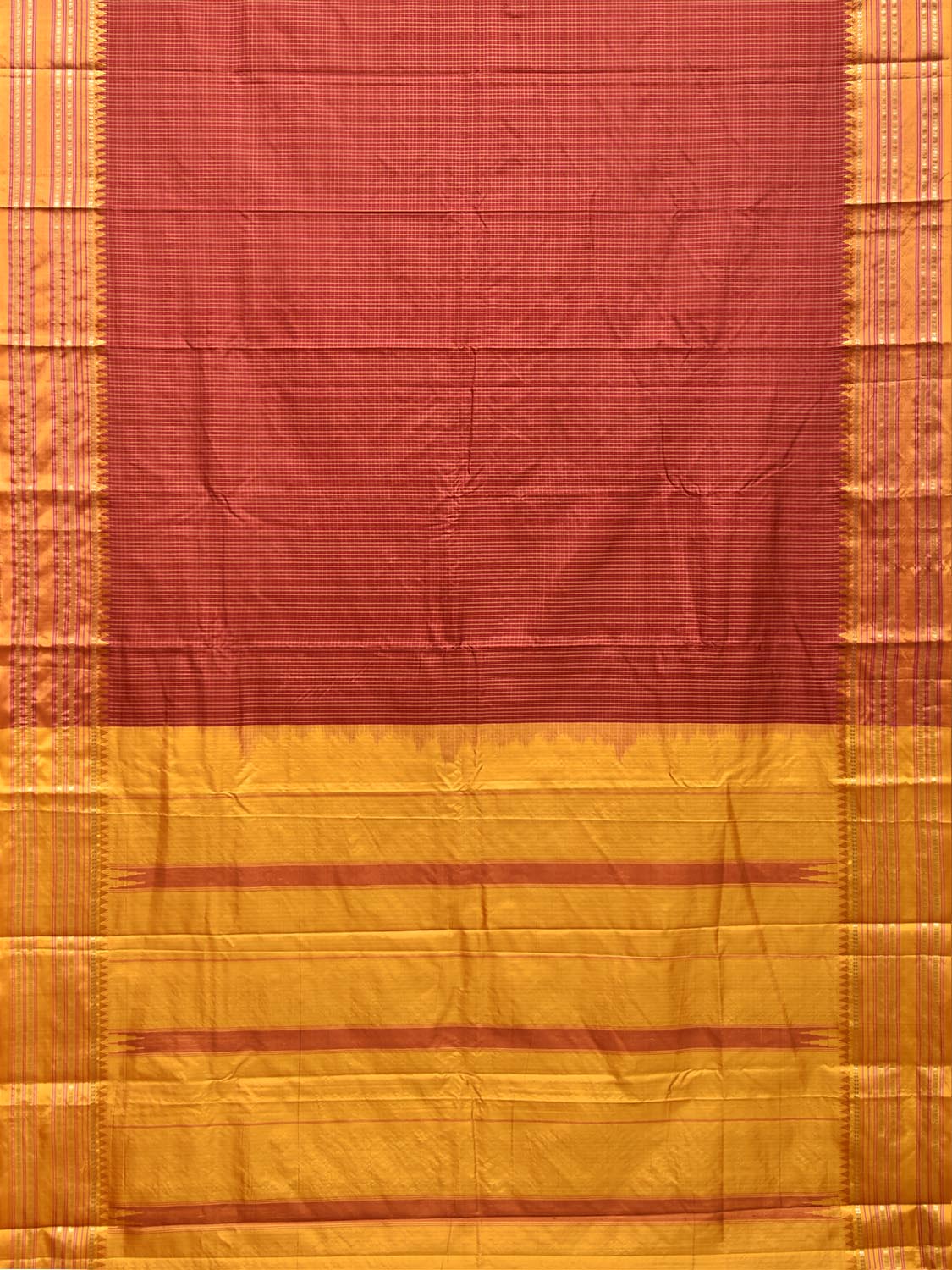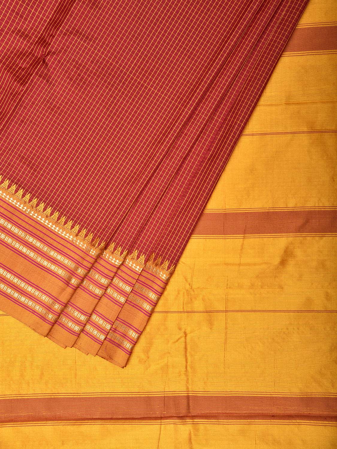 Dark Red and Yellow Narayanpet Cotton Silk Saree with Checks Design No Blouse.