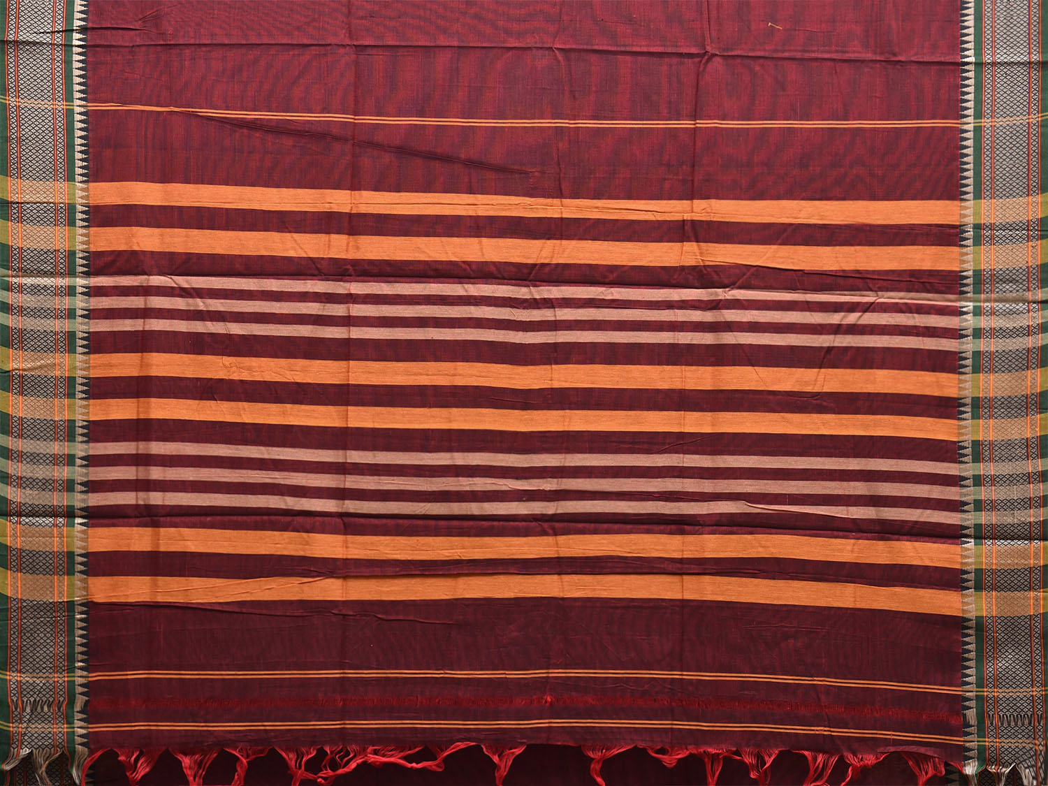Dark Red Narayanpet Cotton Plain Saree with Strips Pallu and Border Design No Blouse. This saree has no blouse.