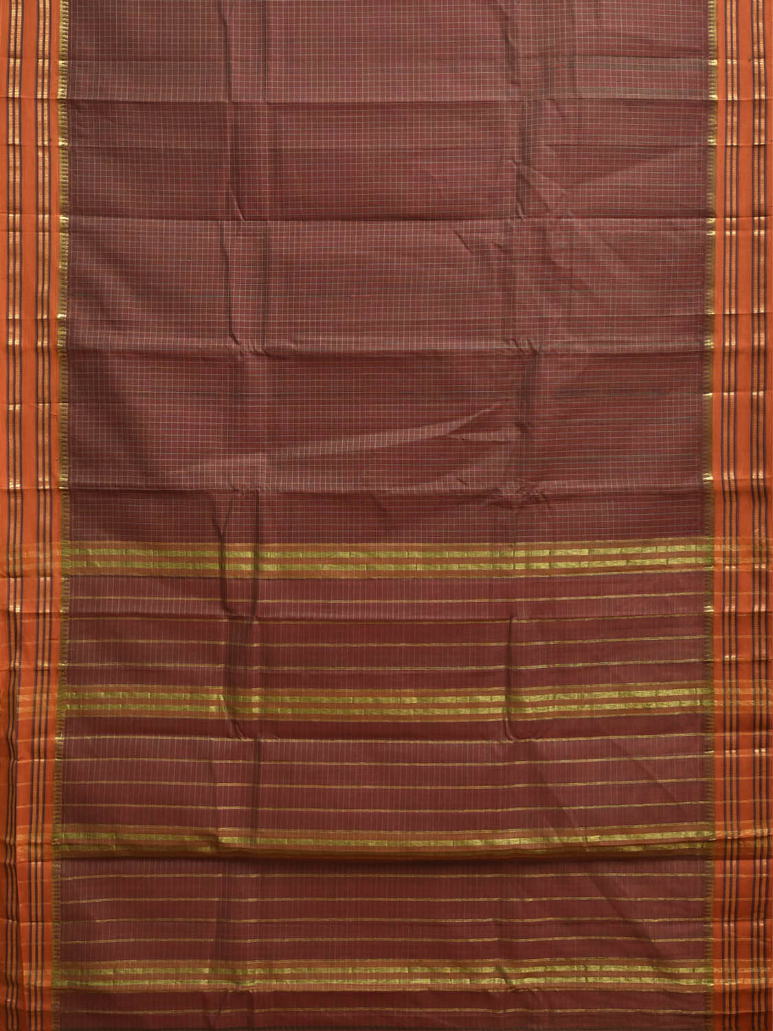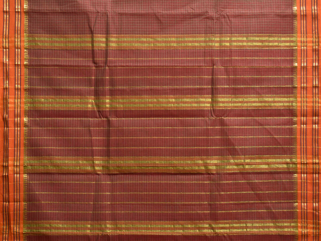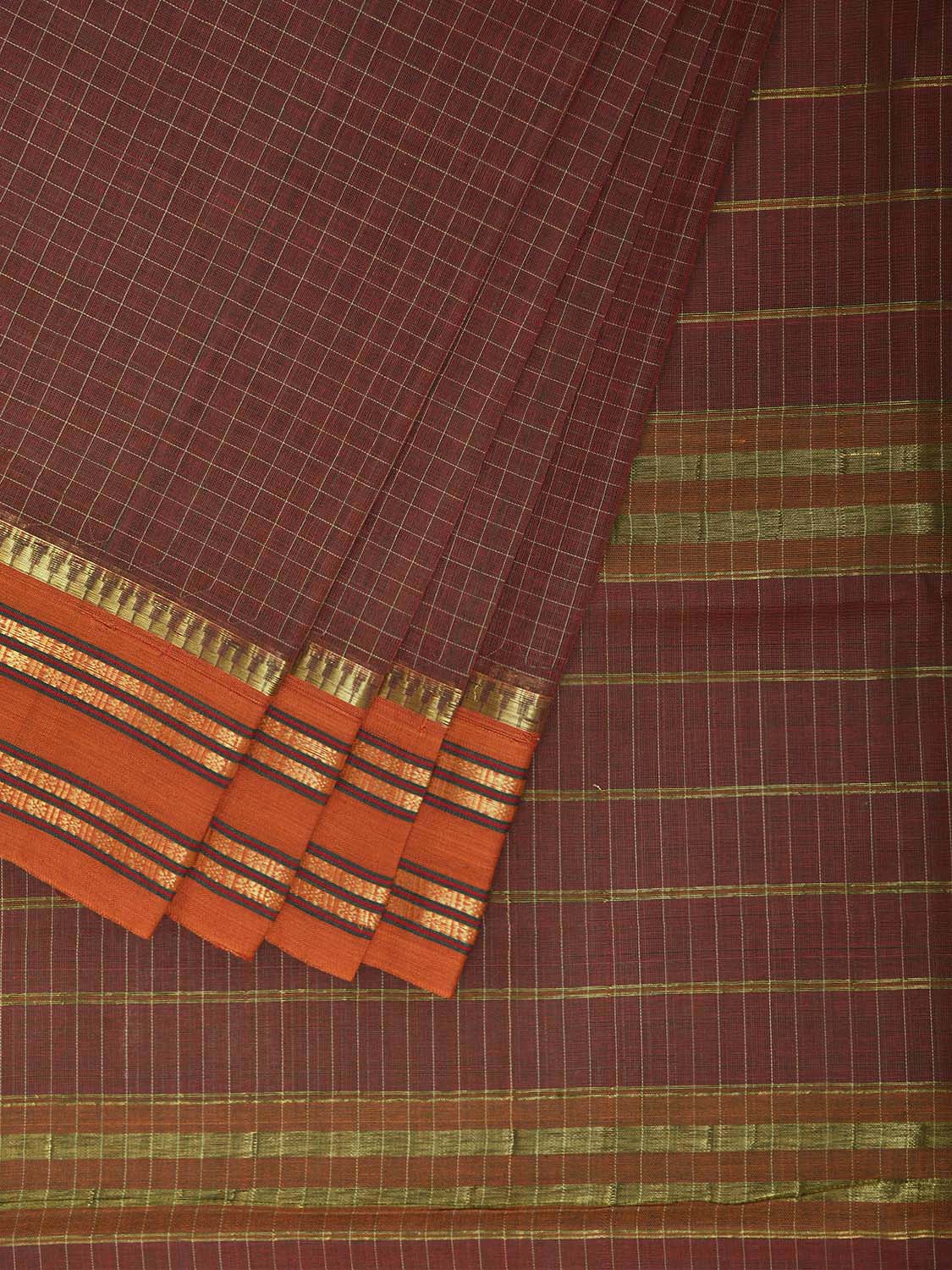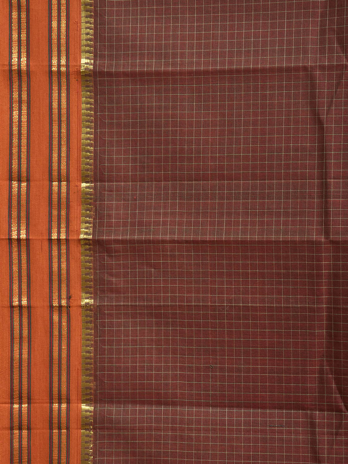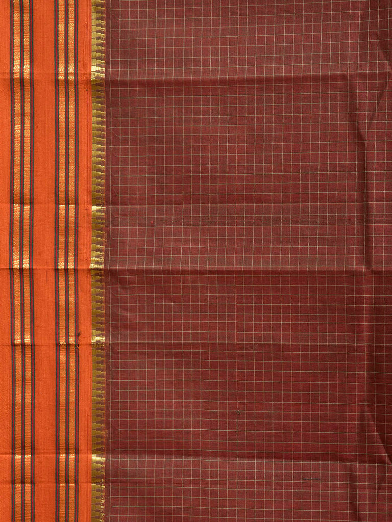 Dark Rust and Orange Narayanpet Cotton Handloom Saree with Checks Design No Blouse. This saree has no blouse.