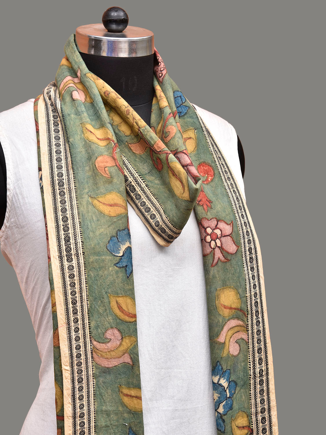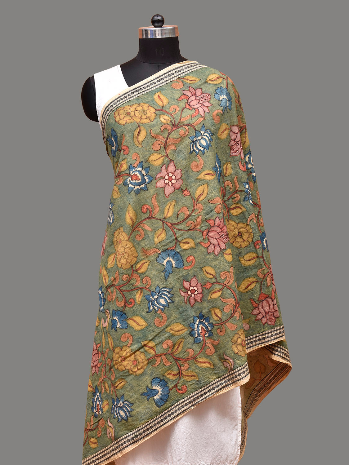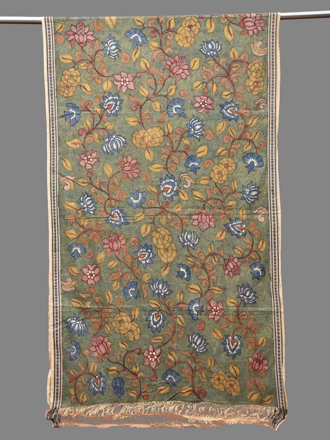 Green and Blue Kalamkari Hand Painted Cotton Handloom Dupatta with Lotus Flowers Design. This hand painted kalamkari is done using natural dyes. As they are natural colors they bleed with initial washes, so we suggest Dry clean.