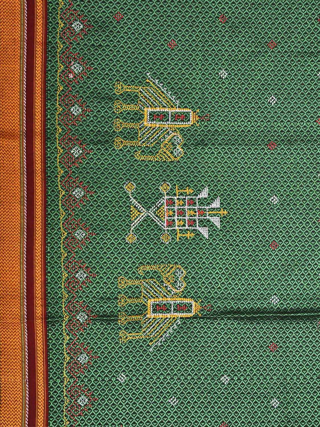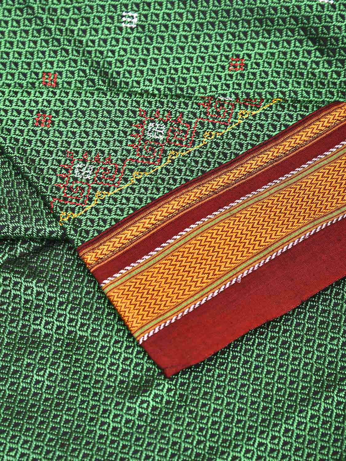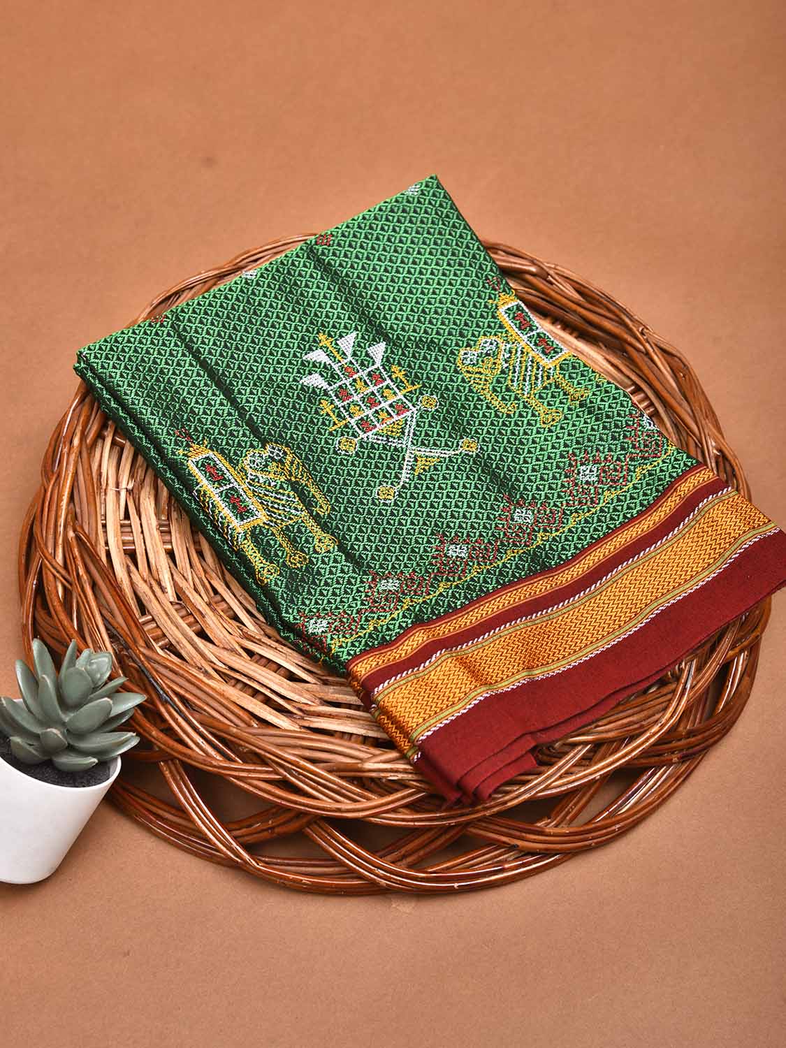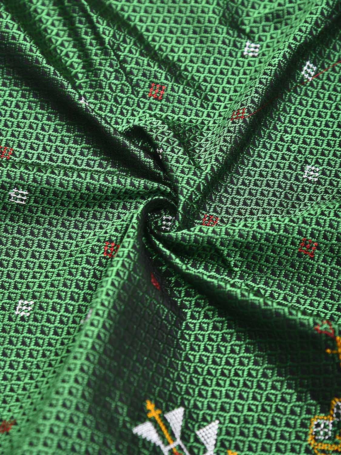 Green and Dark Red Kasuti Jacquard Viscose Blouse with Elephants Design Length 1mt Width 36 Inches. Beautiful Pattern Blouse Fabric and Easy to Match to Any Suitable Saree. We Advise Gentle Handwash for Fabric Care.