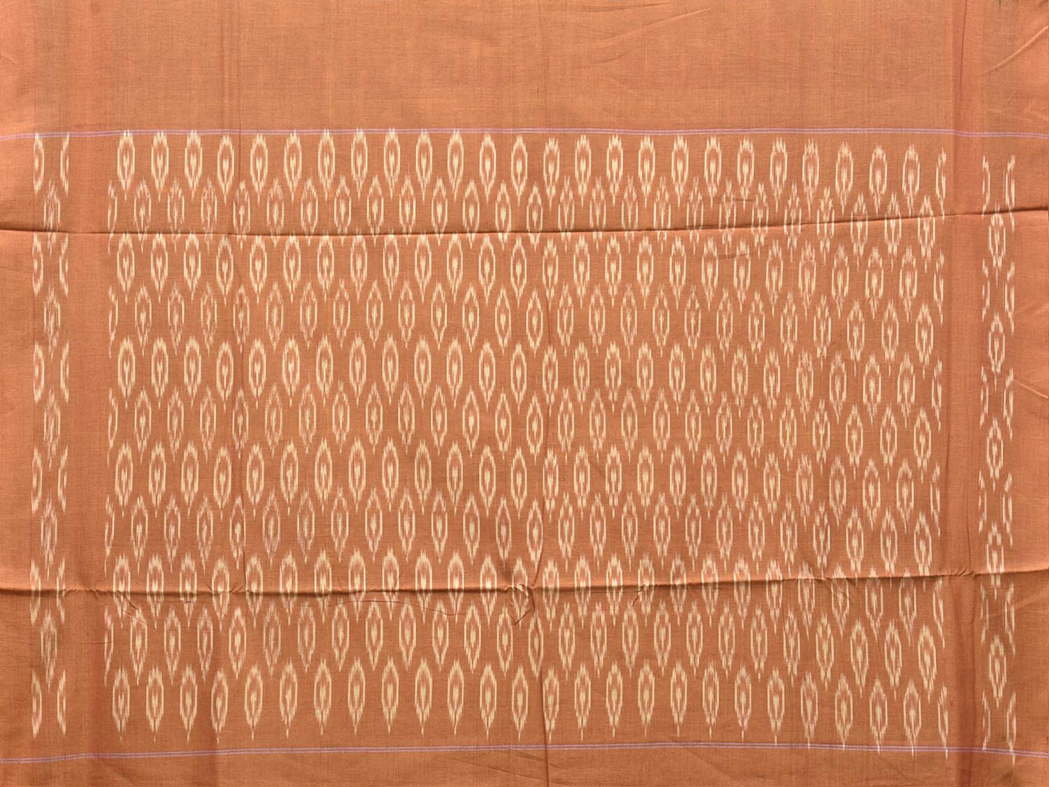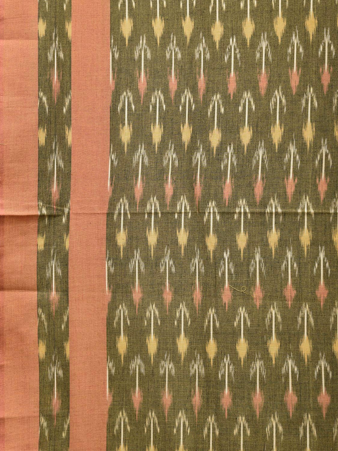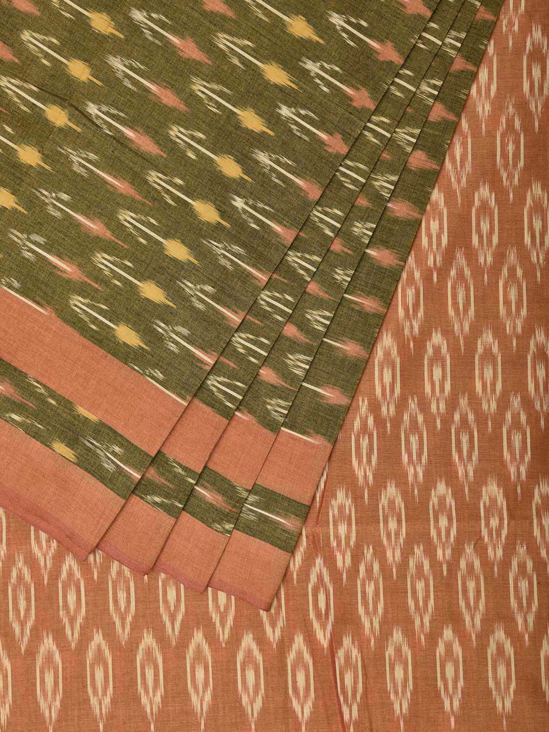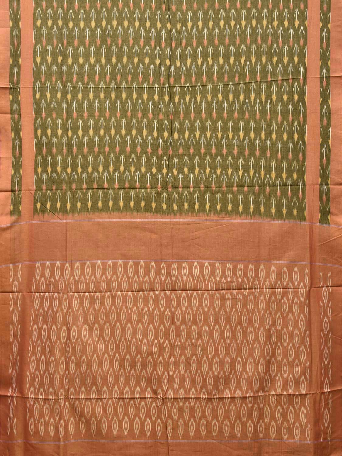 Green and Light Orange Pochampally Ikat Cotton Handloom Saree with Arrow Head Buta and Pallu Design No Blouse. This Handloom Saree from Andhra Pradesh has been woven using the resist-dyeing, which produces the unique patterns adorning the fabric. We advise gentle handwash separately for fabric care. This saree has no blouse.