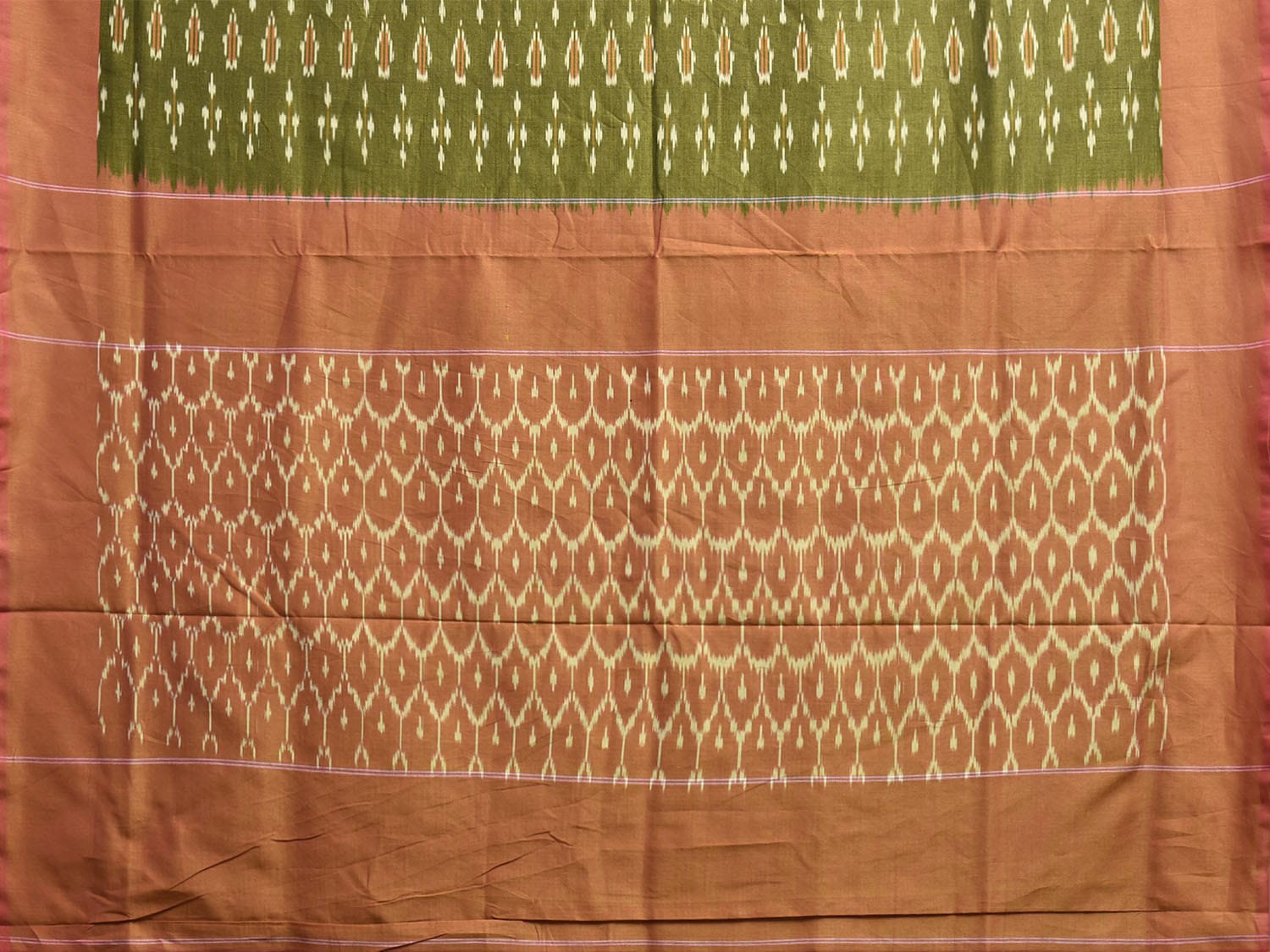 Green and Mustard Pochampally Ikat Cotton Handloom Saree with Grill Pallu Design No Blouse. This Handloom Saree from Andhra Pradesh has been woven using the resist-dyeing, which produces the unique patterns adorning the fabric. We advise gentle handwash separately for fabric care. This saree has no blouse.