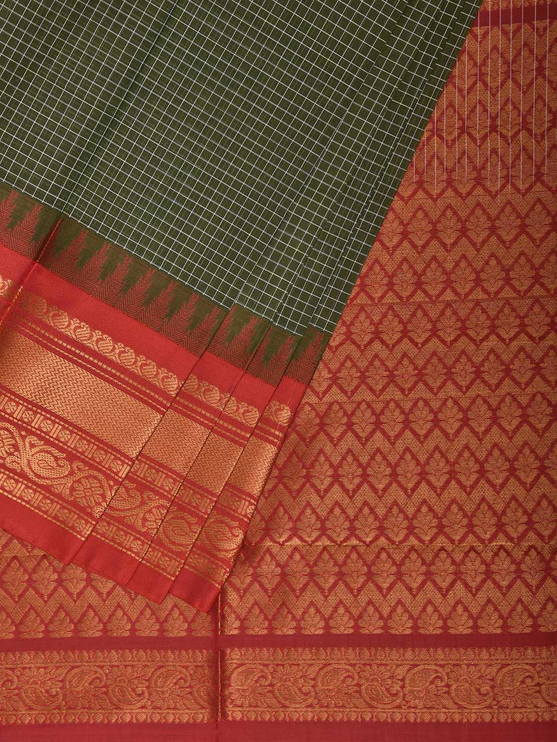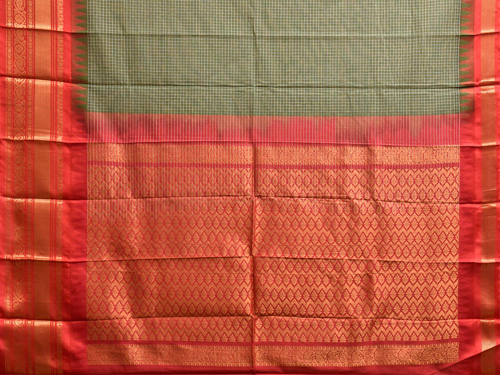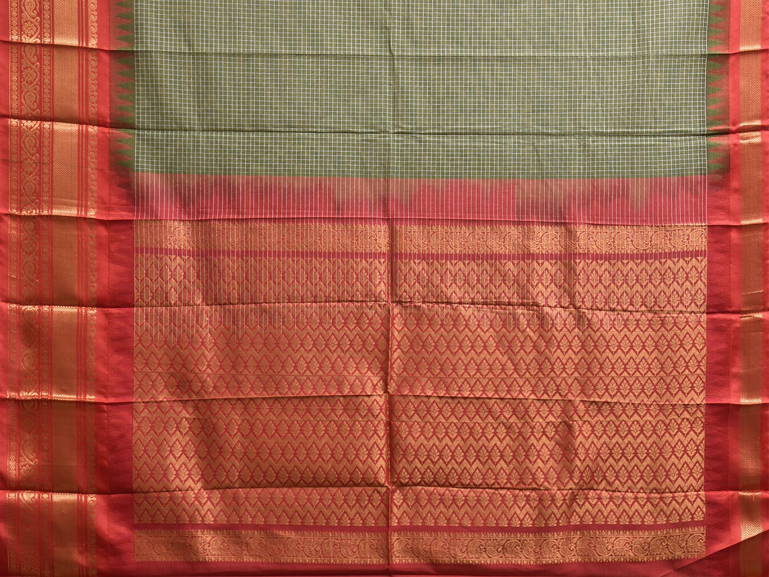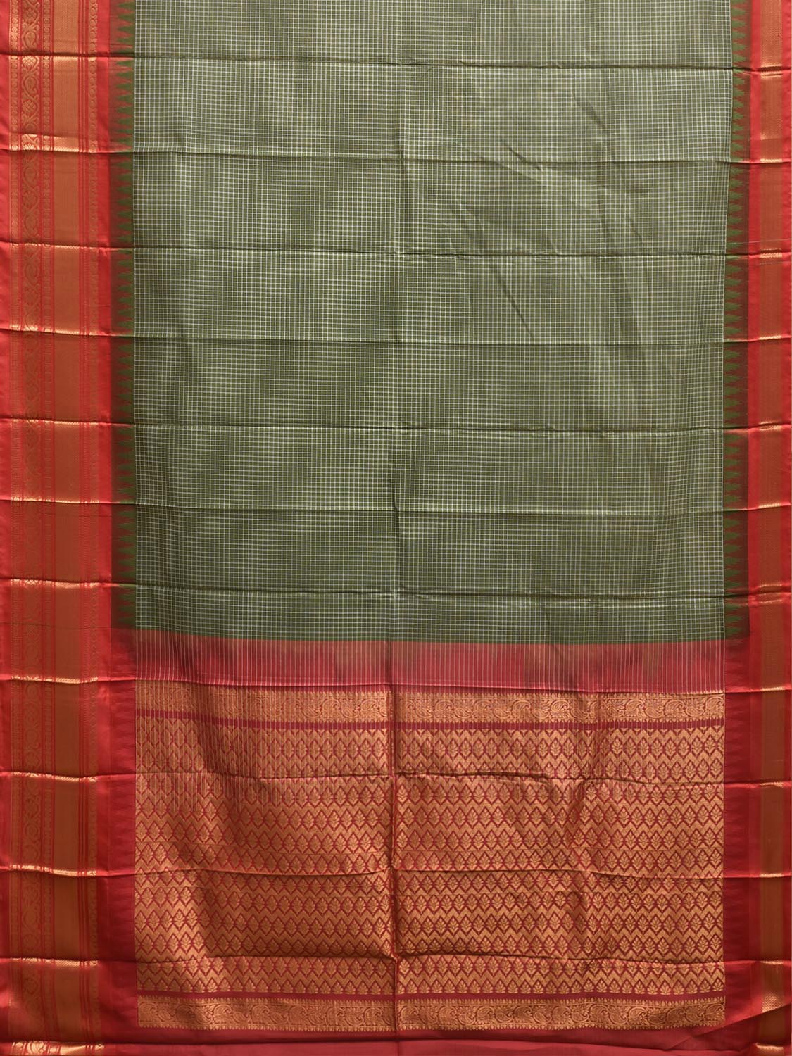 Green and Red Gadwal Body Cotton Viscose Pallu Saree with Checks and Border-Pallu Design No Blouse. Gadwal Sarees are known for their traditional design of border and pallu made of silk and body being either cotton or silk. They are known as Sico sarees for border and pallu being silk and body being cotton. We advice dry clean for fabric care. This saree has no blouse.