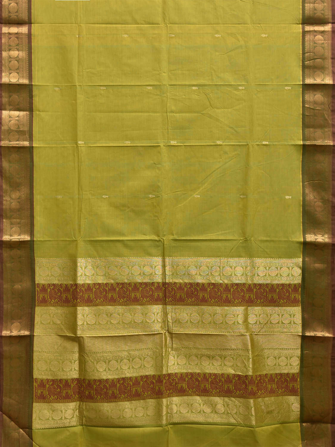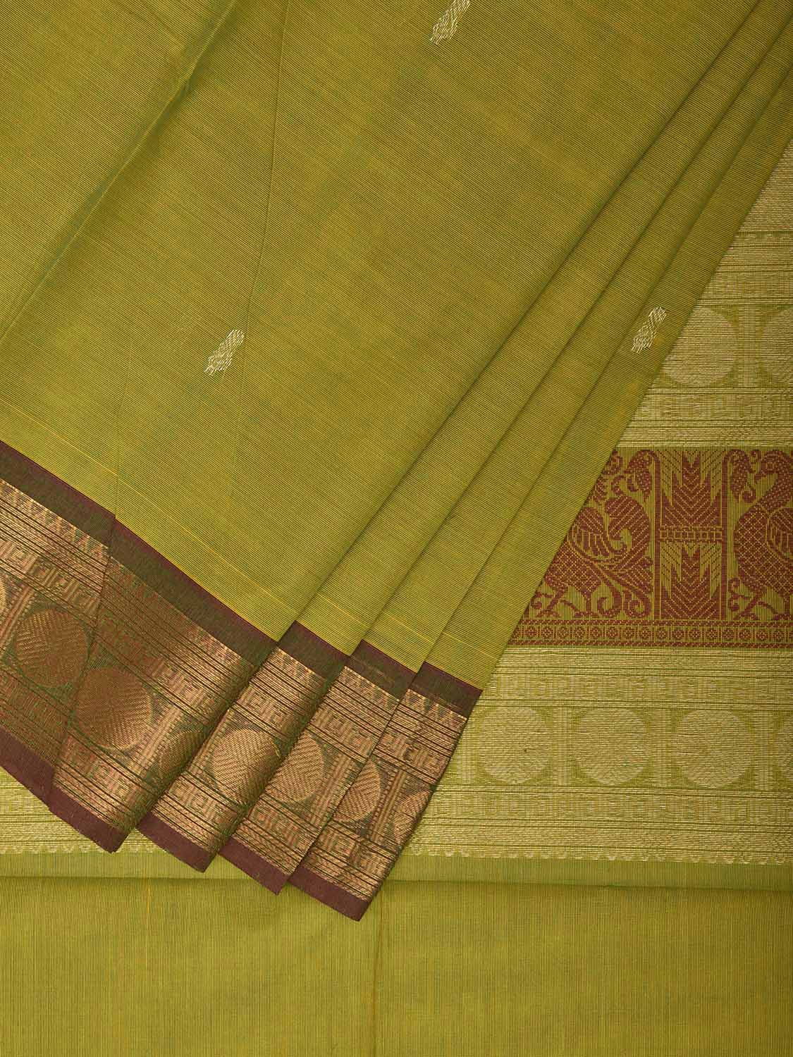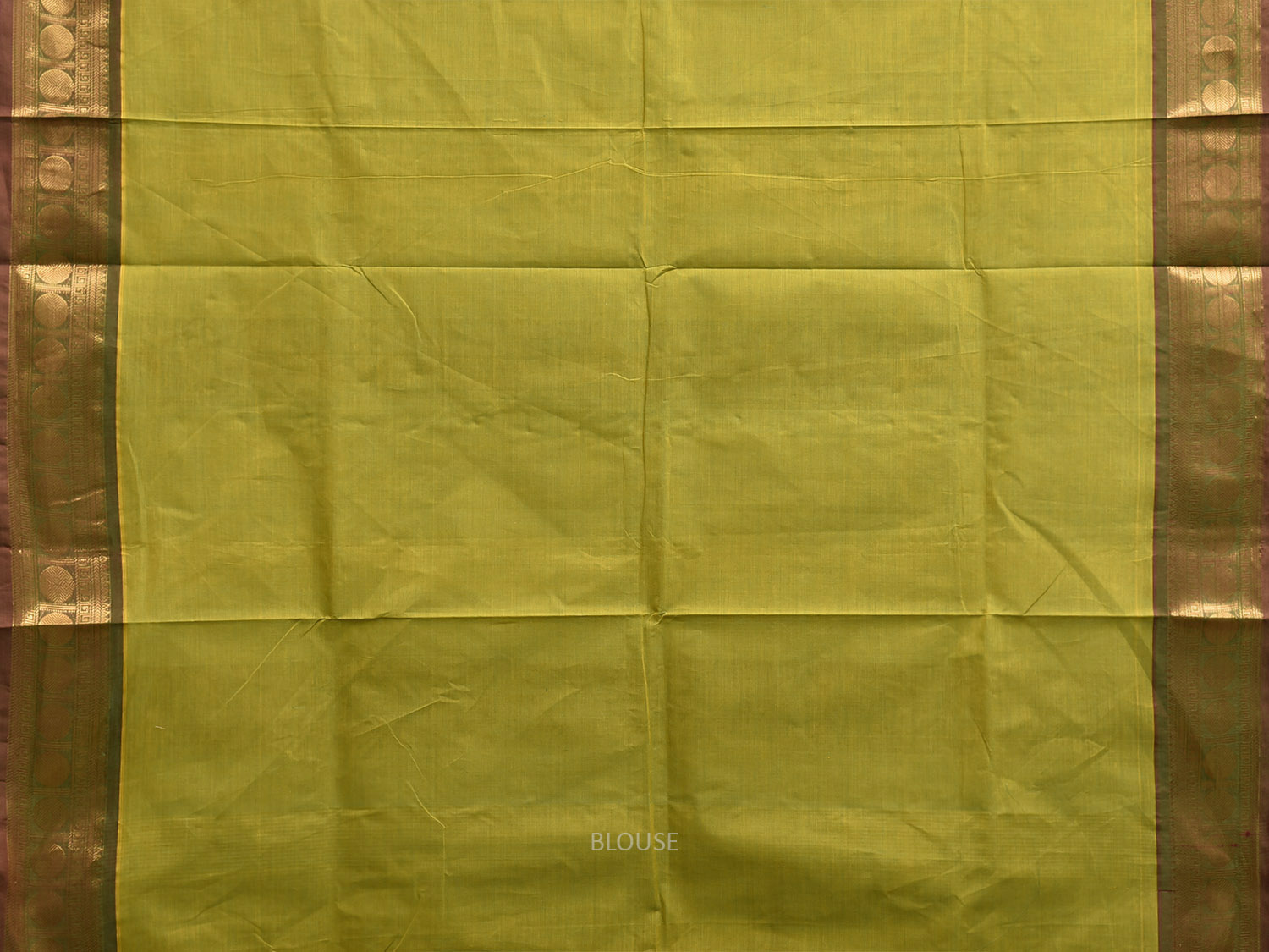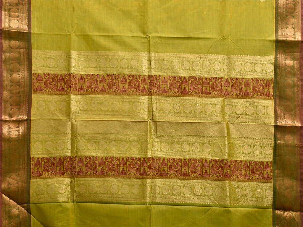 Green and Red Kanchipuram Cotton Saree with Pallu and Border Design. Traditional Simple South Indian Attire Saree for any Casual Occasions. As it’s a cotton saree we advice gentle handwash separately for fabric care.