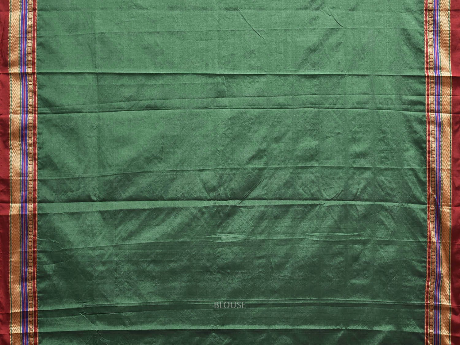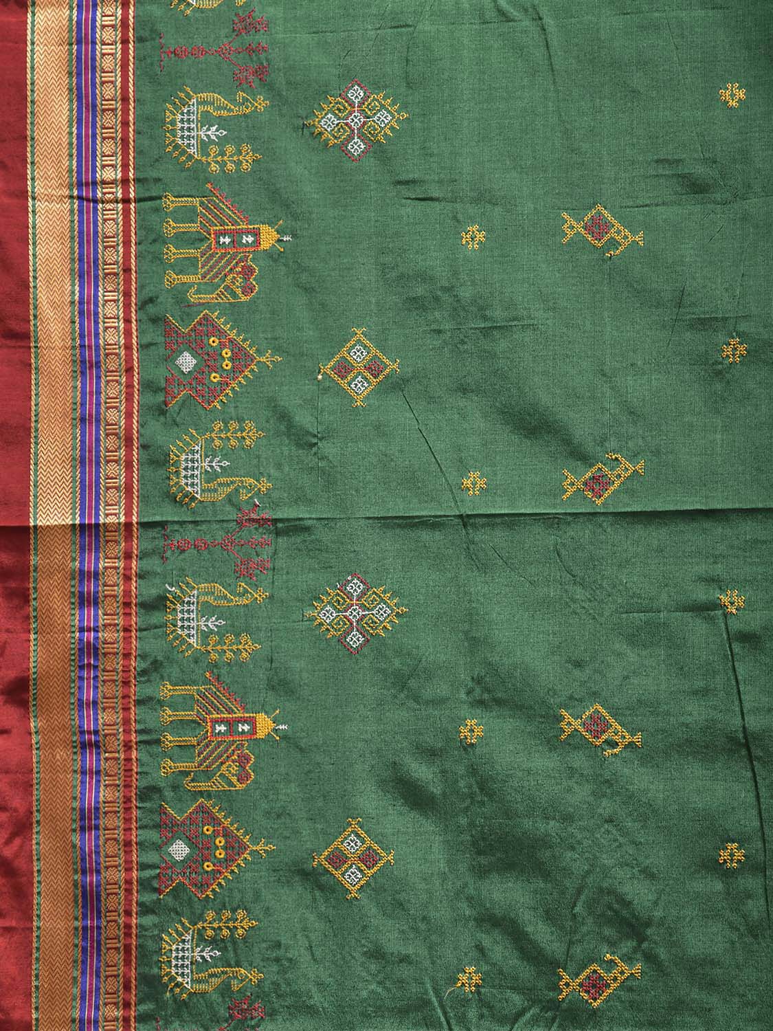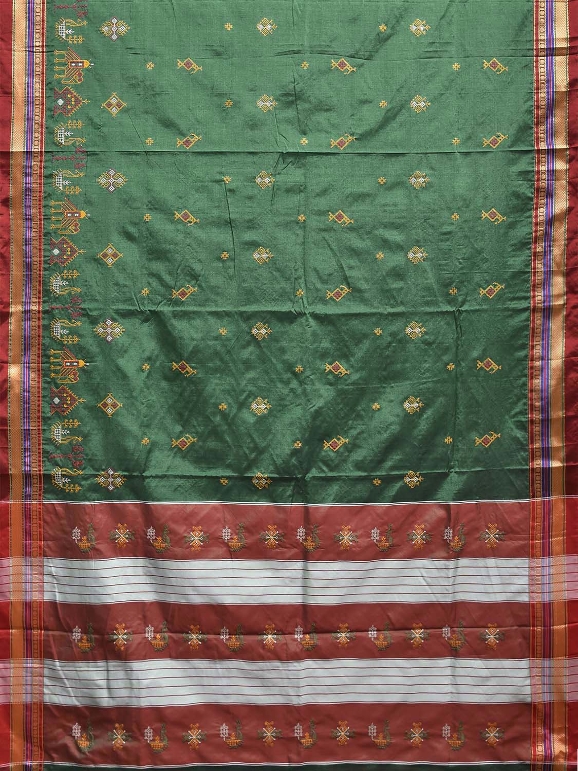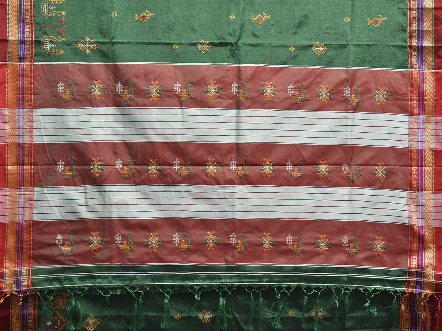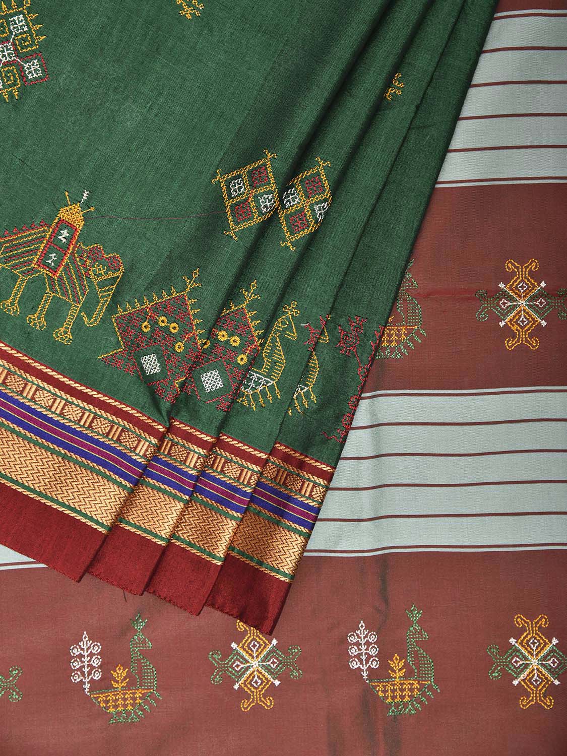 Green and Red Kasuti ilkal Cotton Viscose Saree with Buta and Elephant Border Design. For fabric care we advise gentle handwash separately.