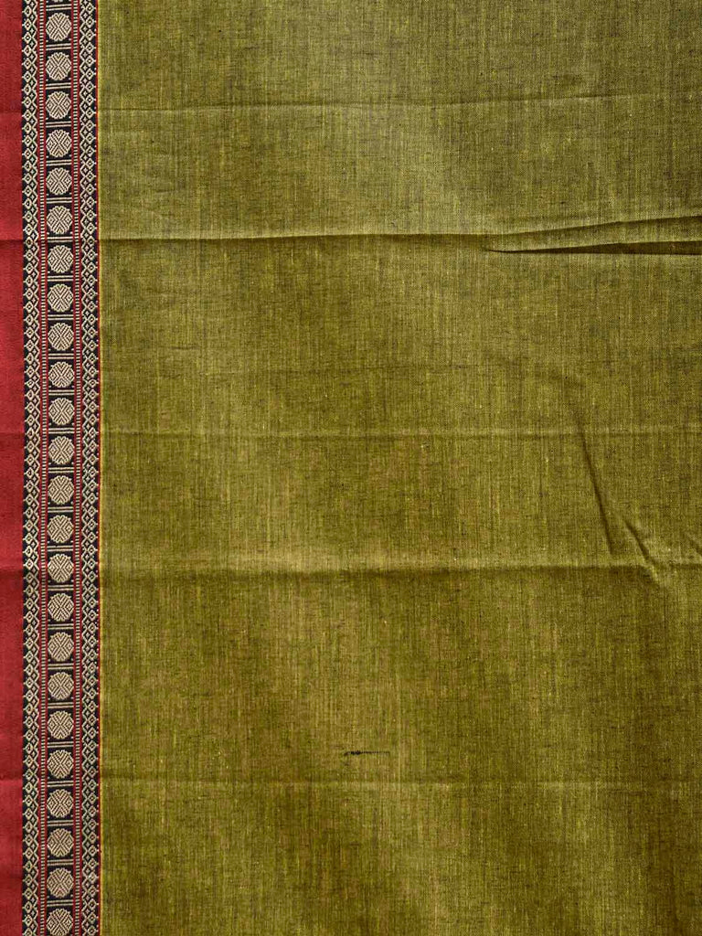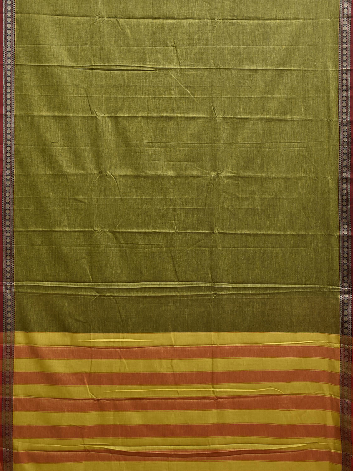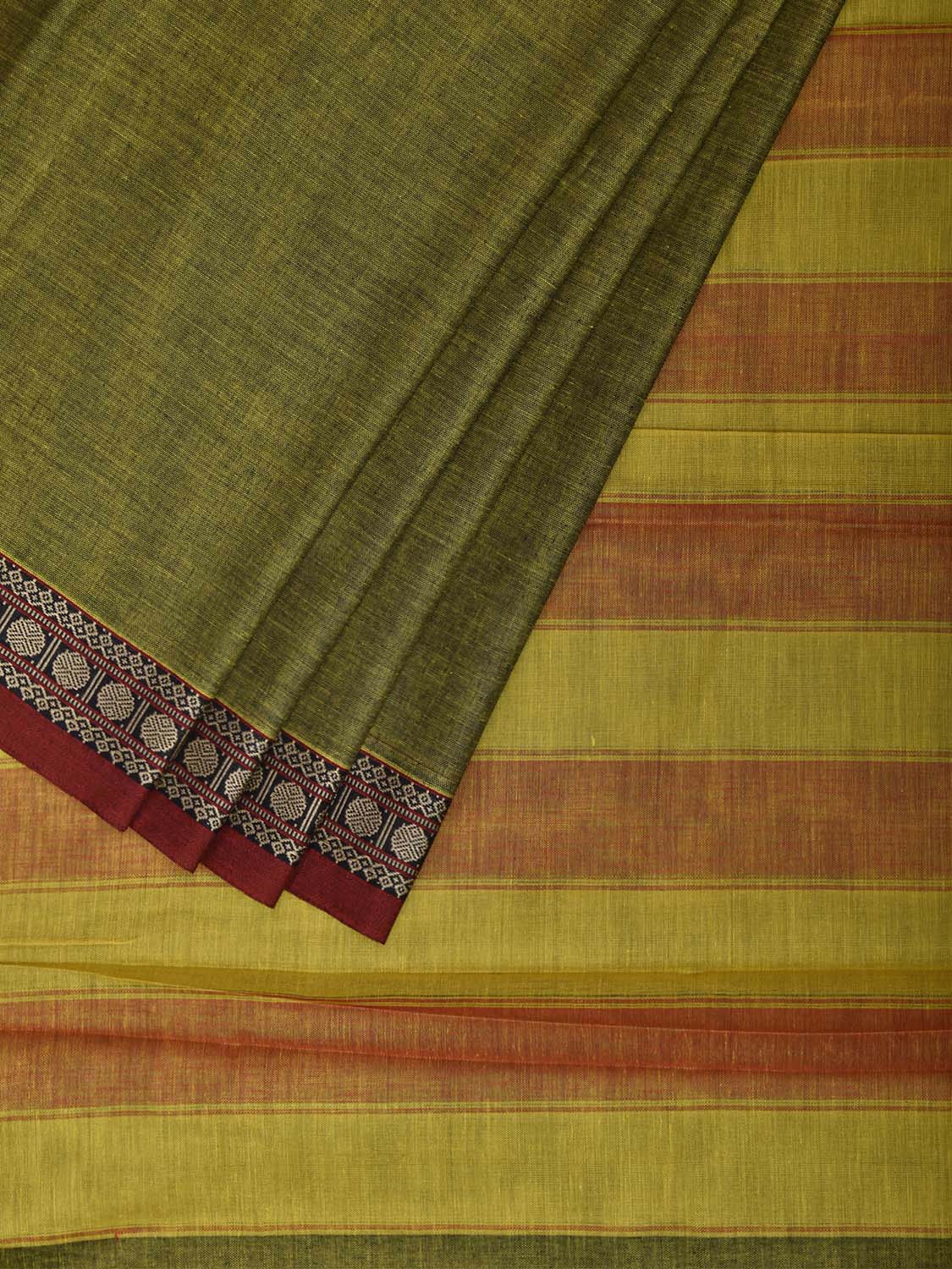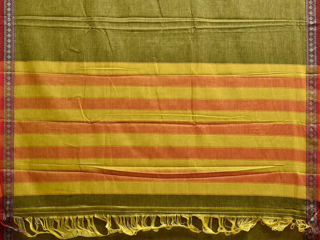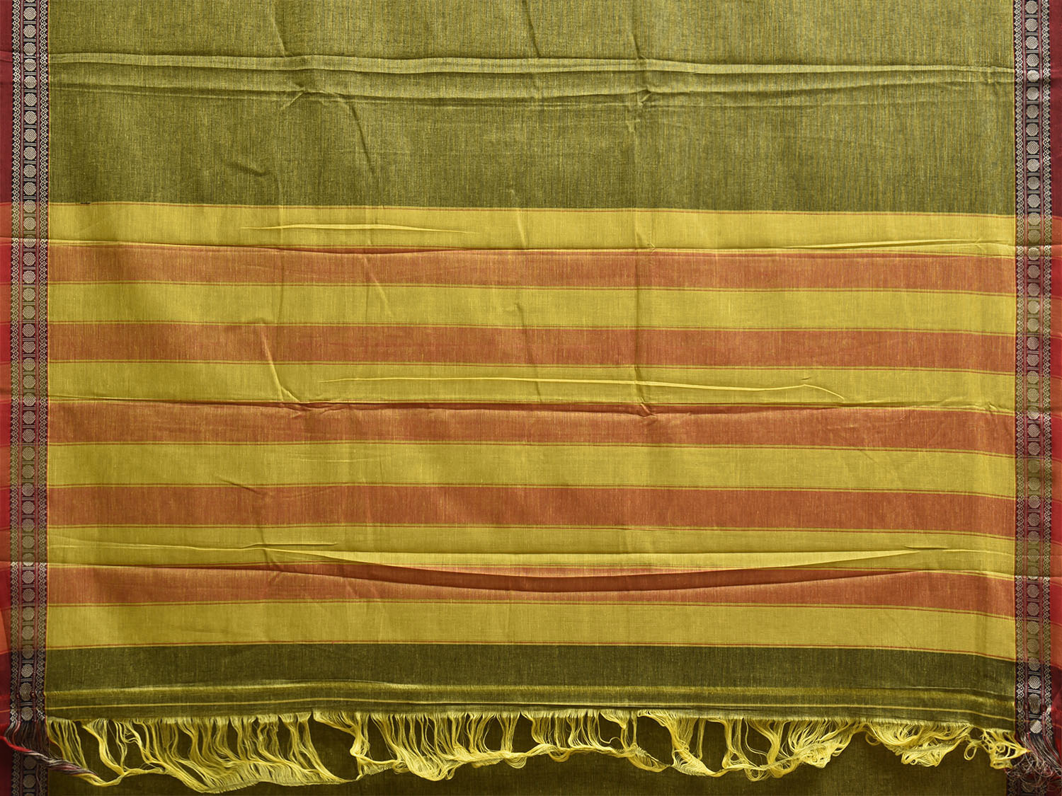 Green and Yellow Narayanpet Cotton Plain Saree with Strips Pallu Design No Blouse. This saree has no blouse.