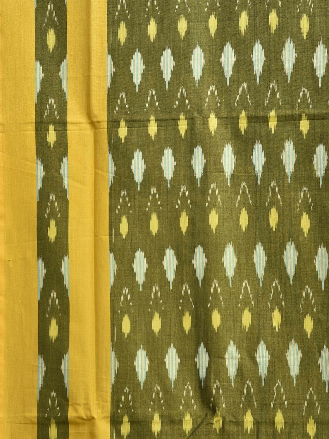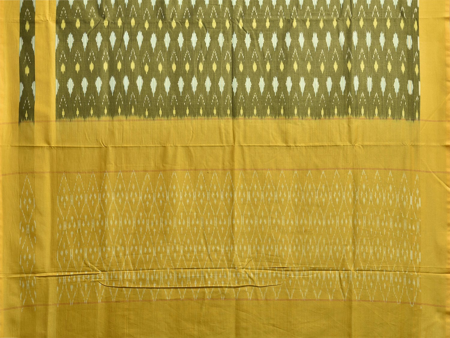 Green and Yellow Pochampally Ikat Cotton Handloom Saree with Grill Pallu Design No Blouse. This Handloom Saree from Andhra Pradesh has been woven using the resist-dyeing, which produces the unique patterns adorning the fabric. We advise gentle handwash separately for fabric care. This saree has no blouse.