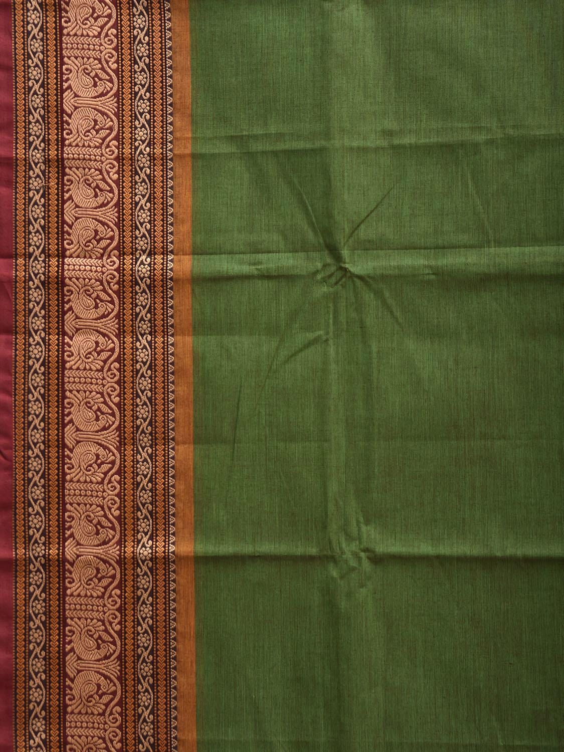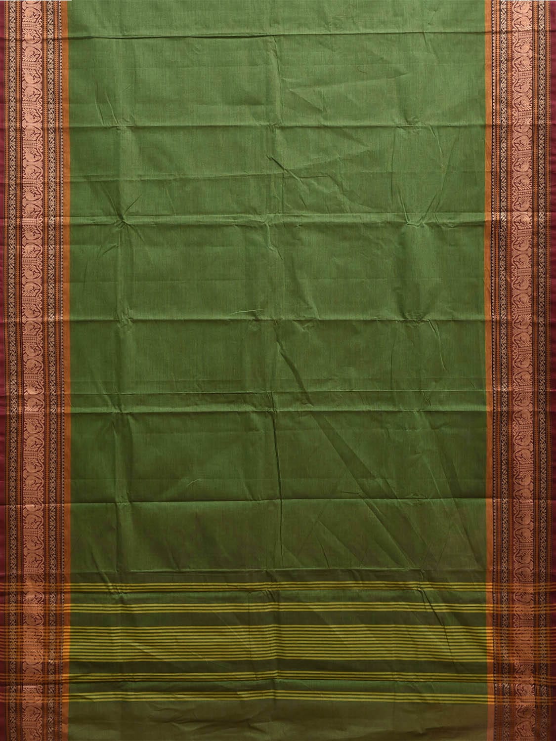 Green Kanchipuram Cotton Plain Saree with Strips Pallu and Border Design. Traditional Simple South Indian Attire Saree for any Casual Occasions. As it’s a cotton saree we advice gentle handwash separately for fabric care.
