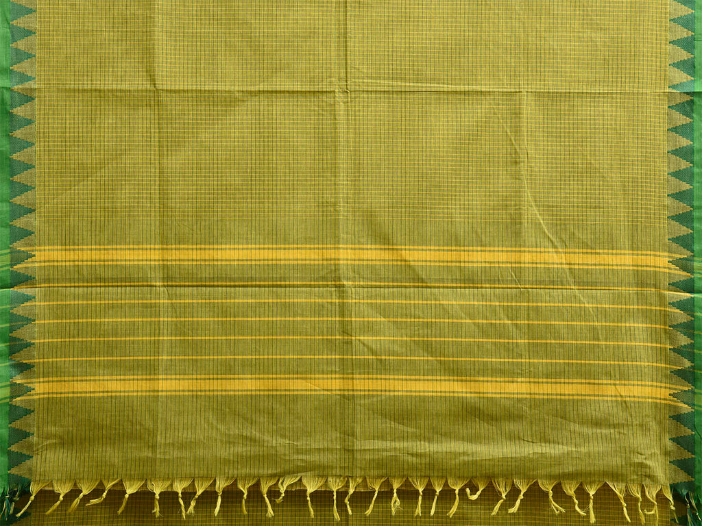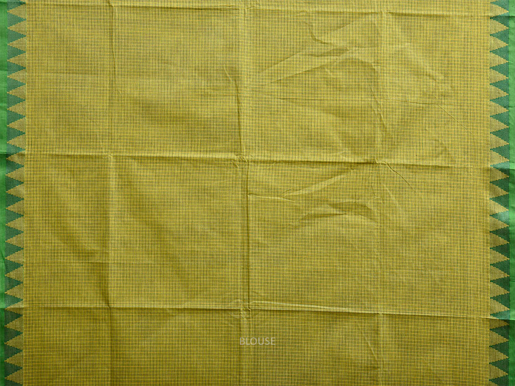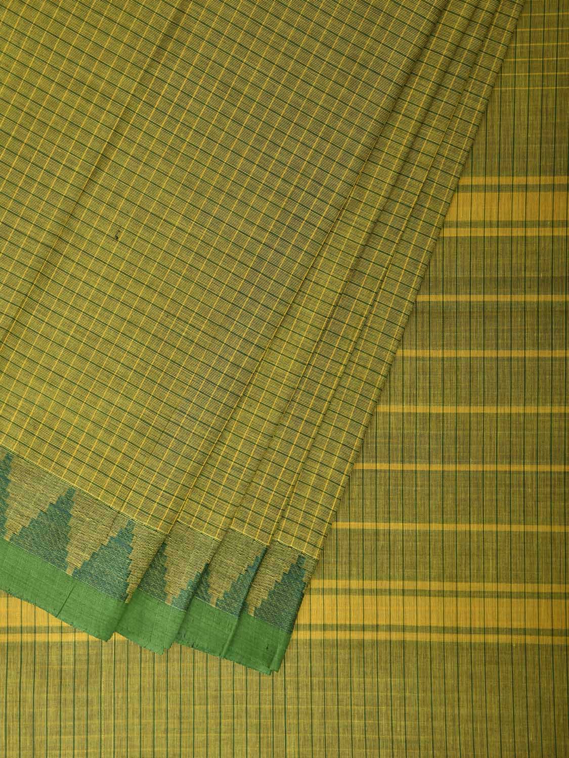 Green Venkatagiri Cotton Saree with Checks and Temple Border Design No Blouse. For fabric care we advise gentle handwash separately. This saree has no blouse.