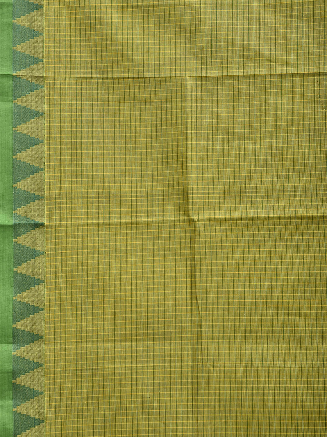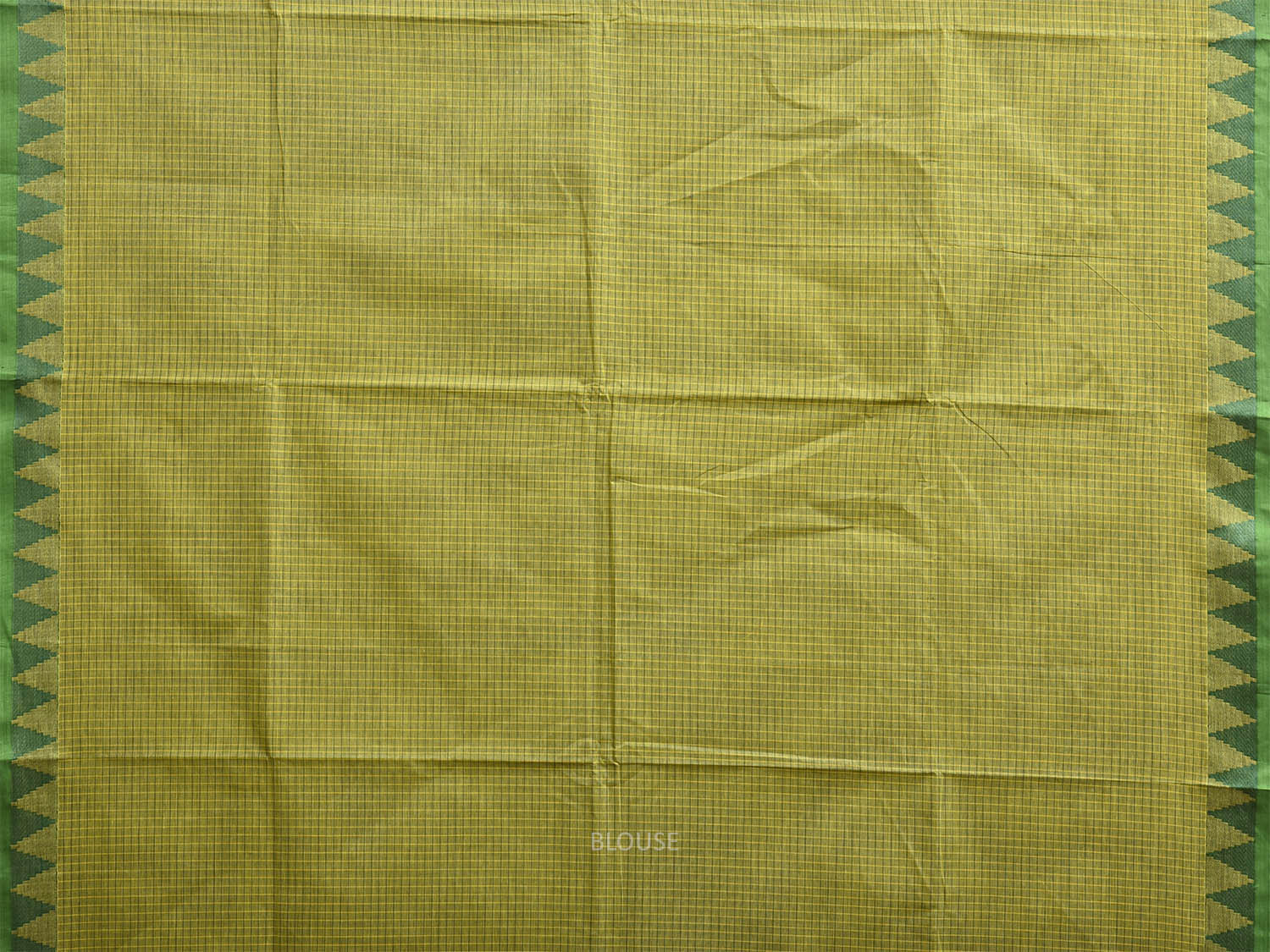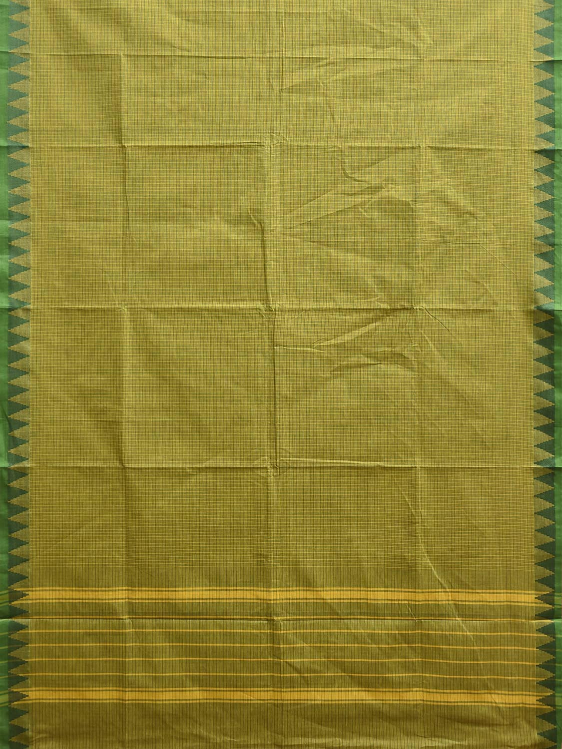 Green Venkatagiri Cotton Saree with Checks and Temple Border Design No Blouse. For fabric care we advise gentle handwash separately. This saree has no blouse.