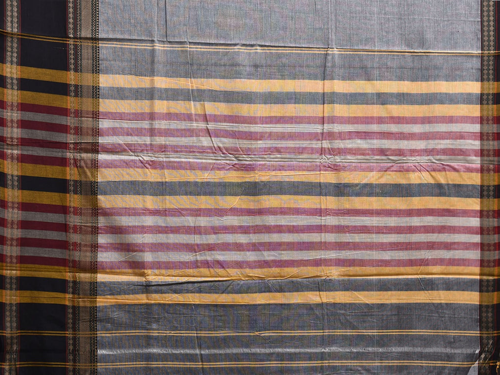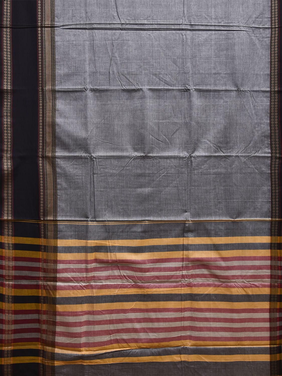 Grey and Black Kanchipuram Cotton Plain Saree with Strips Pallu and Bog Border Design. Traditional Simple South Indian Attire Saree for any Casual Occasions. As it’s a cotton saree we advice gentle handwash separately for fabric care. This saree has no blouse.