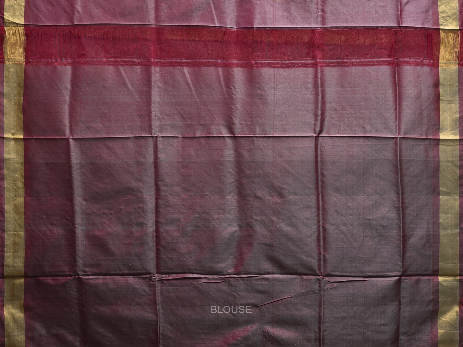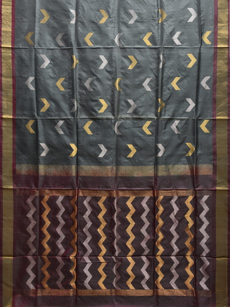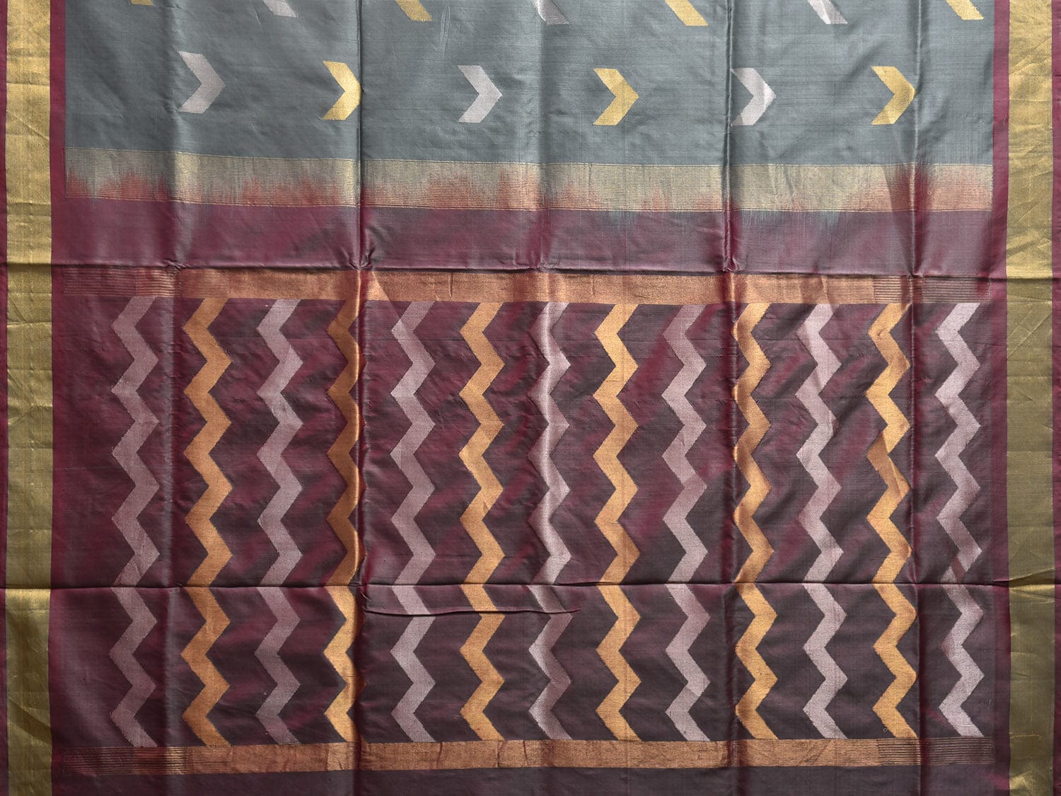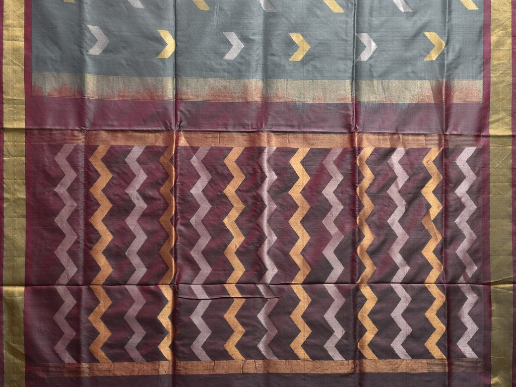 Grey and Burgundy Uppada Silk Handloom Saree with Body Buta and Zig-Zag Pallu Design. Uppada sarees are known for light weight sarees with jamdani weaving technique. With so many traditional designs it is considered for the very special occasion wear. We advice dry clean for fabric care.