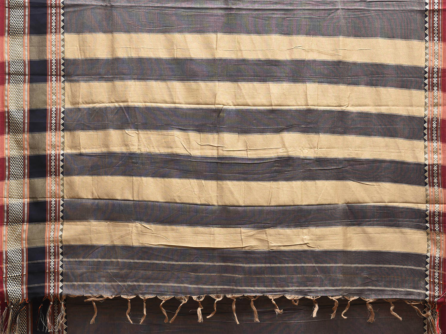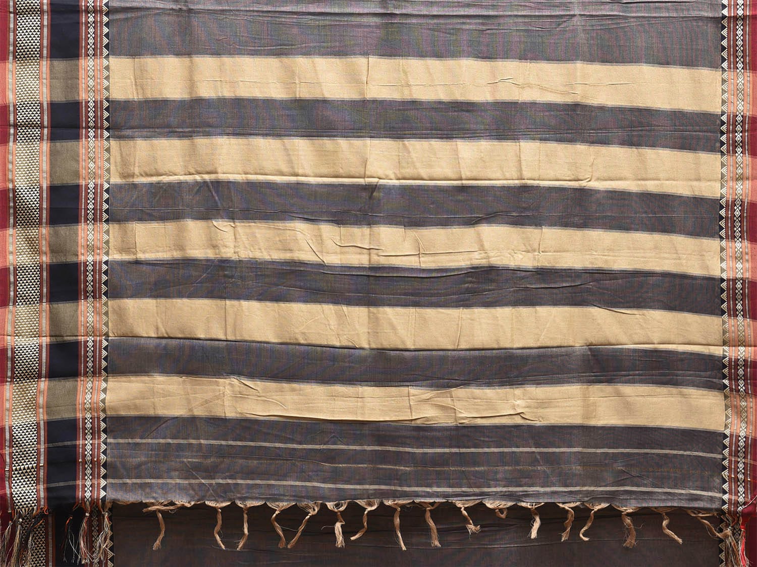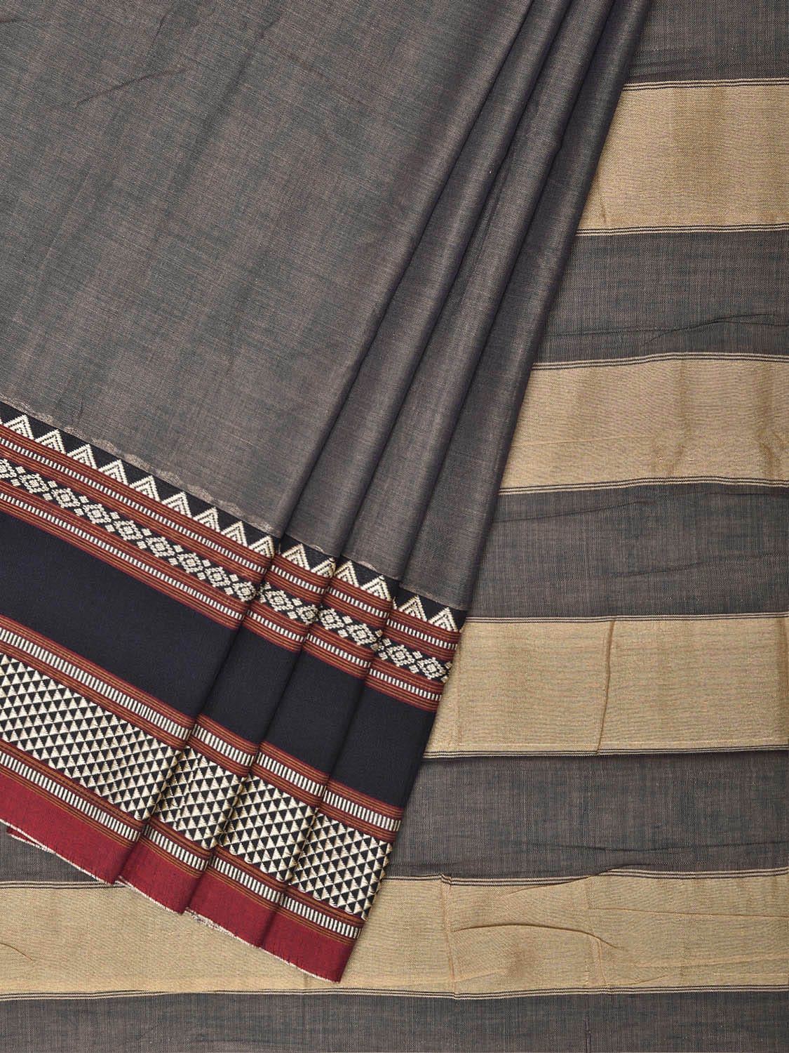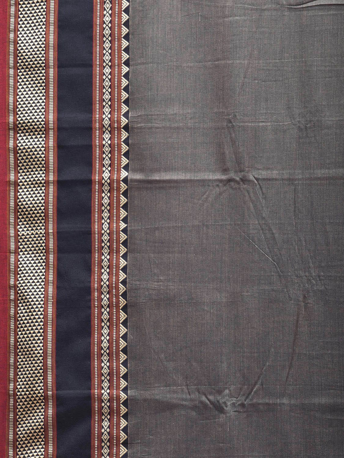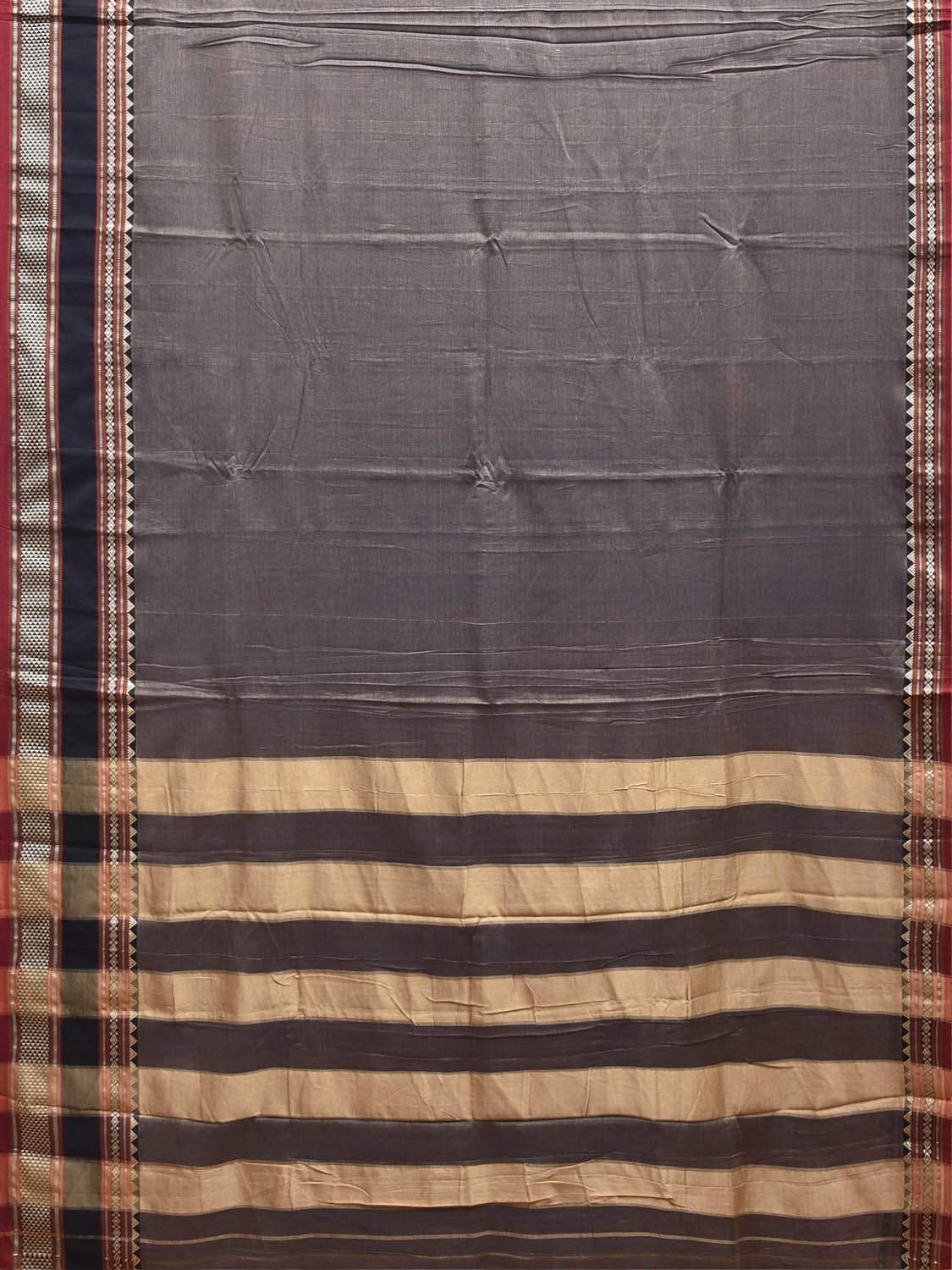 Grey and Cream Kanchipuram Cotton Plain Saree with Strips Pallu and Border Design No Blouse. Traditional South Indian Attire Saree for any Special Occasions. For fabric care we advice dry clean. This saree has no blouse.