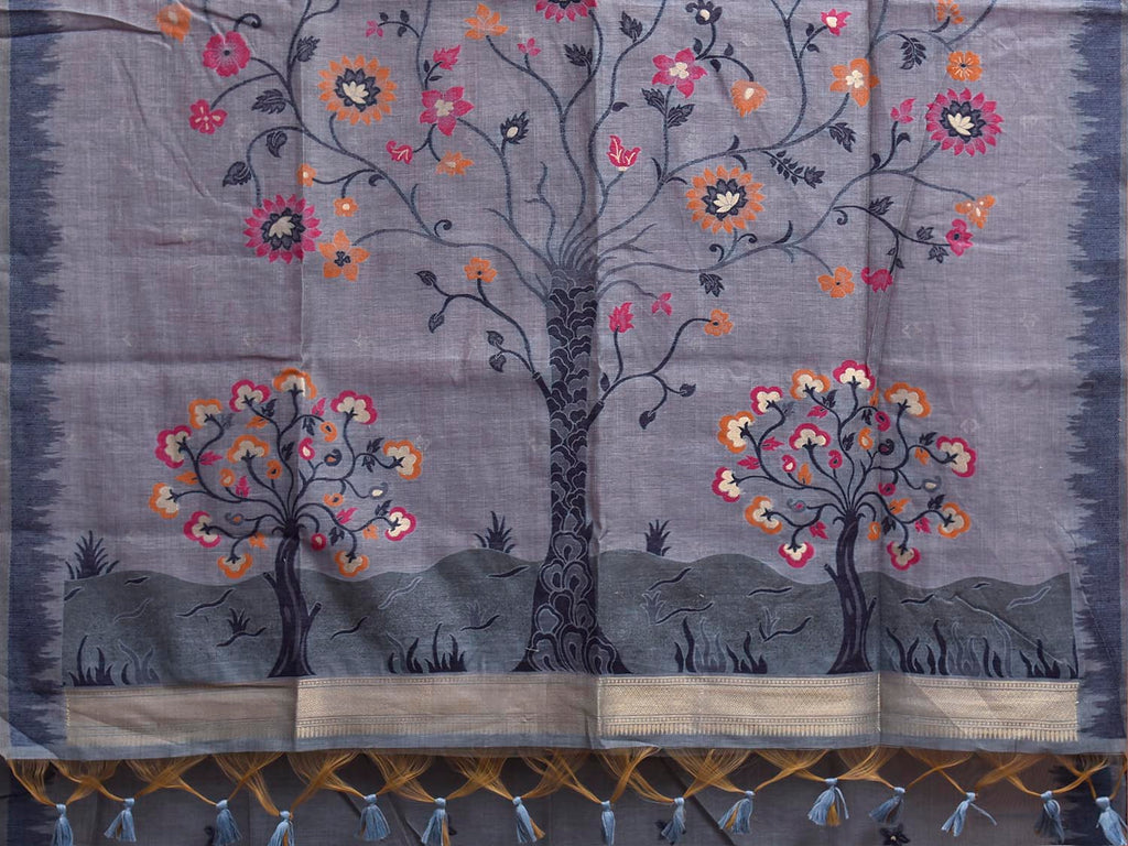 Grey Dhakai Jamdani Cotton Viscose Saree with Tree Pallu Design. These are some of the traditional Dhakai Jamdani designs, these sarees have geometric designs and sometimes floral or combination of both. We advice gentle handwash separately for fabric care.