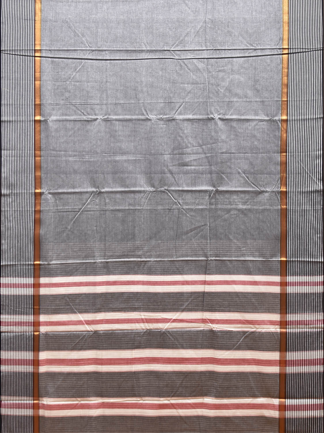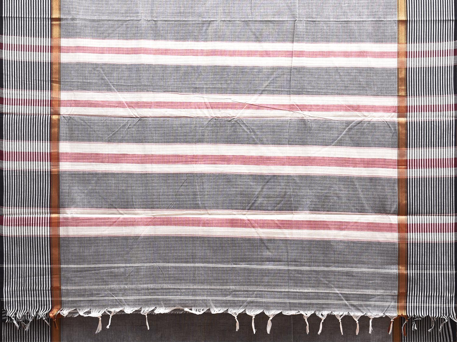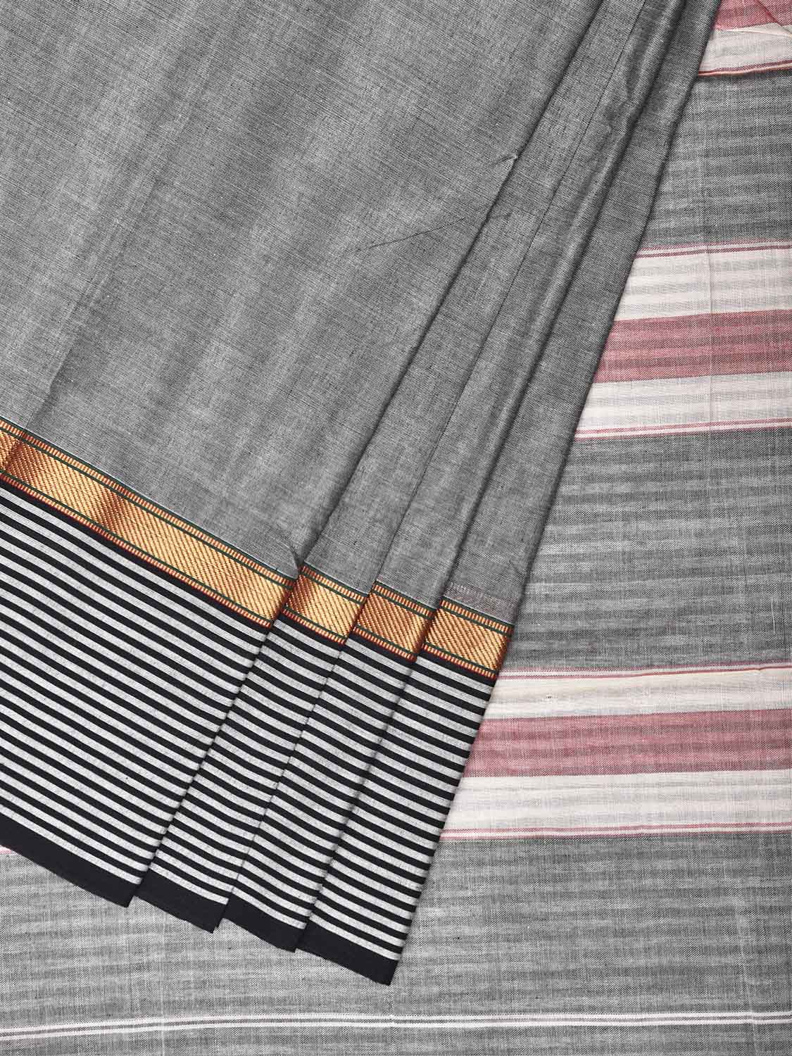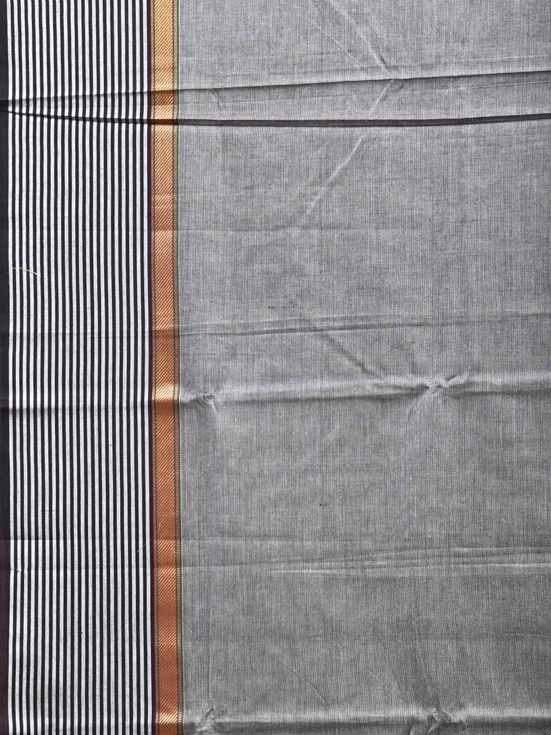 Grey Kanchipuram Cotton Plain Saree with Strips Border Design No Blouse. Traditional South Indian Attire Saree for any Special Occasions. For fabric care we advice dry clean. This saree has no blouse.