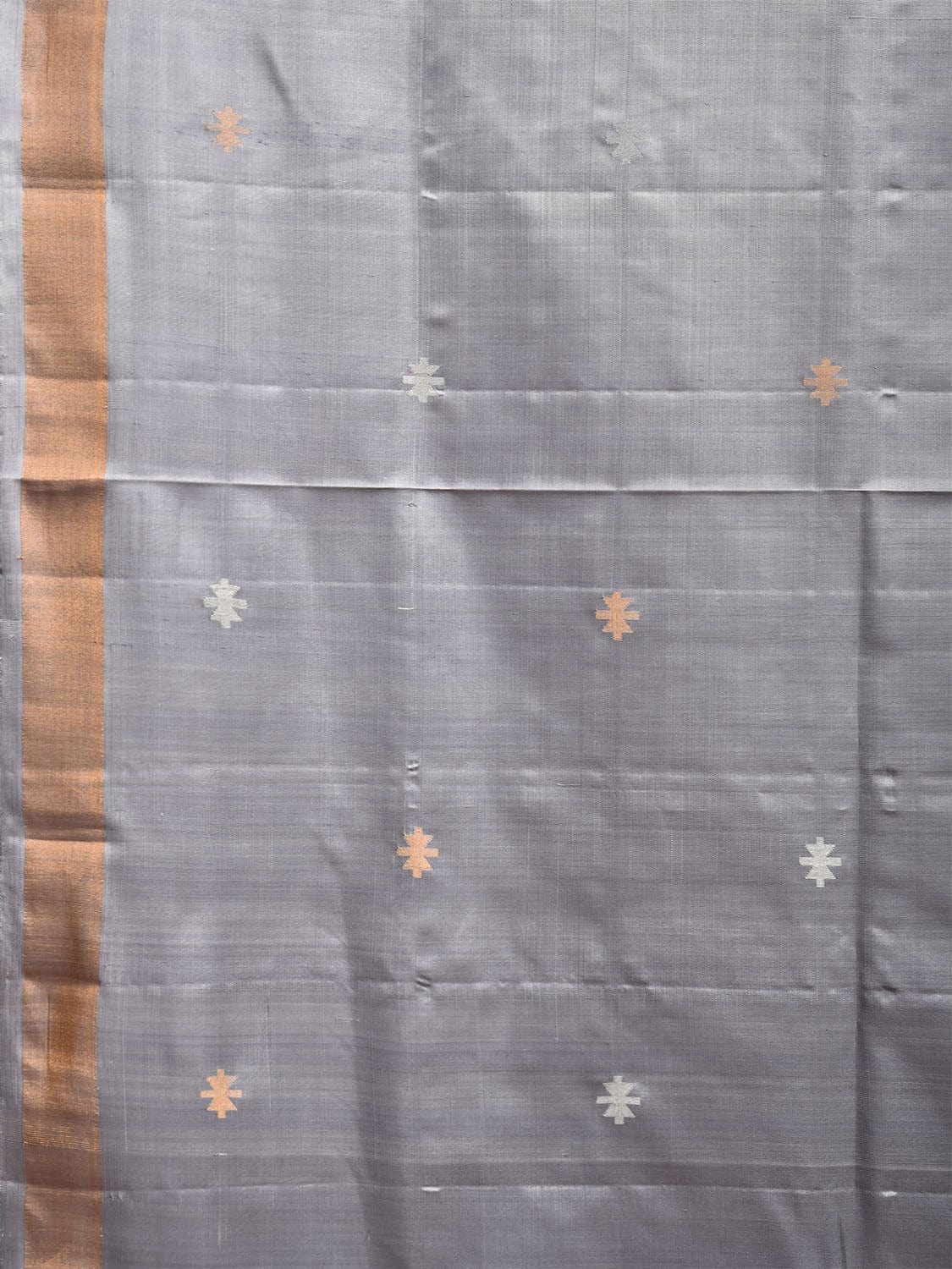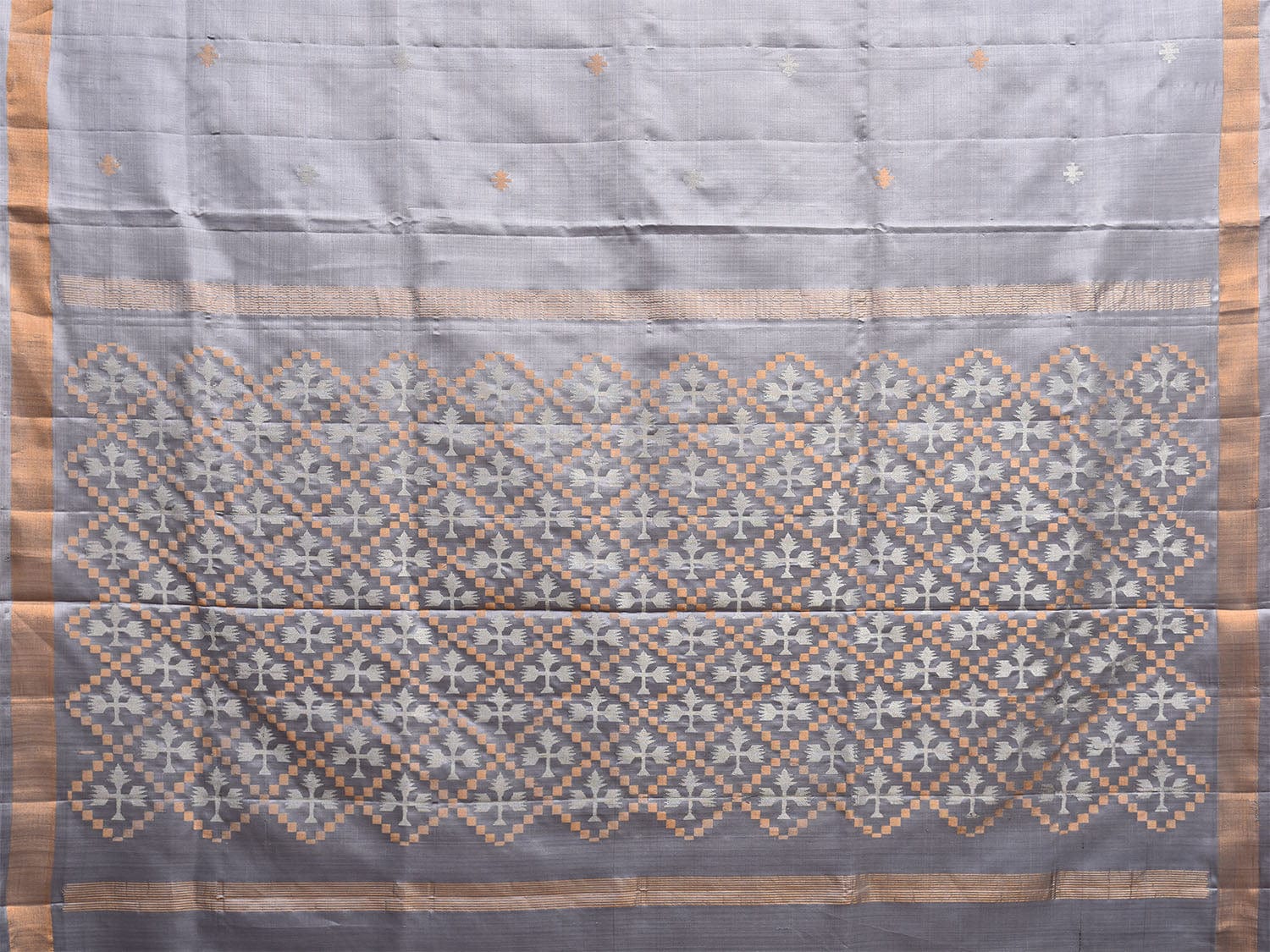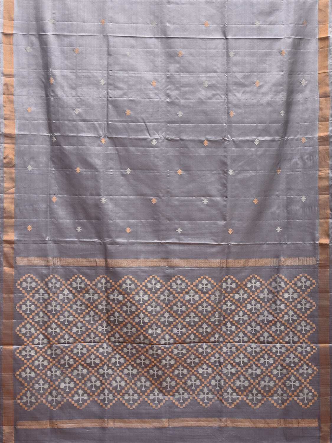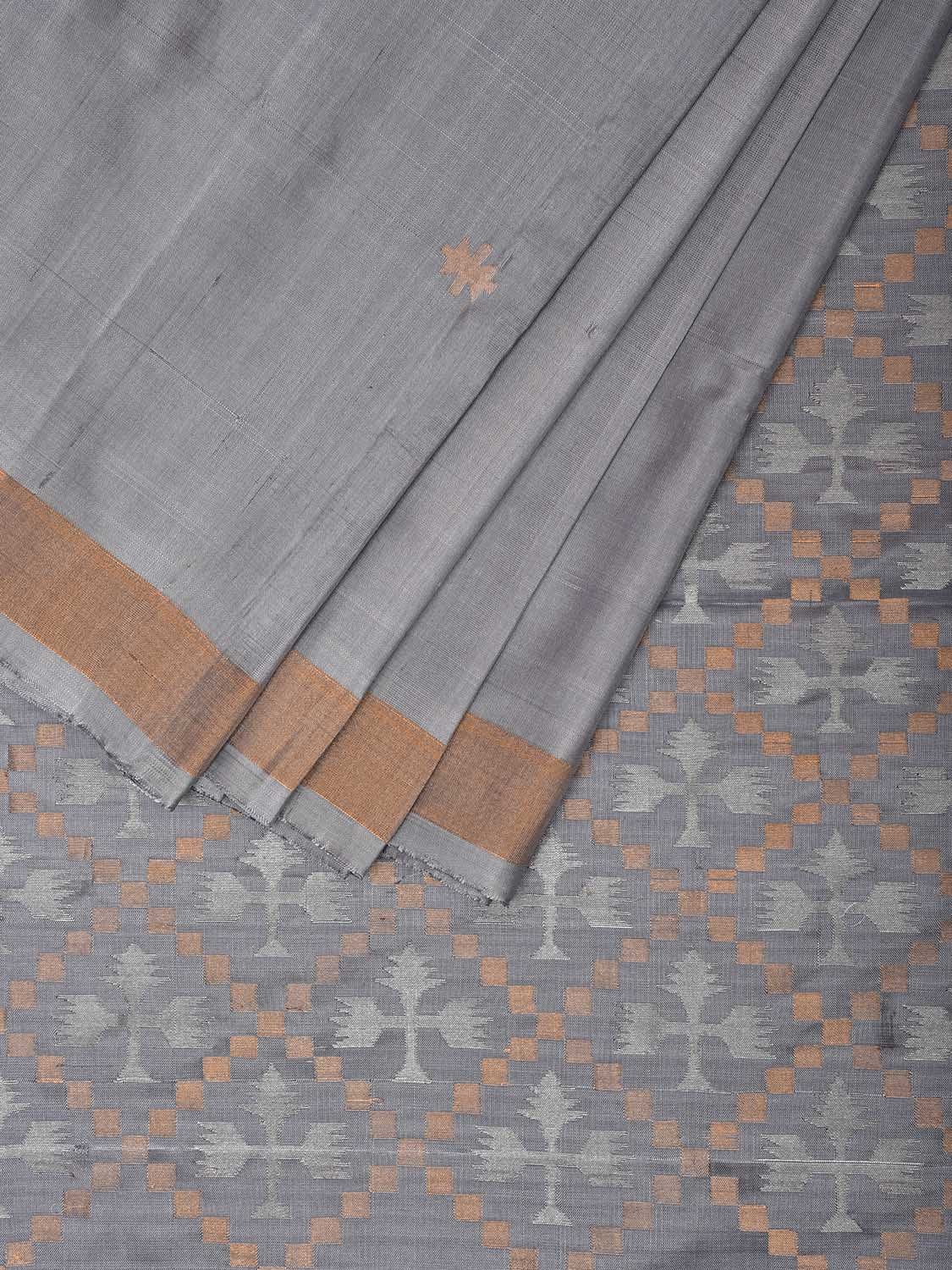 Grey Uppada Silk Handloom Saree with Jamdani Pallu Design. Uppada sarees are known for light weight sarees with jamdani weaving technique. With so many traditional designs it is considered for the very special occasion wear. We advice dry clean for fabric care.