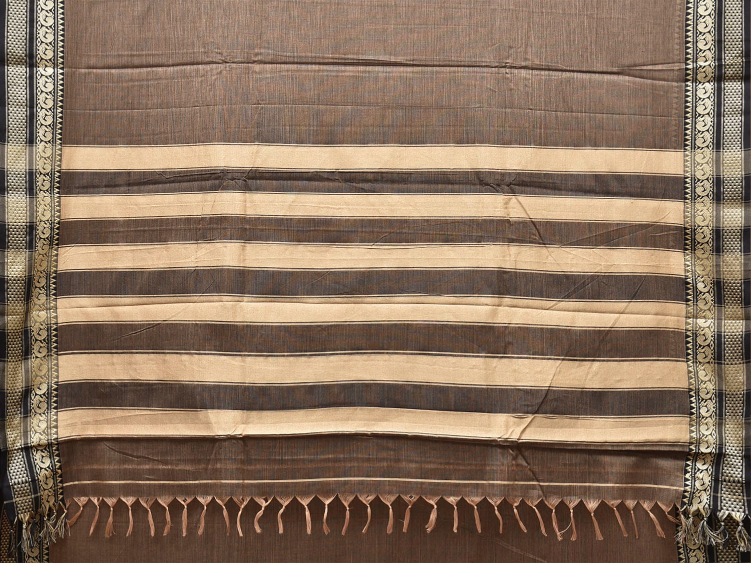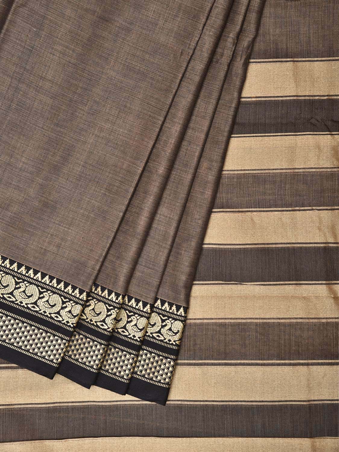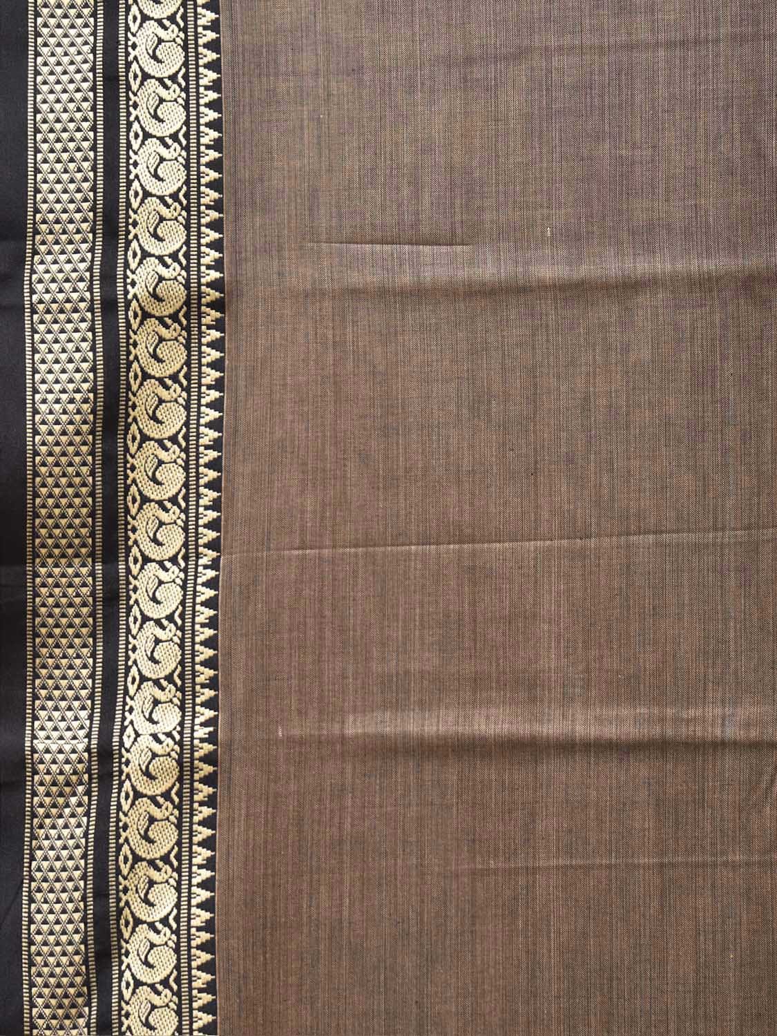 Khaki and Black Narayanpet Cotton Plain Saree with Strips Pallu and Border Design No Blouse. This saree has no blouse.