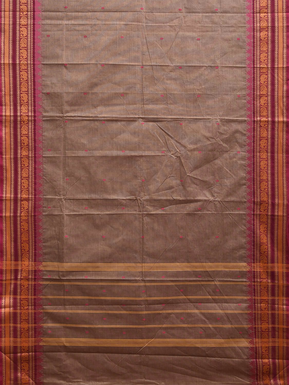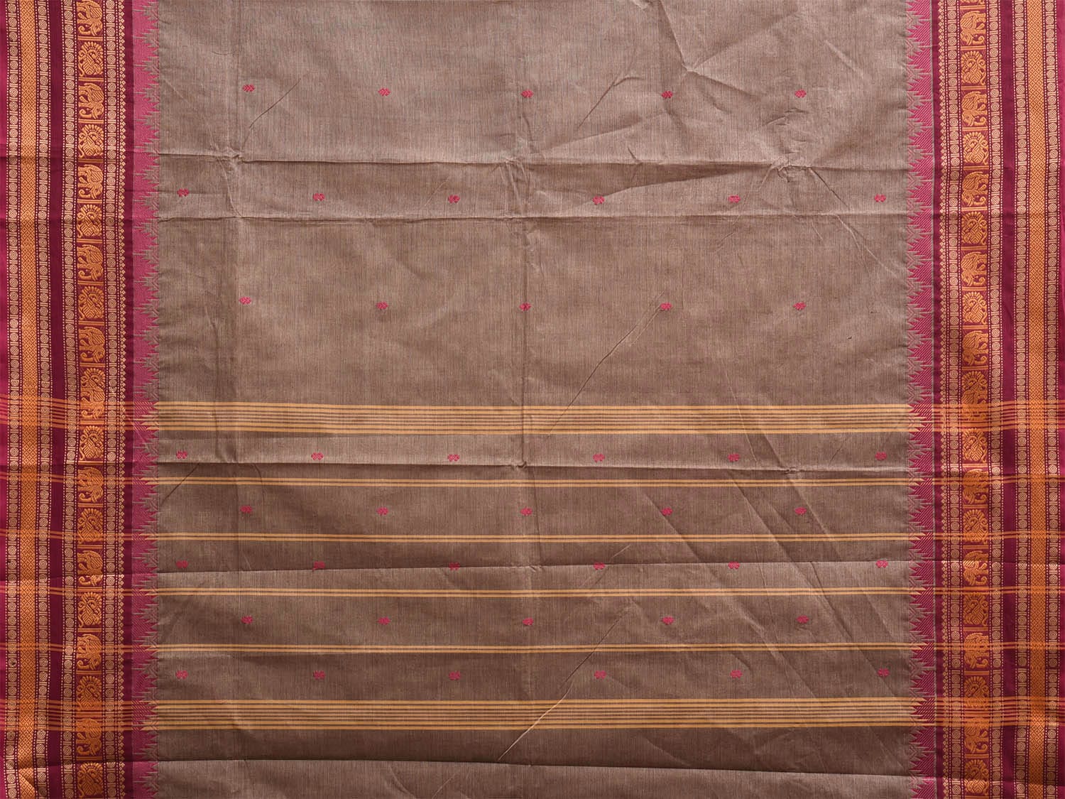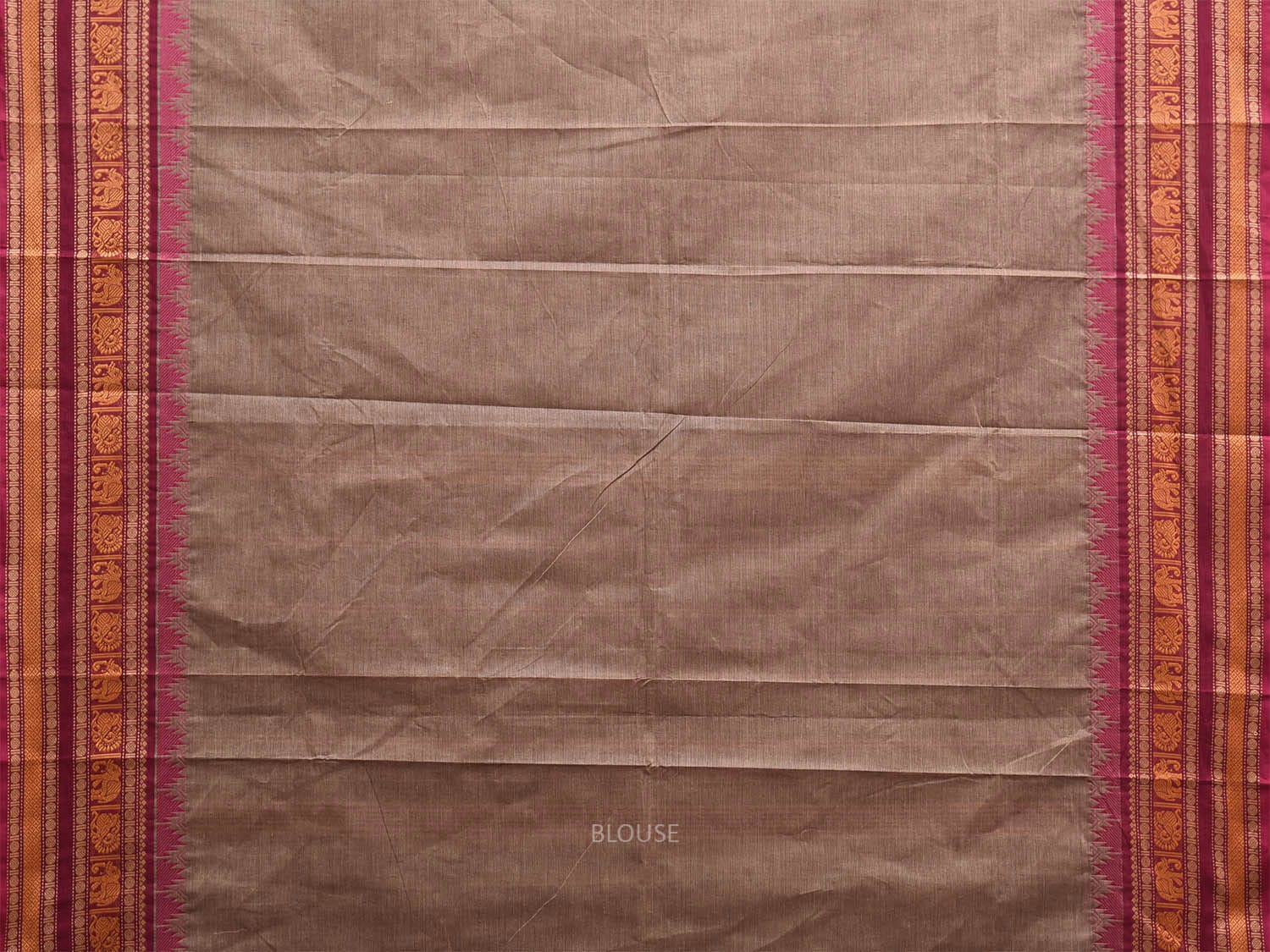 Khaki and Pink Kanchipuram Cotton Saree with Strips Pallu Border Design. Traditional Simple South Indian Attire Saree for any Casual Occasions. As it’s a cotton saree we advice gentle handwash separately for fabric care.