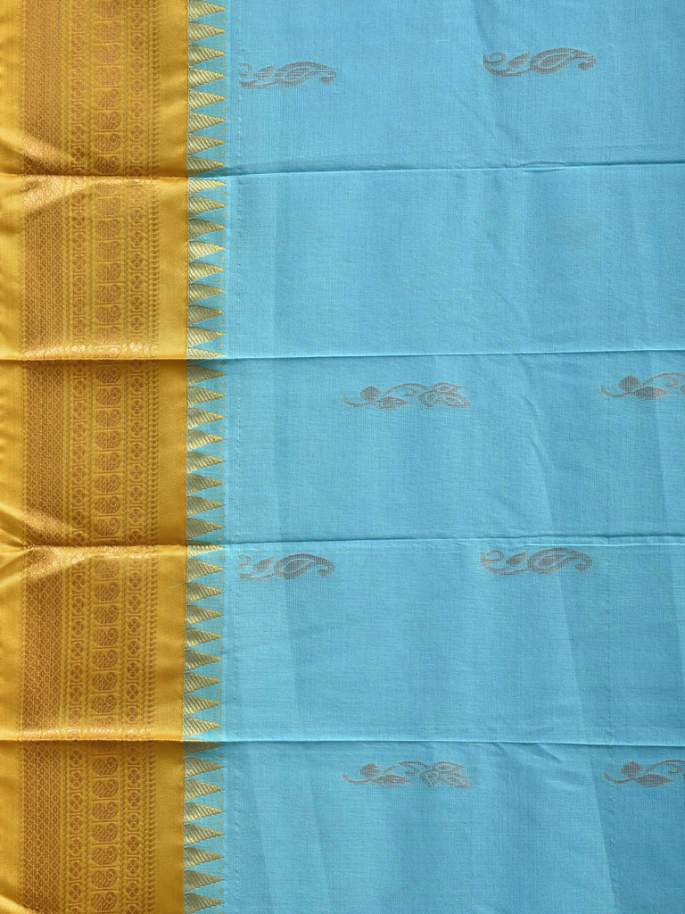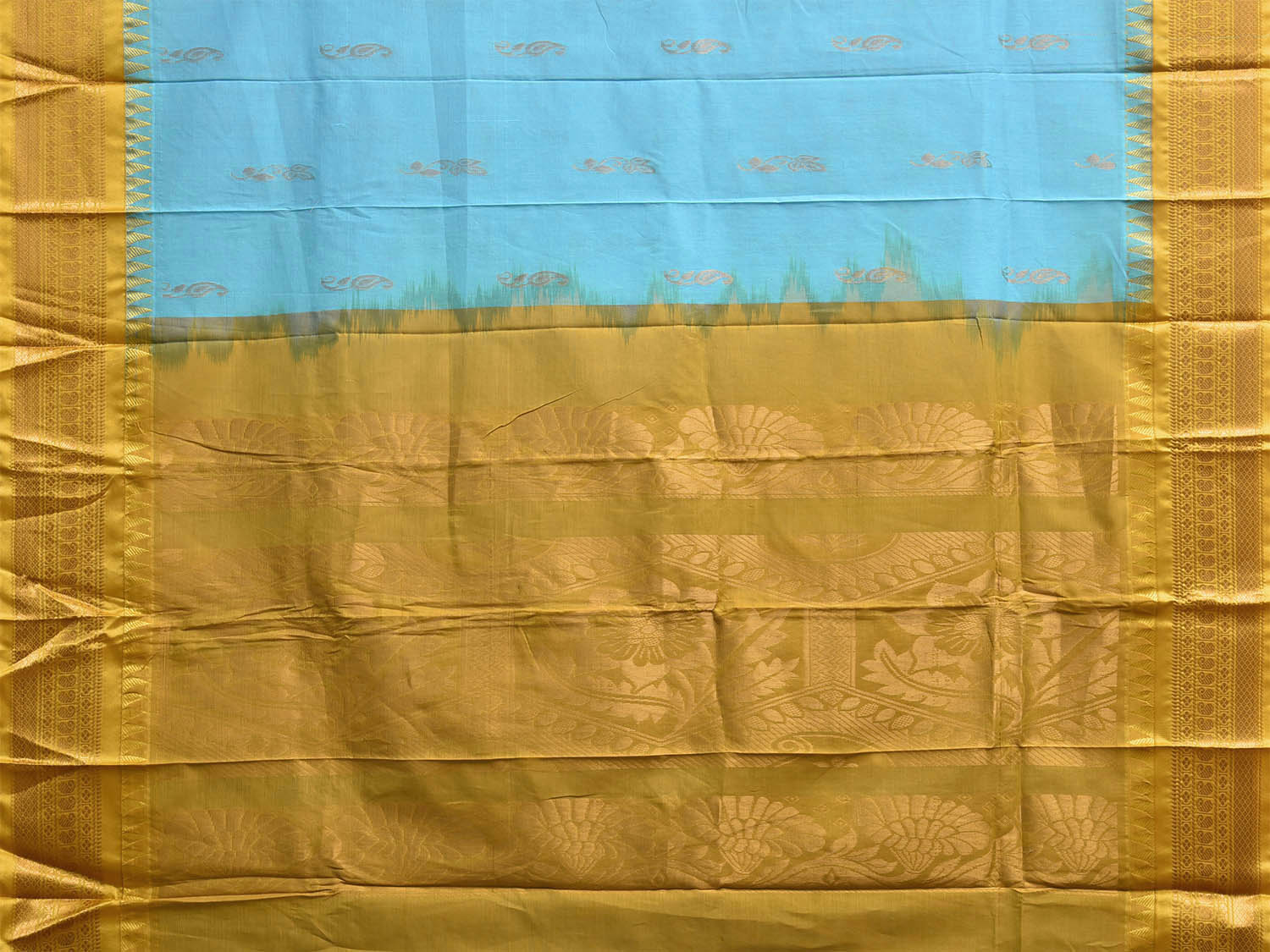 Light Blue and Olive Gadwal Cotton Body Viscose Border Saree with Pallu Design No Blouse. Gadwal Sarees are known for their traditional design of border and pallu made of silk and body being either cotton or silk. They are known as Sico sarees for border and pallu being silk and body being cotton. We advice dry clean for fabric care. This saree has no blouse.