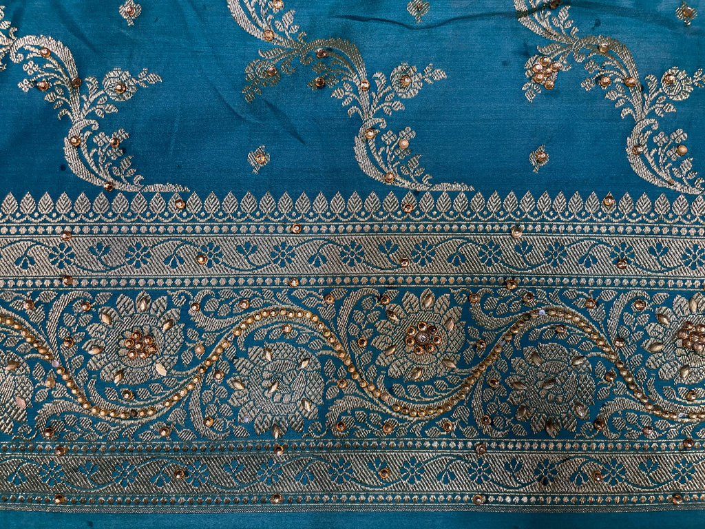 Drape yourself in timeless elegance with this exquisite emerald green Banarasi silk saree, adorned with delicate silver zari motifs throughout the body. The saree features an intricately woven floral and paisley border, complemented by a regal pallu with detailed brocade craftsmanship that reflects the rich heritage of Banaras.Perfect for weddings, festive occasions, and grand celebrations, this saree brings together tradition and luxury in every drape. The lustrous silk fabric adds a graceful fall and sheen, while the silver zari creates a stunning contrast that enhances its royal charm.