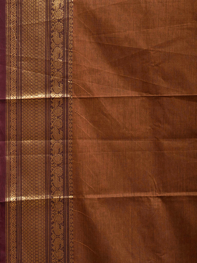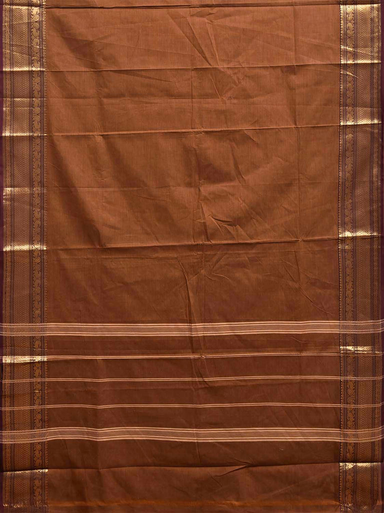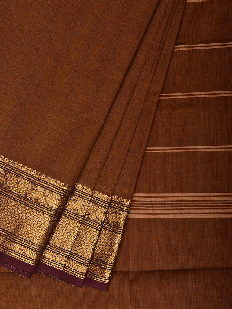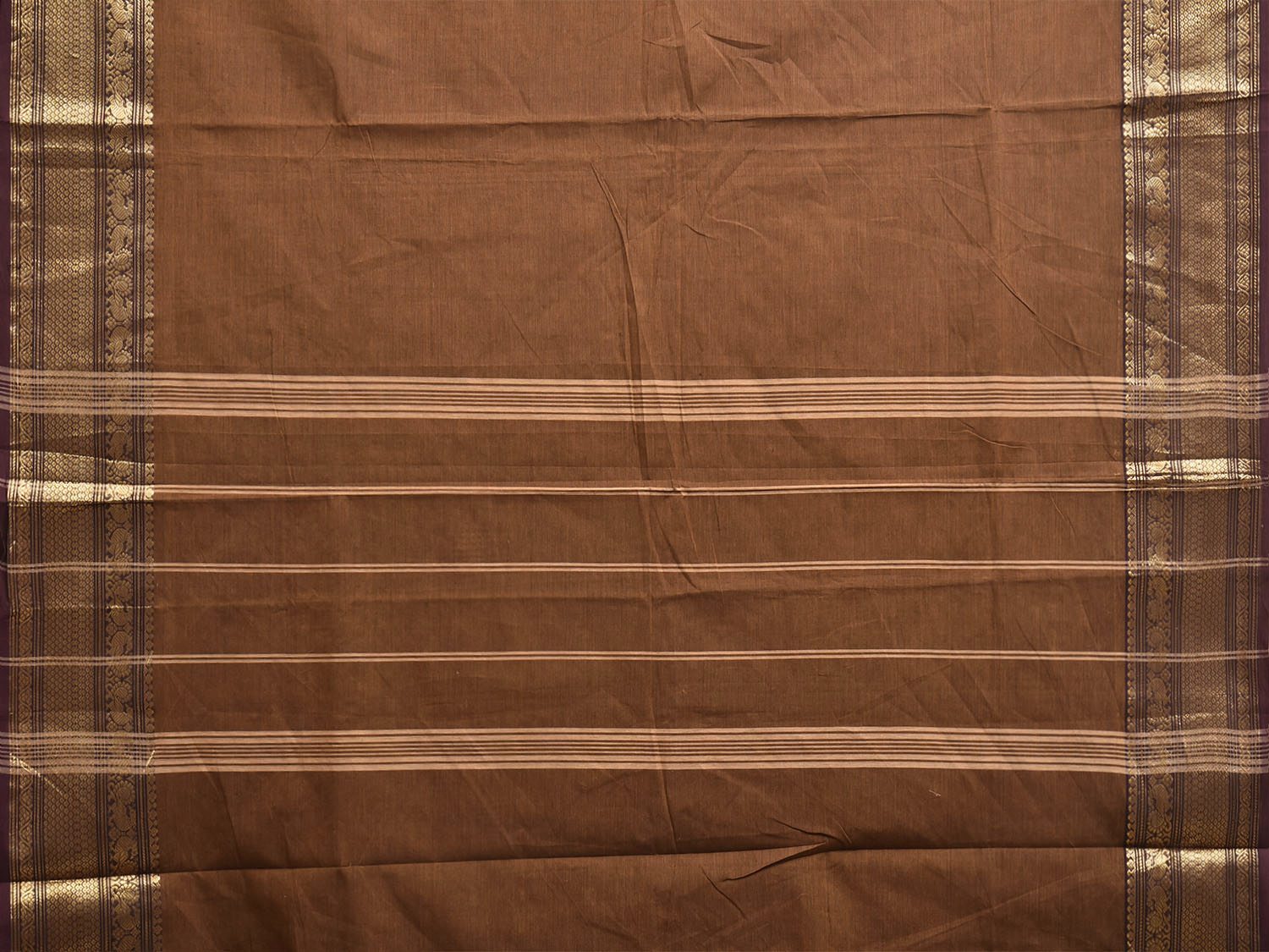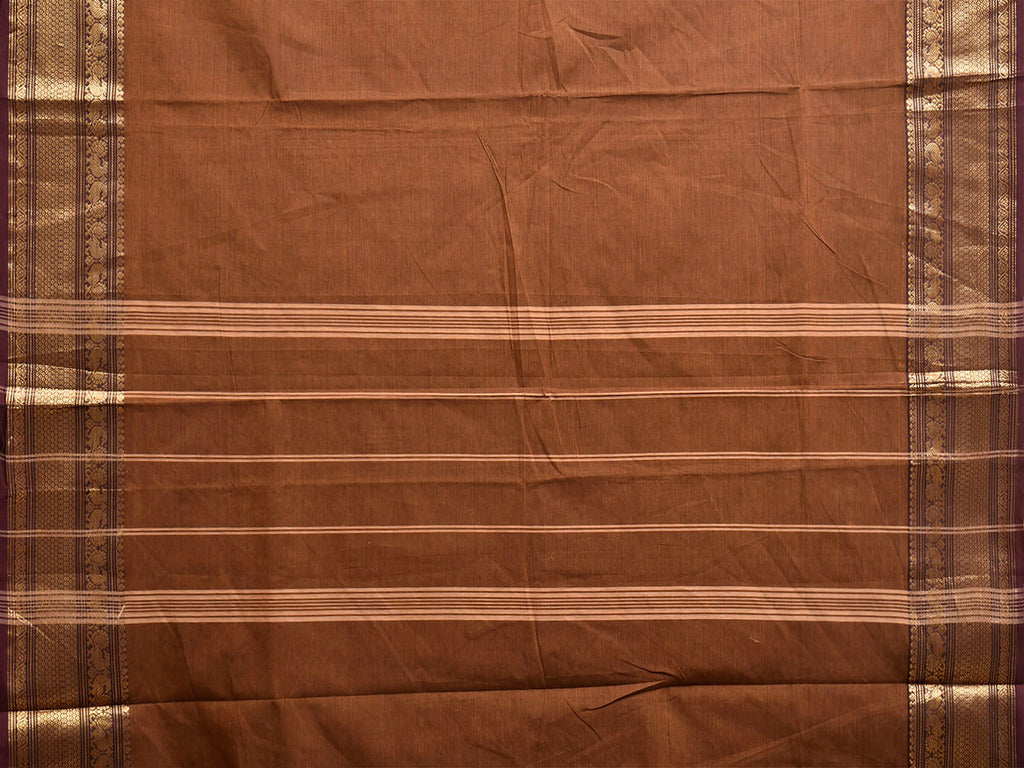 Light Brown Kanchipuram Cotton Plain Saree with Strips Pallu and Border Design. Traditional Simple South Indian Attire Saree for any Casual Occasions. As it’s a cotton saree we advice gentle handwash separately for fabric care. This saree has no blouse.