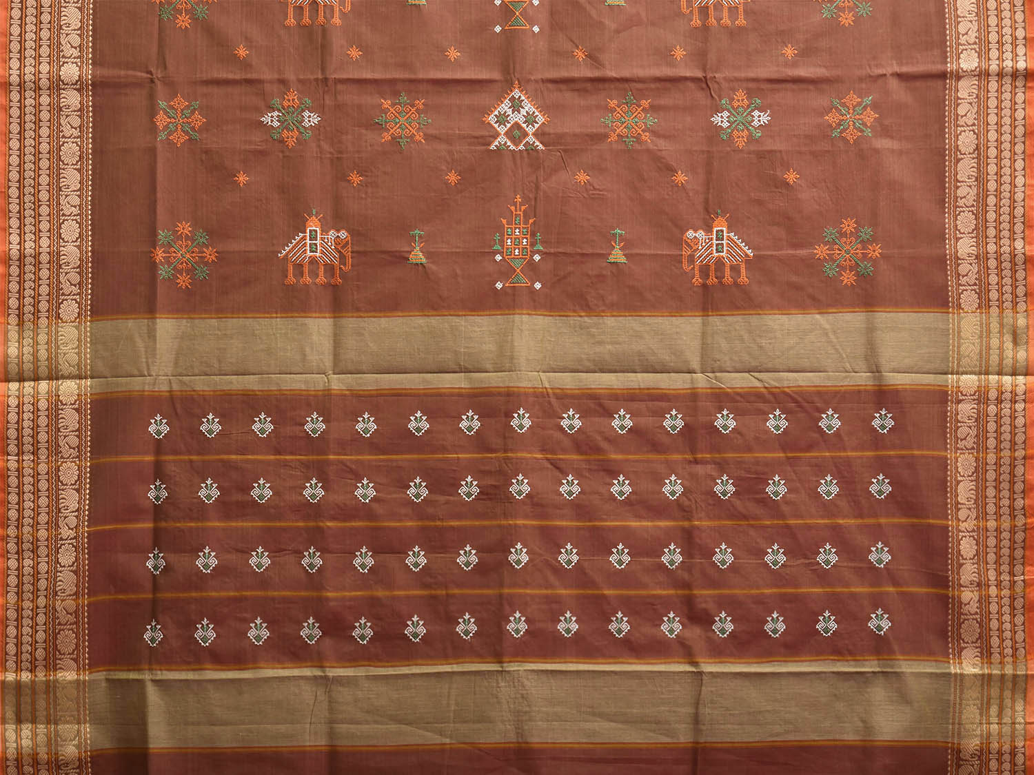 Light Brown Kasuti Kanchipuram Cotton Saree with Elephant Buta and Border Design No Blouse. For fabric care we advise gentle handwash separately. This saree has no blouse.