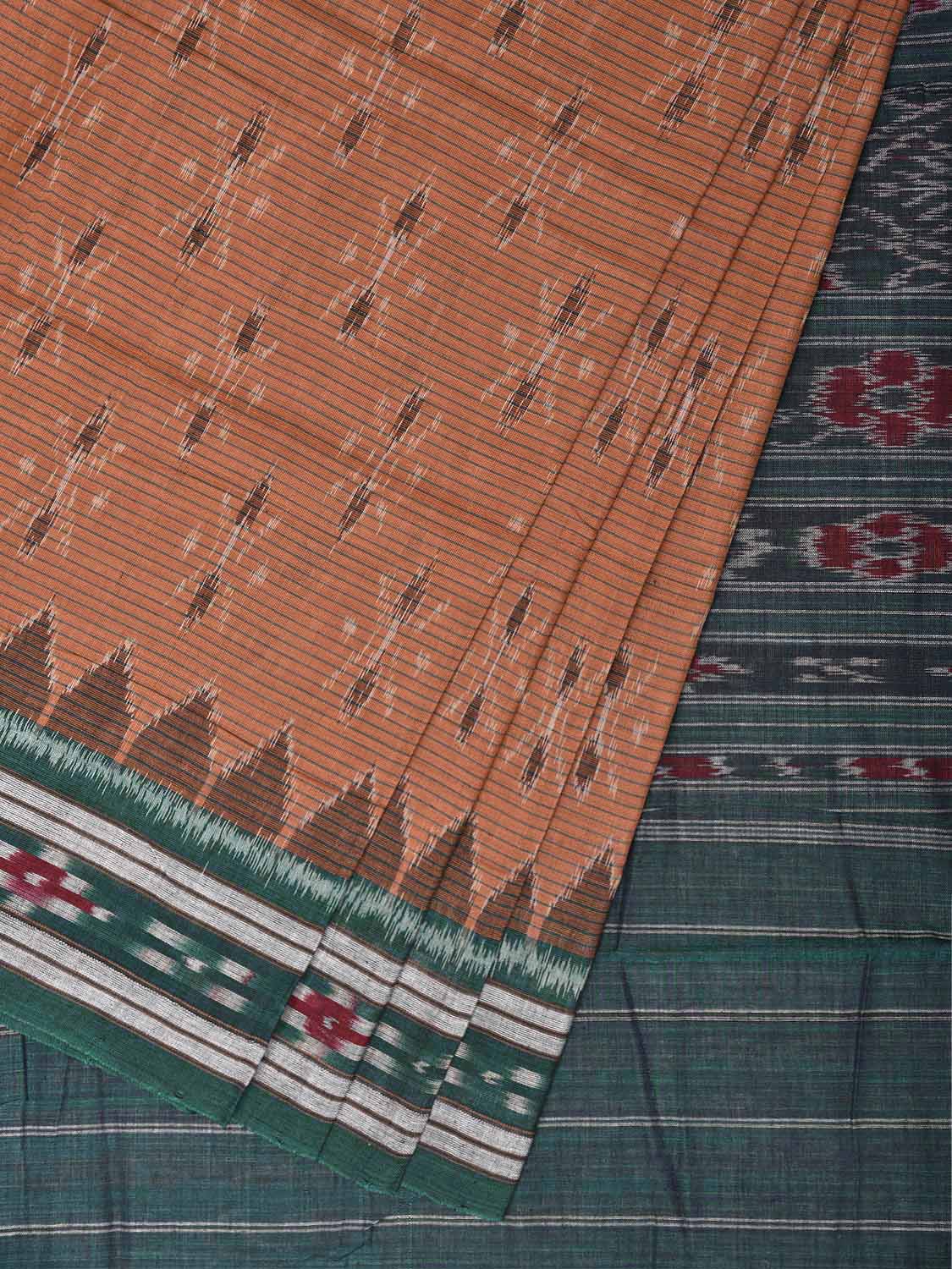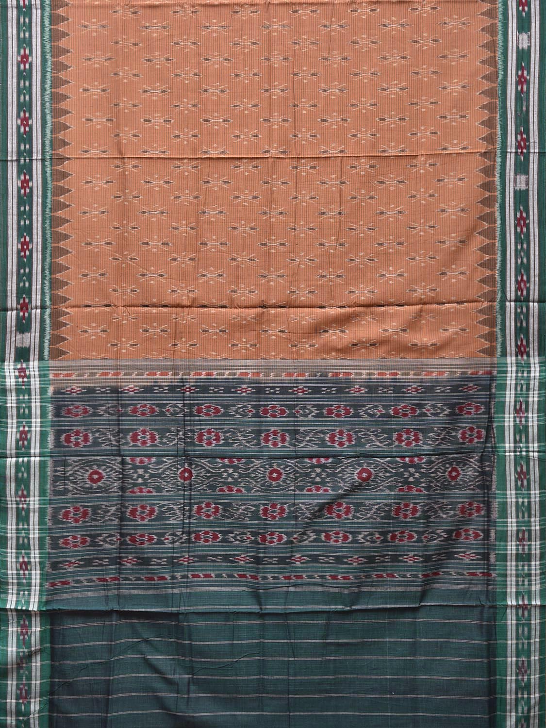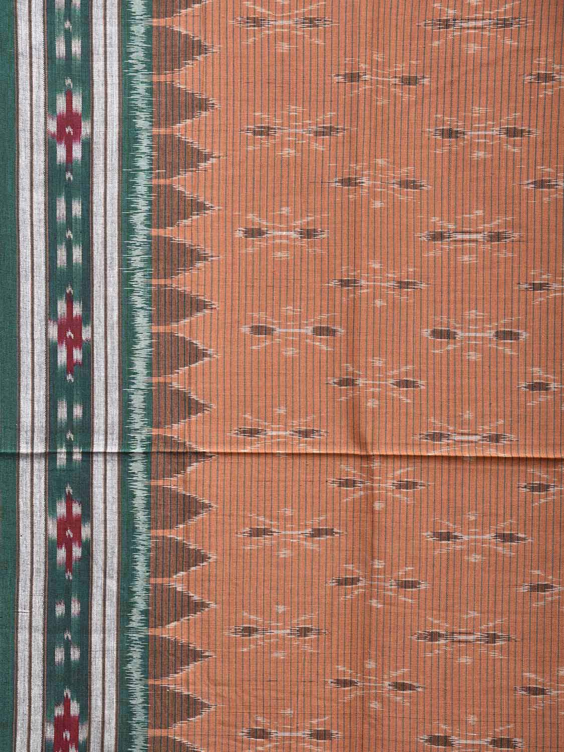 Light Fawn and Green Ikat Cotton Handloom Saree with All Over Body and Pallu Design No Blouse. This Handloom Saree from Andhra Pradesh has been woven using the resist-dyeing, which produces the unique patterns adorning the fabric. We advise gentle handwash separately for fabric care. This saree has no blouse.