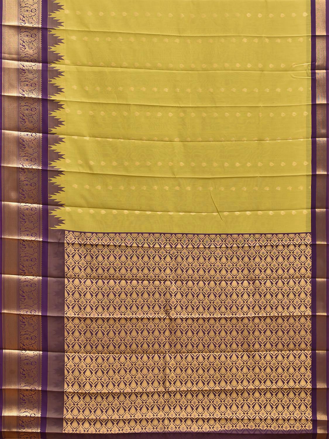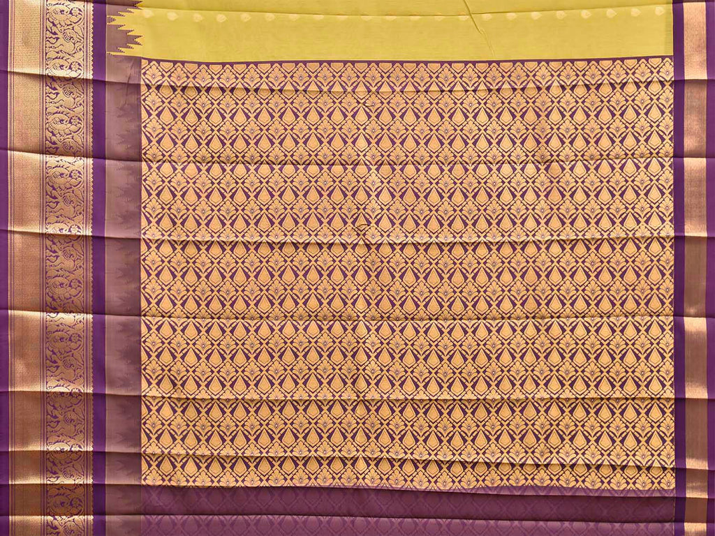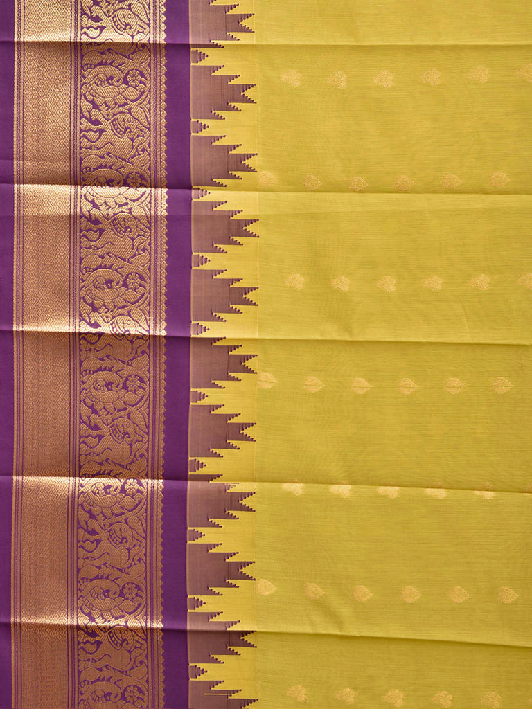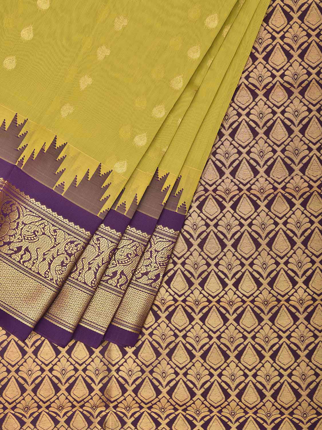 Light Green and Purple Gadwal Cotton Viscose Saree with Body Buta and Temple Border Design. Gadwal Sarees are known for their traditional design of border and pallu made of silk and body being either cotton or silk. They are known as Sico sarees for border and pallu being silk and body being cotton. We advice dry clean for fabric care.