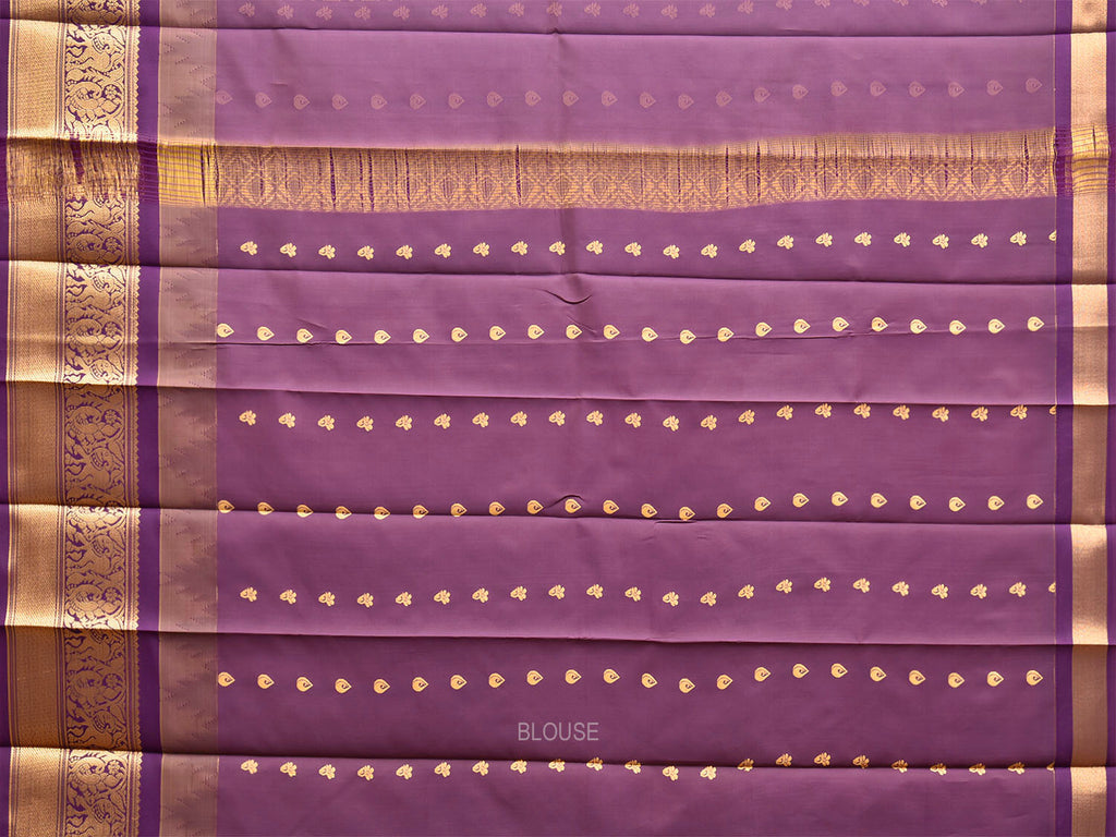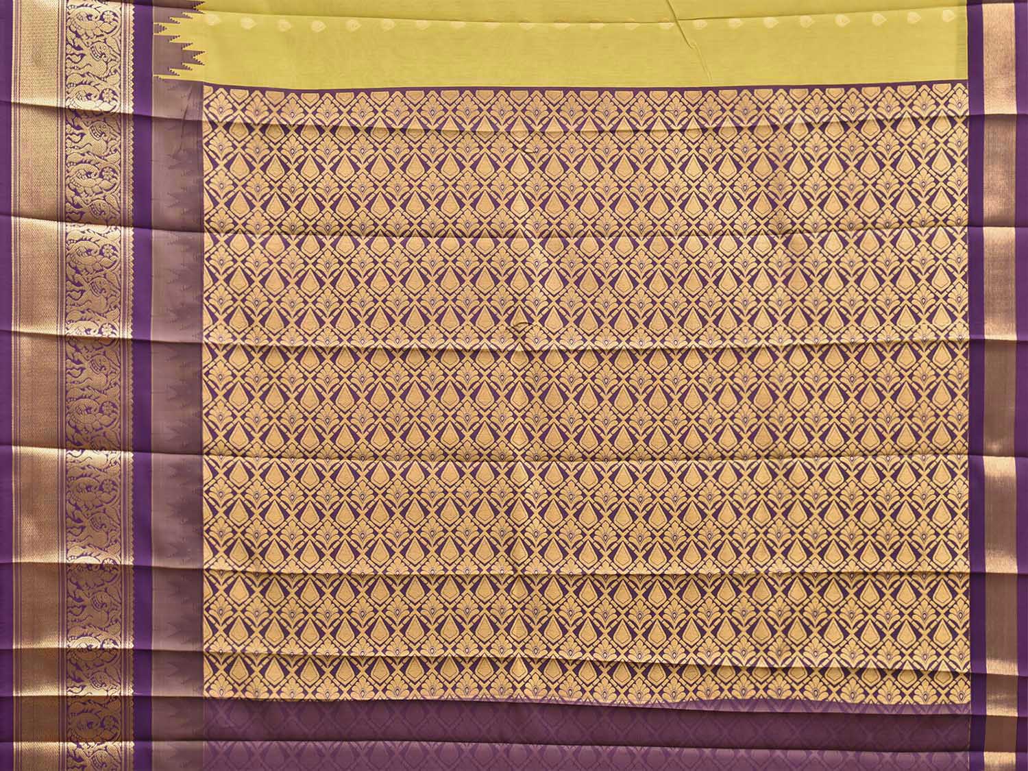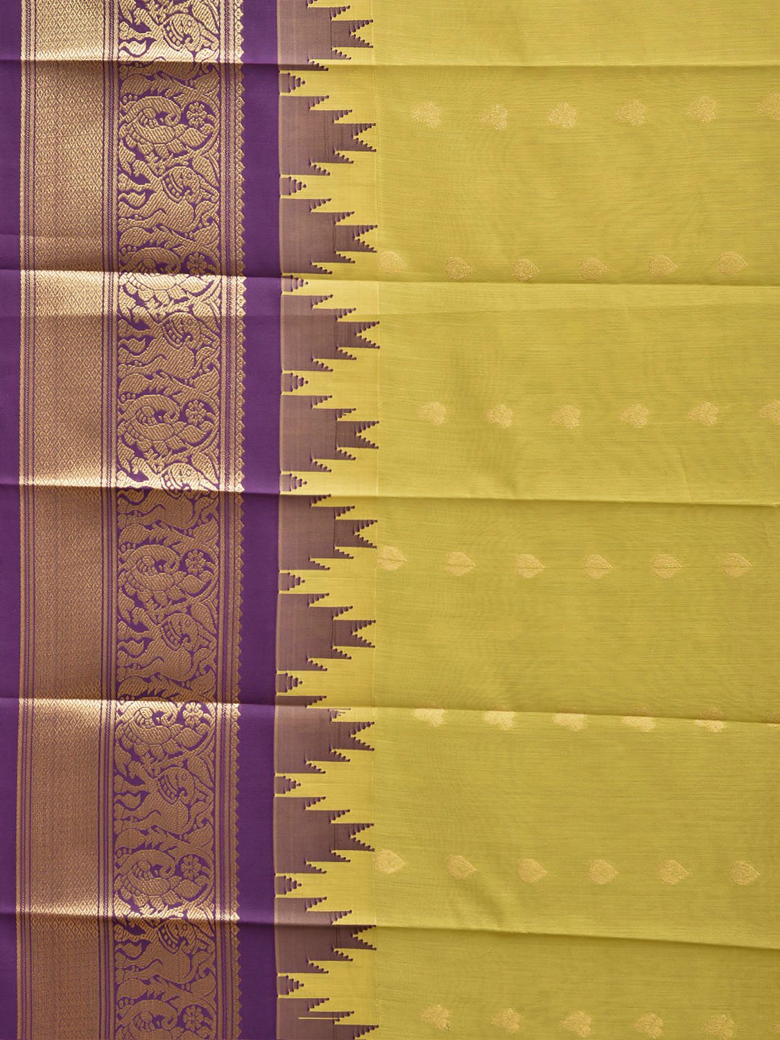 Light Green and Purple Gadwal Cotton Viscose Saree with Body Buta and Temple Border Design. Gadwal Sarees are known for their traditional design of border and pallu made of silk and body being either cotton or silk. They are known as Sico sarees for border and pallu being silk and body being cotton. We advice dry clean for fabric care.