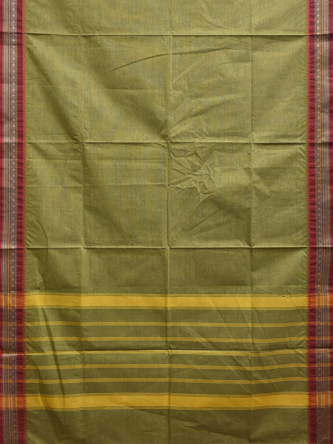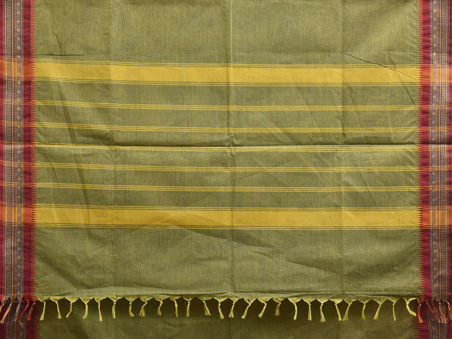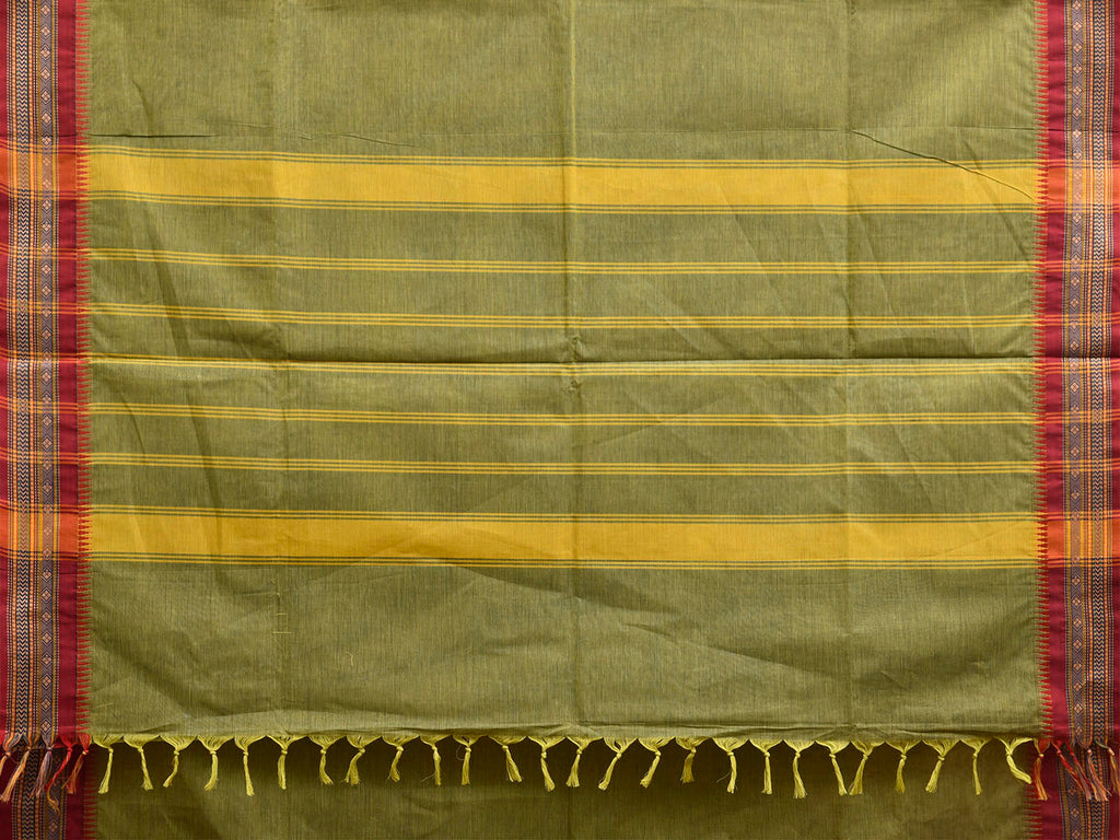 Light Green Kanchipuram Cotton Plain Saree with Strips Pallu Design No Blouse. This saree has no blouse.