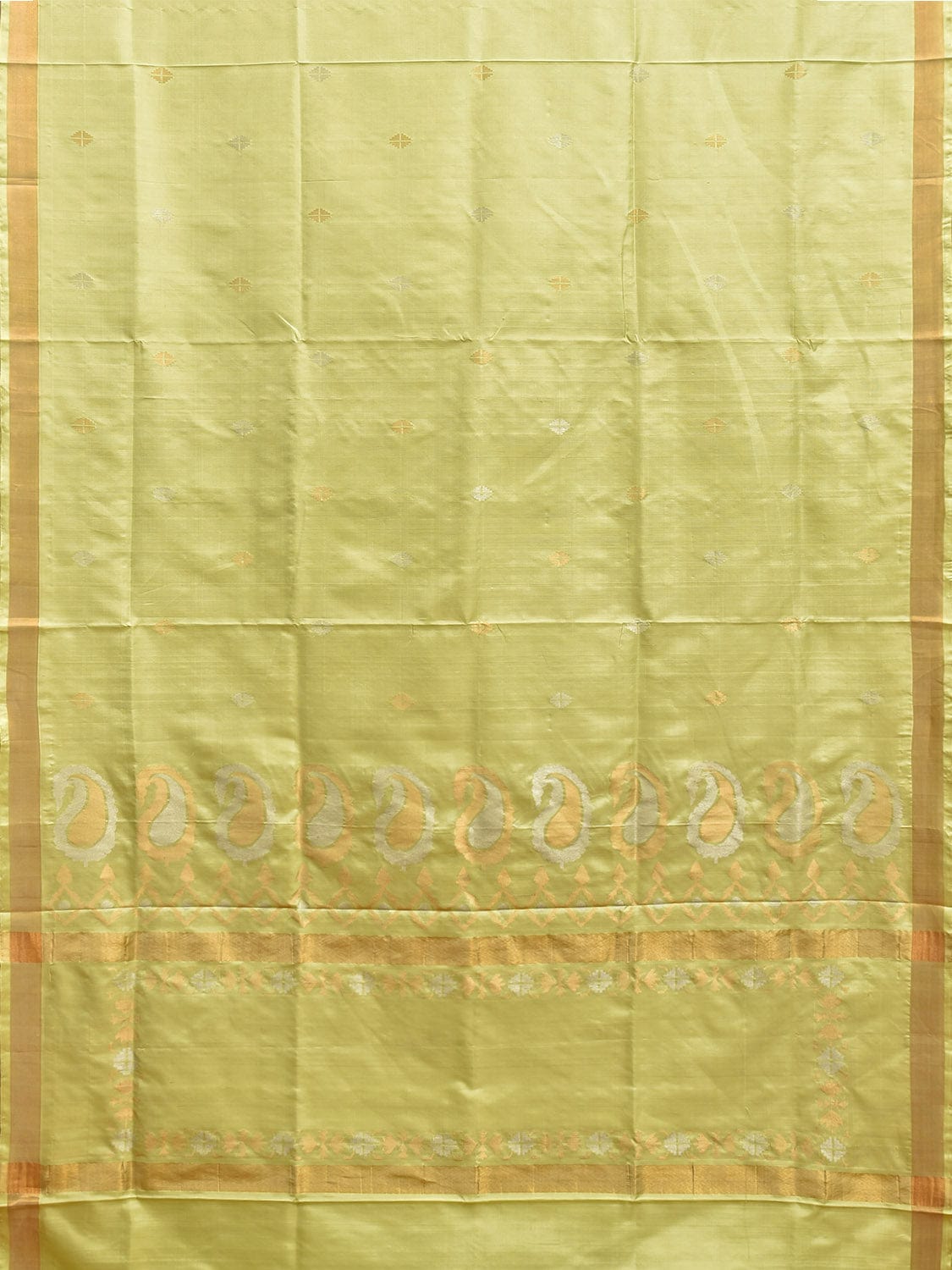 Light Green Uppada Silk Handloom Saree with Mango Pallu Design. Uppada sarees are known for light weight sarees with jamdani weaving technique. With so many traditional designs it is considered for the very special occasion wear. We advice dry clean for fabric care.