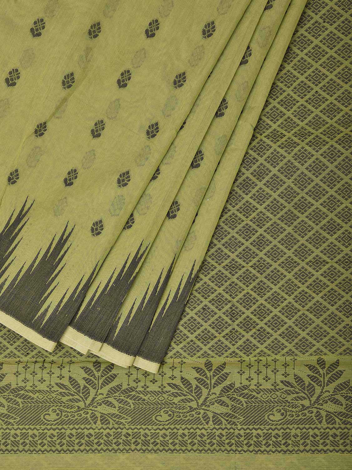 Light Green Venkatagiri Cotton Saree with Pallu and Big Temple Border Design. Venkatagiri sarees are known for very fine cotton hand woven cotton saree. They are light weight and are traditional saree made in Andhra Pradesh. For fabric care we advice gentle handwash separately.