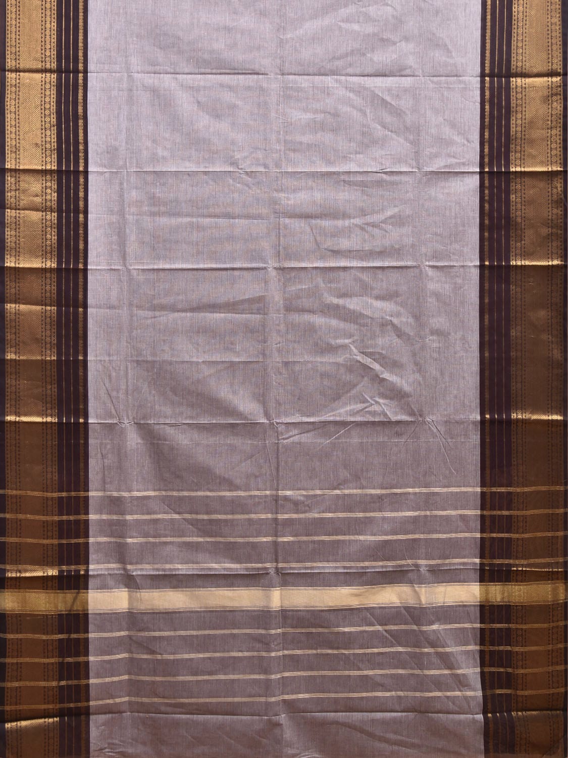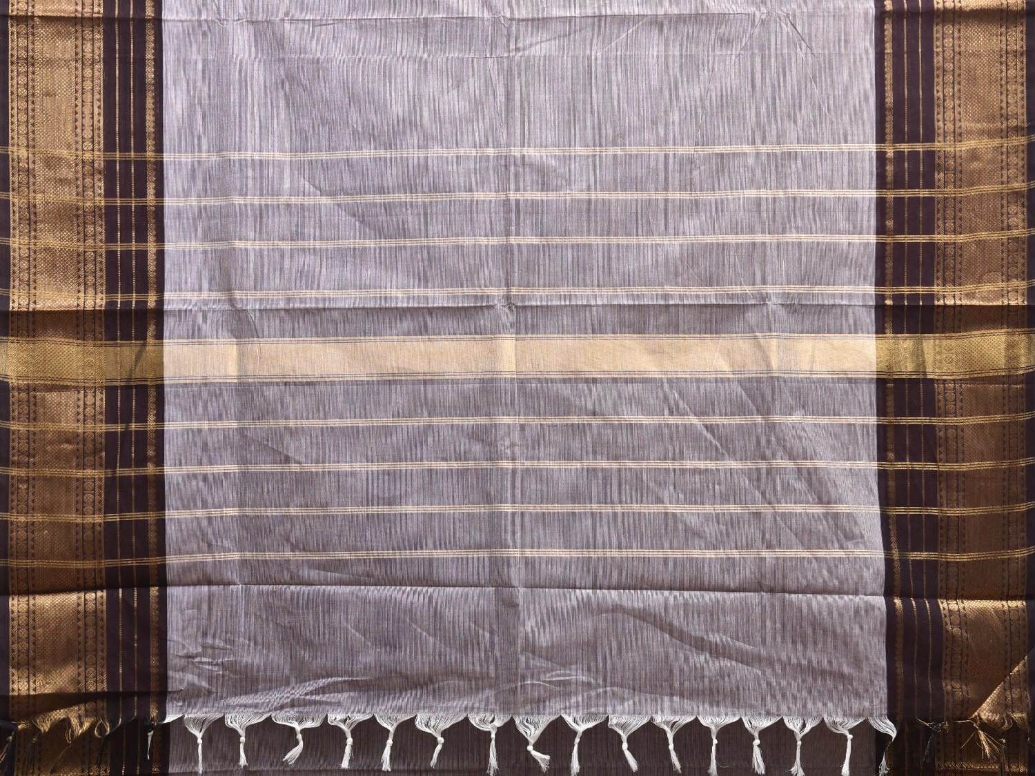 Light Grey and Brown Kanchipuram Cotton Plain Saree with Strips Pallu Design and Kalamkari Blouse. Traditional Simple South Indian Attire Saree for any Casual Occasions. As it’s a cotton saree we advice gentle handwash separately for fabric care.