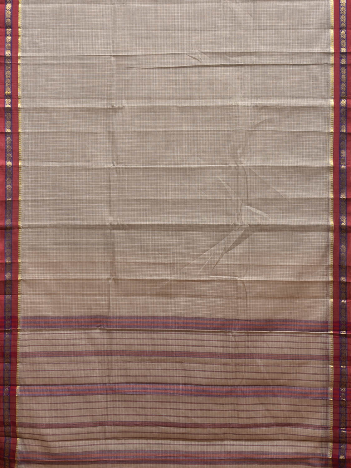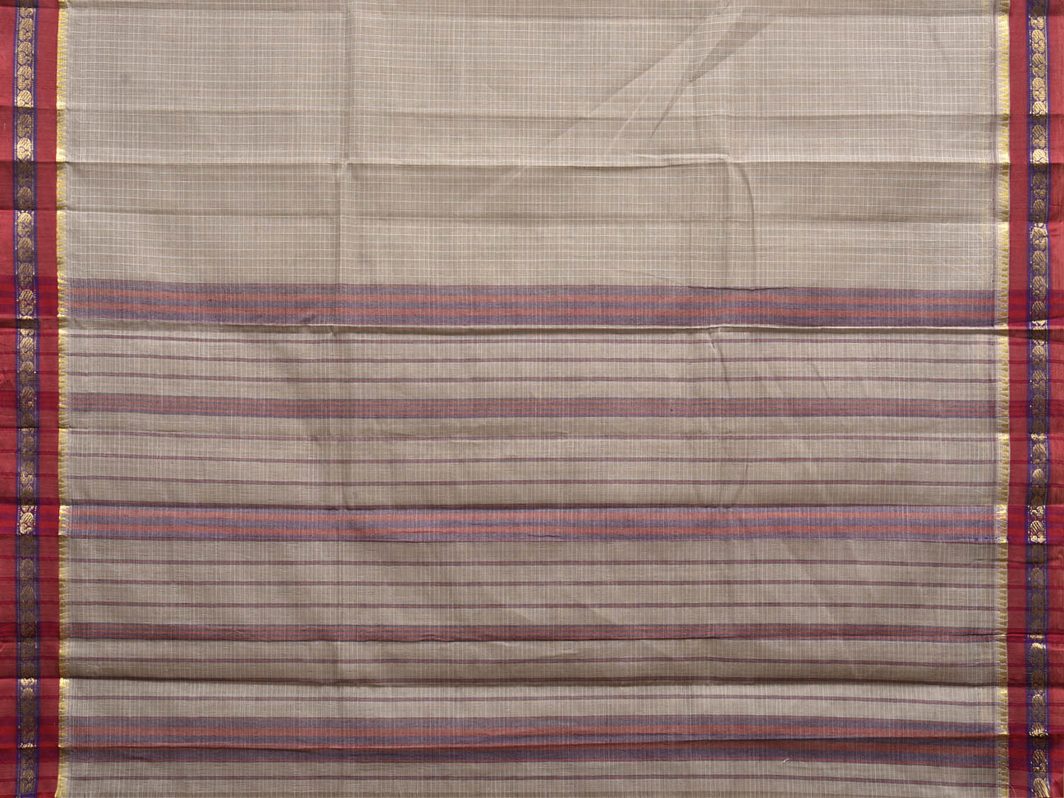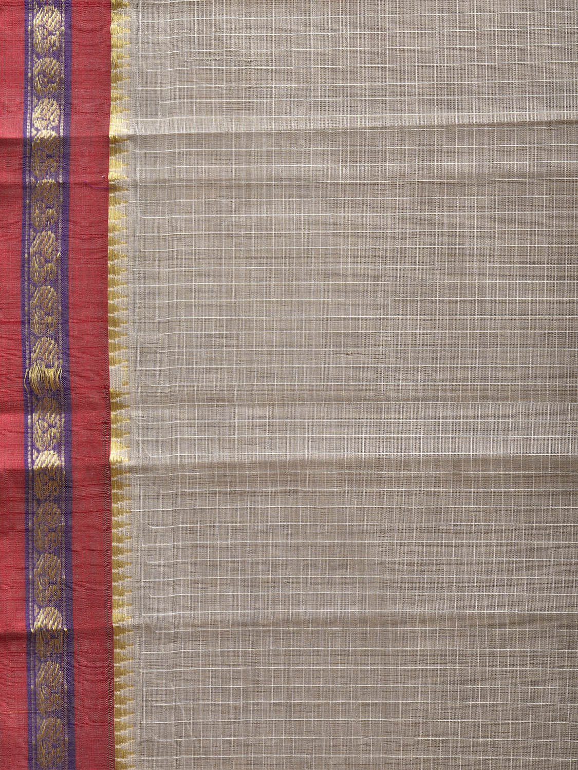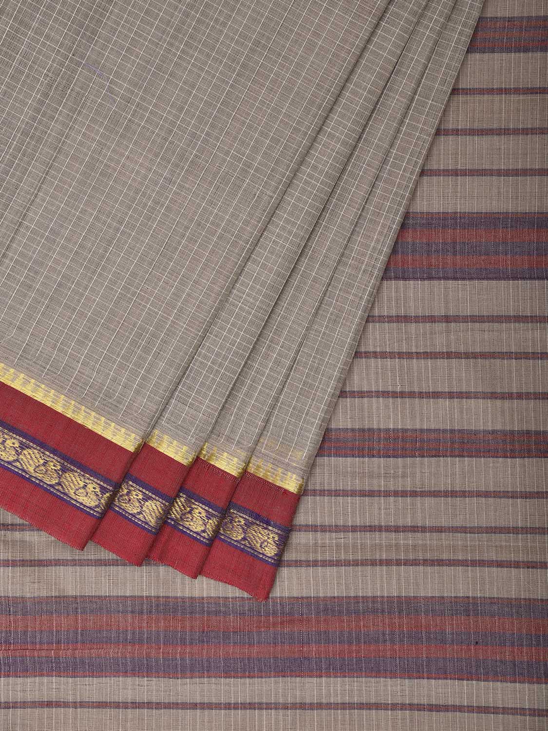 Light Grey and Dark Red Narayanpet Cotton Saree with Checks Design No Blouse. This Saree has no Blouse.