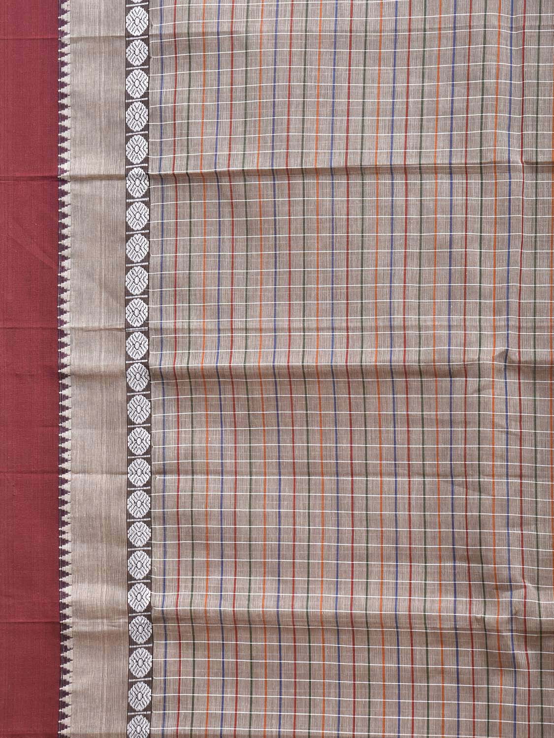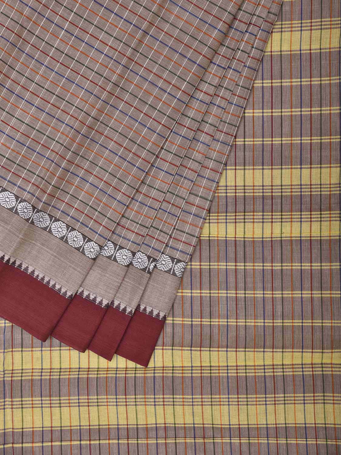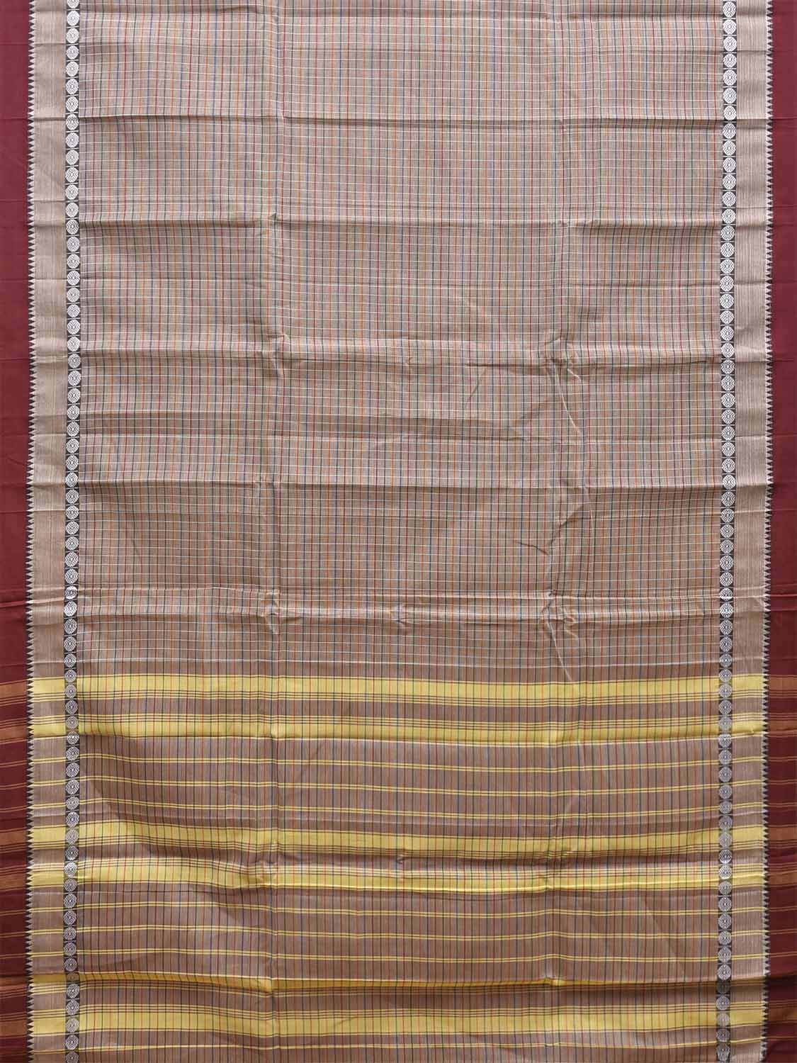 Light Grey and Maroon Narayanpet Cotton Saree with Checks Design No Blouse. This saree has no blouse.