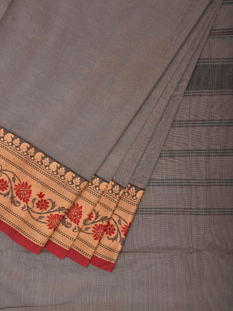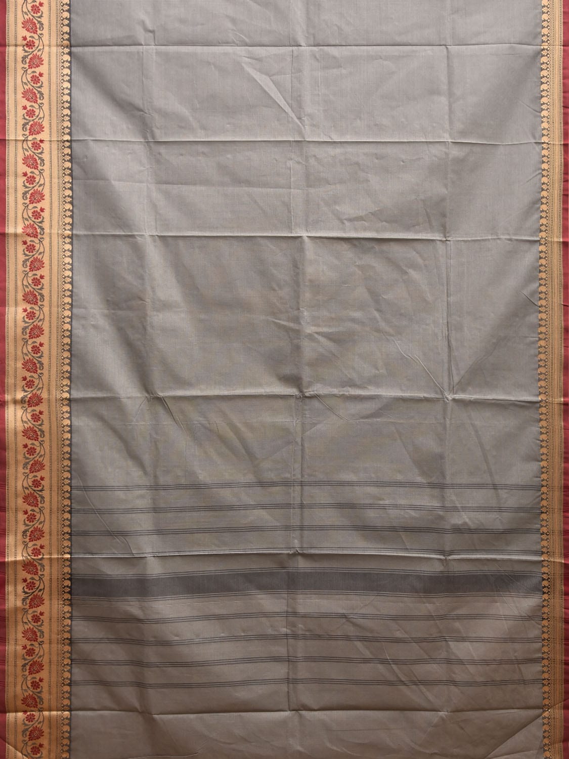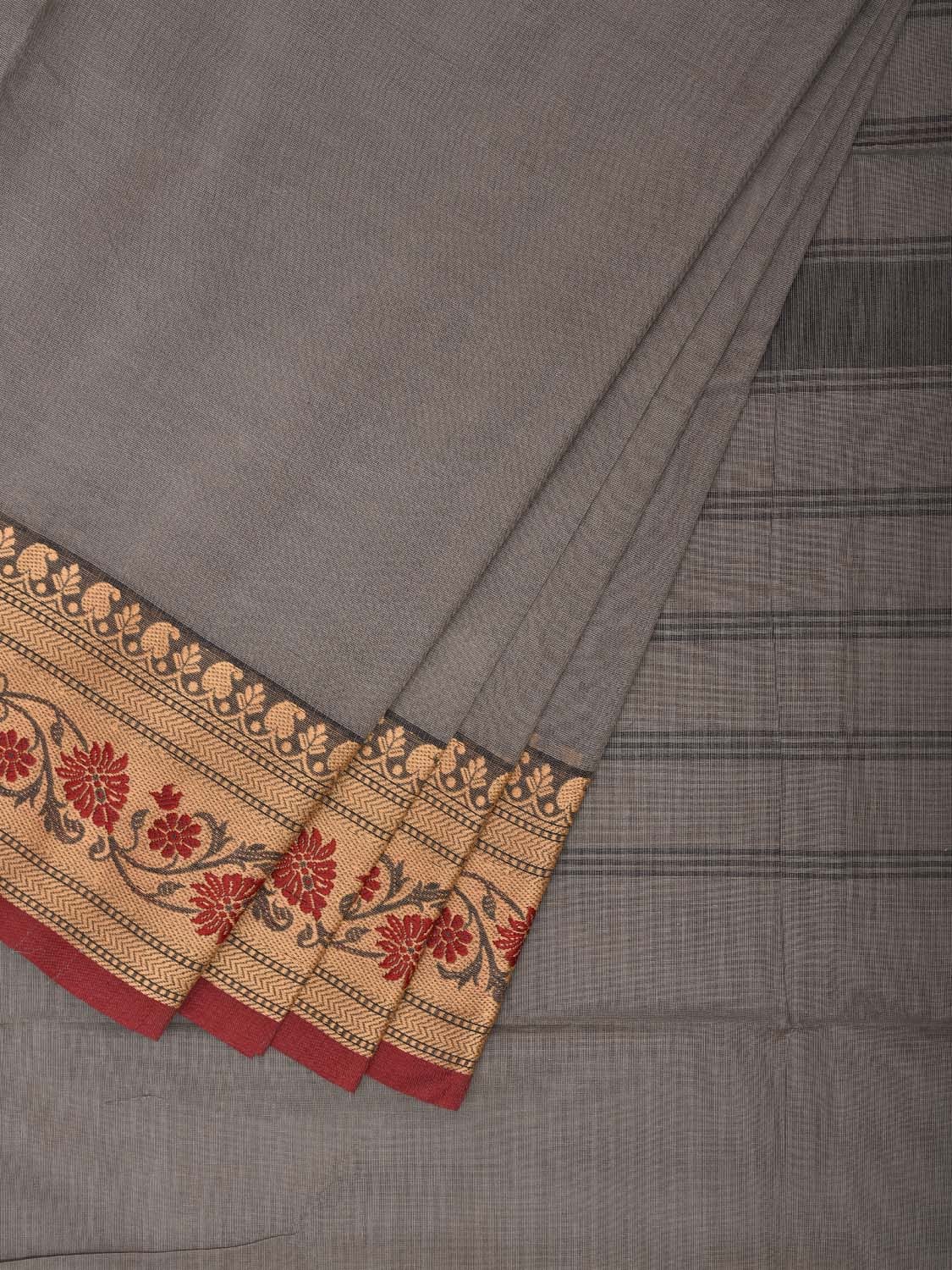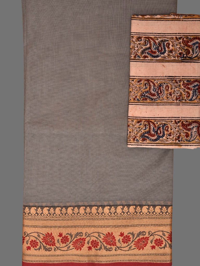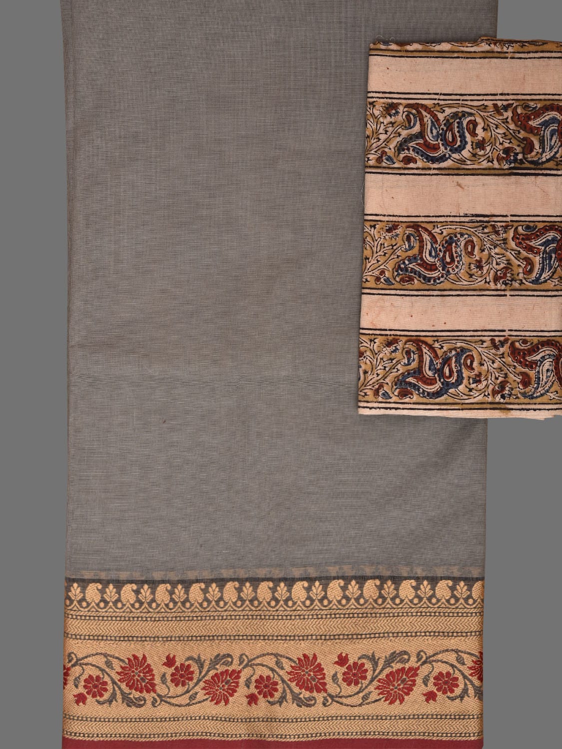 Light Grey Kanchipuram Cotton Plain Saree with Floral Border Design and Kalamkari Blouse. Traditional Simple South Indian Attire Saree for any Casual Occasions. As it’s a cotton saree we advice gentle handwash separately for fabric care.