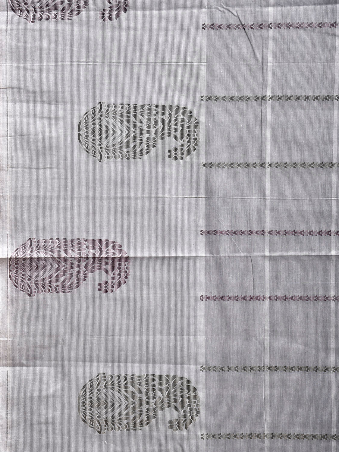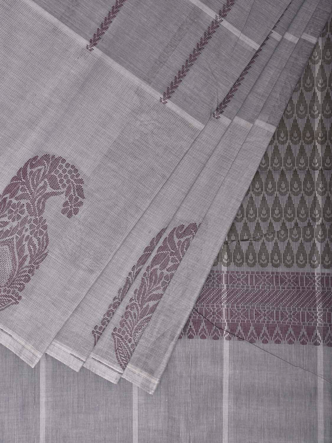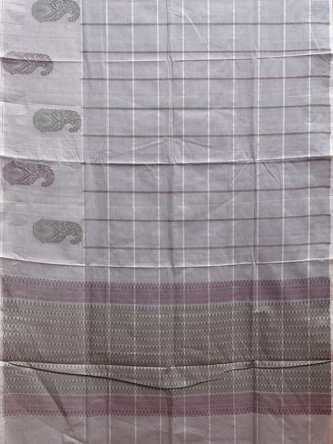 Light Grey Venkatagiri Cotton Saree with Checks and Mango Buta Border Design. Venkatagiri sarees are known for very fine cotton hand woven cotton saree. They are light weight and are traditional saree made in Andhra Pradesh. For fabric care we advice gentle handwash separately.