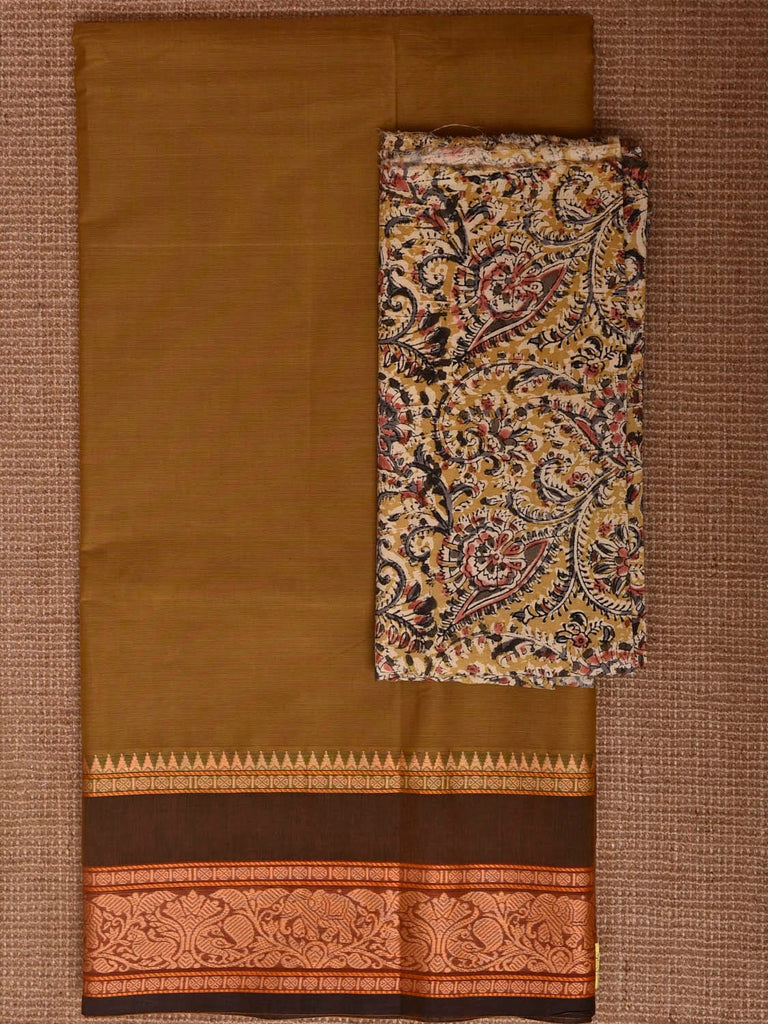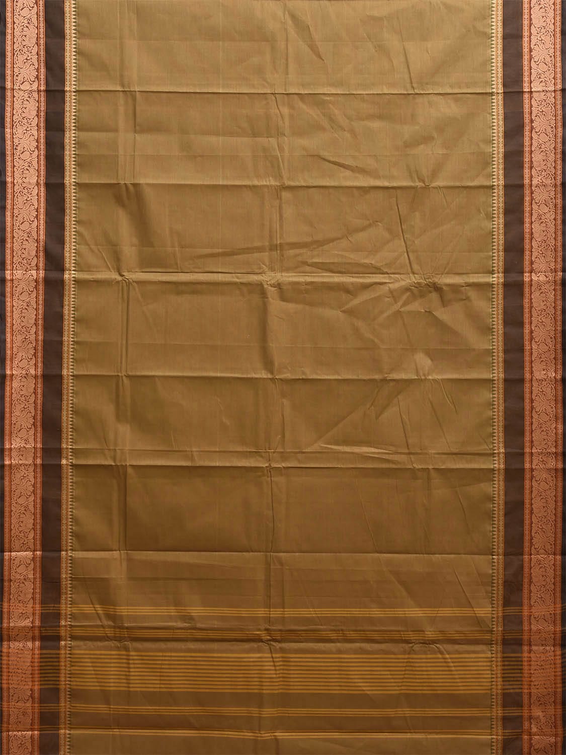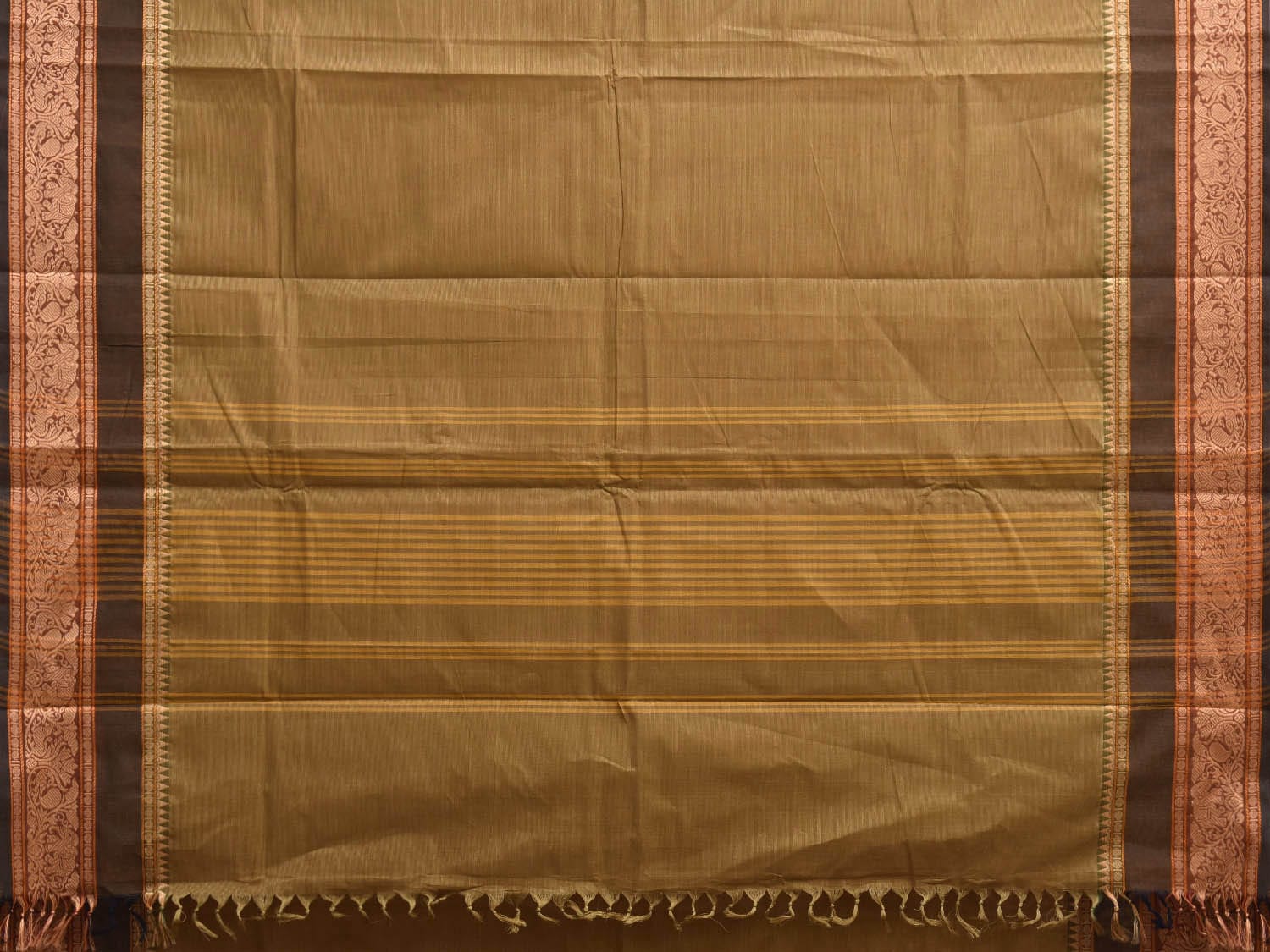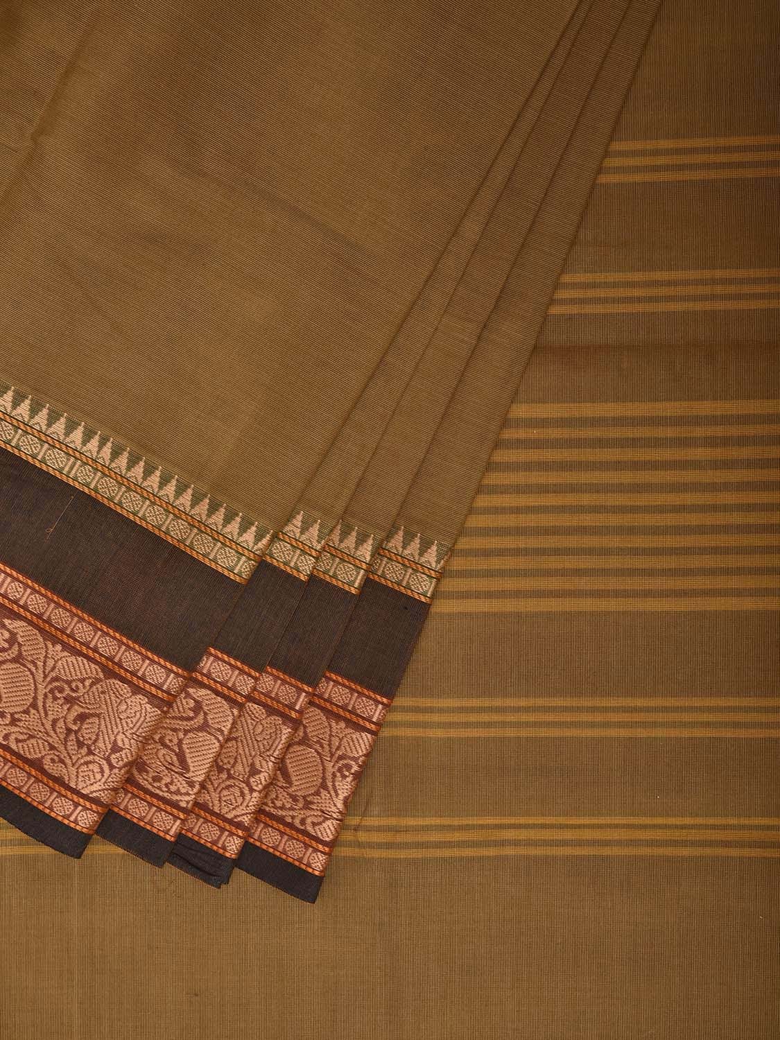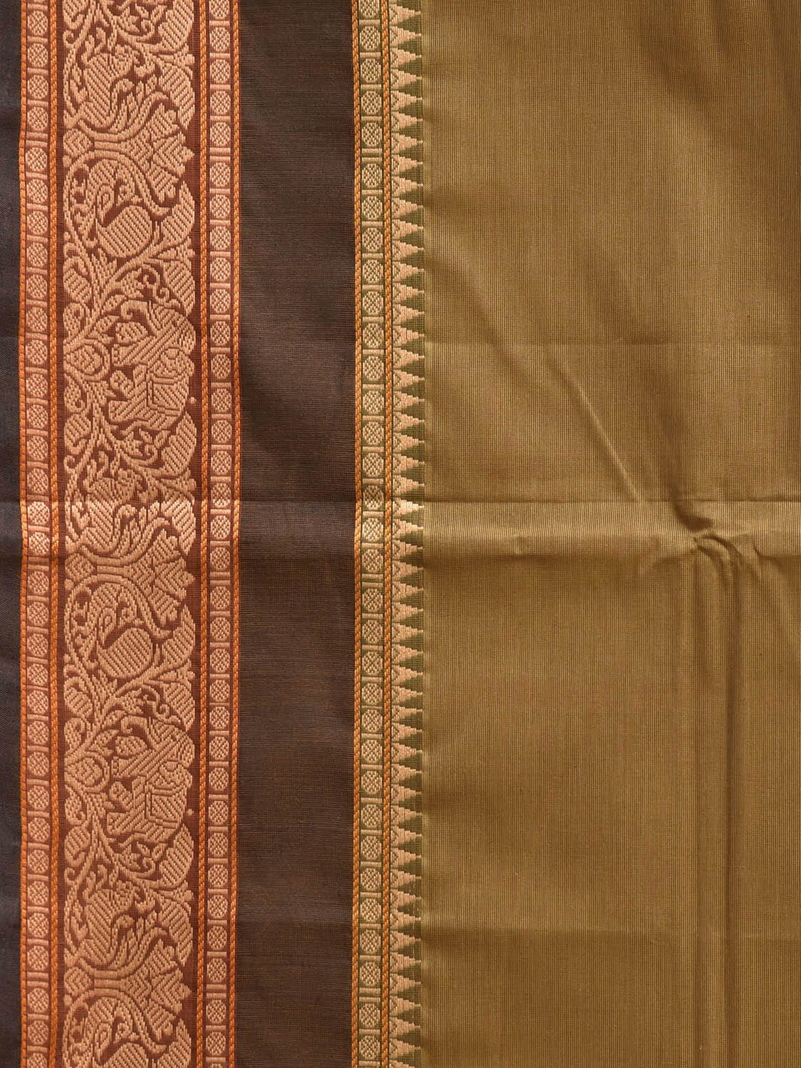 Light Olive Kanchipuram Cotton Plain Saree with Strips Pallu and Border Design. Traditional Simple South Indian Attire Saree for any Casual Occasions. As it’s a cotton saree we advice gentle handwash separately for fabric care.