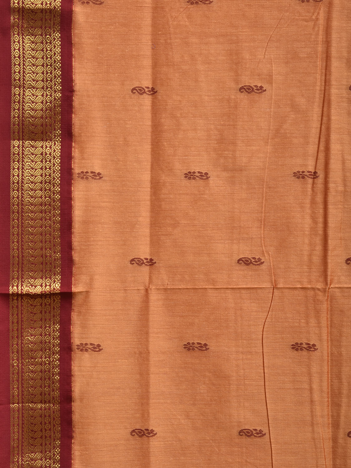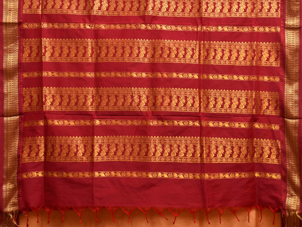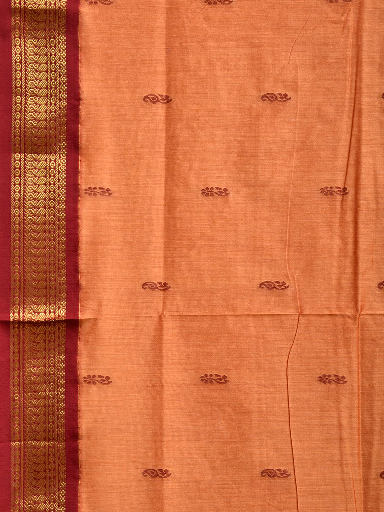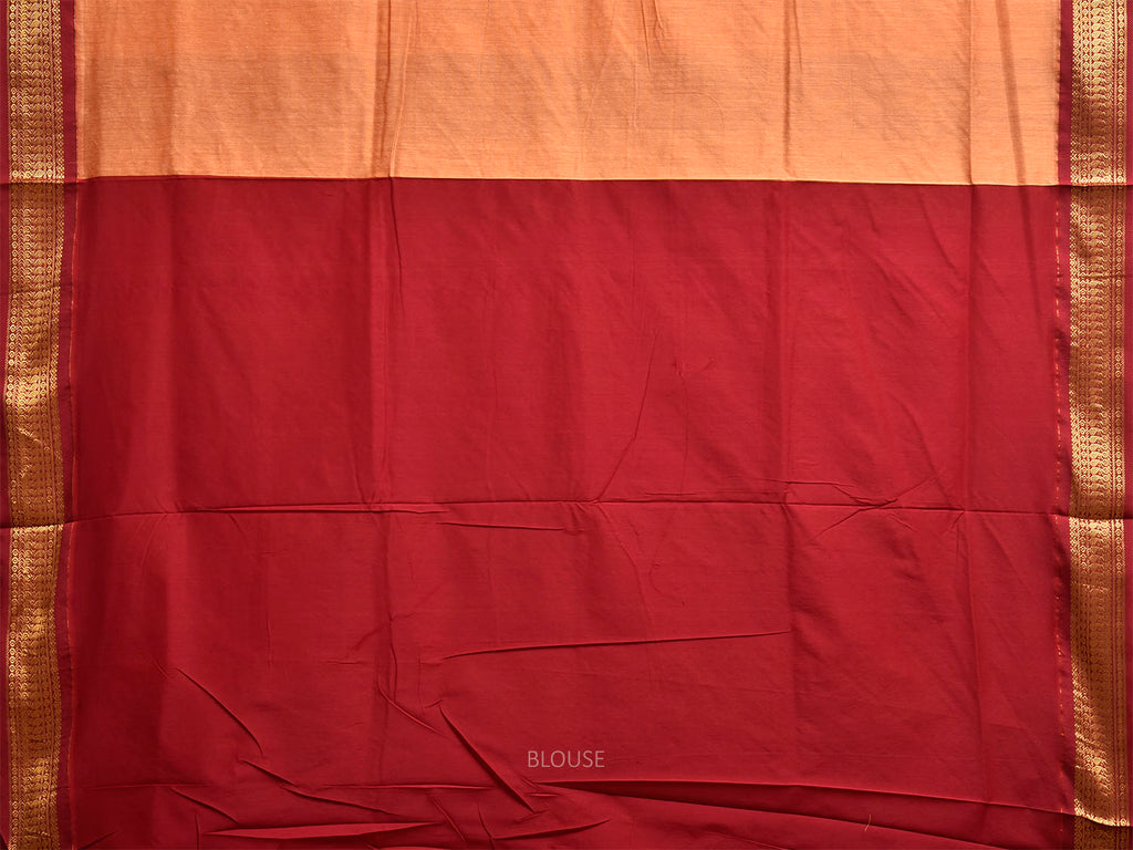 Light Orange and Dark Red Gadwal Cotton Viscose Saree with Pallu Design. Gadwal Sarees are known for their traditional design of border and pallu made of silk and body being either cotton or silk. They are known as Sico sarees for border and pallu being silk and body being cotton. We advice dry clean for fabric care.