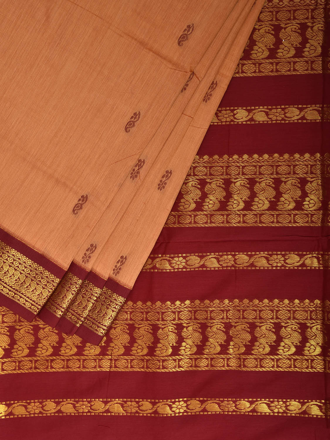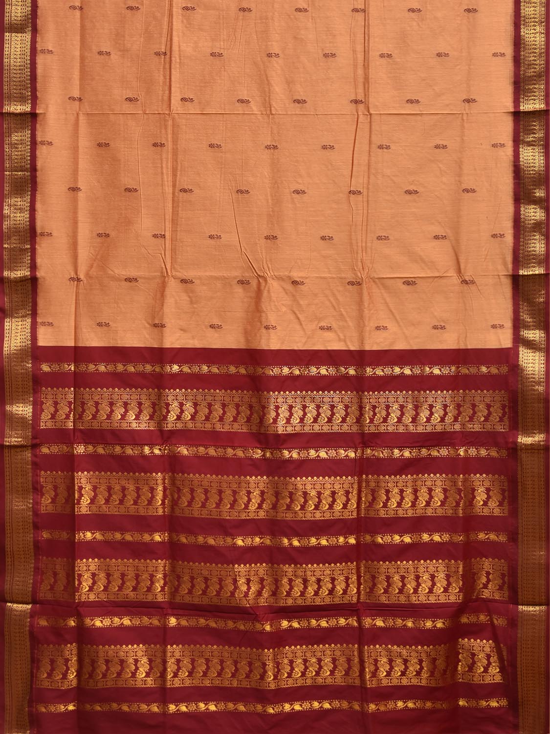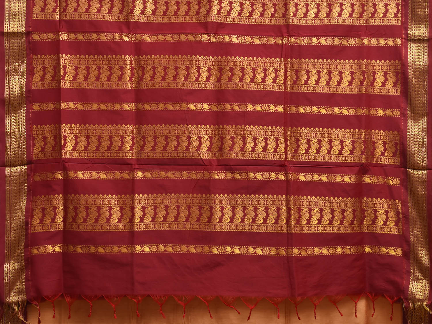 Light Orange and Dark Red Gadwal Cotton Viscose Saree with Pallu Design. Gadwal Sarees are known for their traditional design of border and pallu made of silk and body being either cotton or silk. They are known as Sico sarees for border and pallu being silk and body being cotton. We advice dry clean for fabric care.