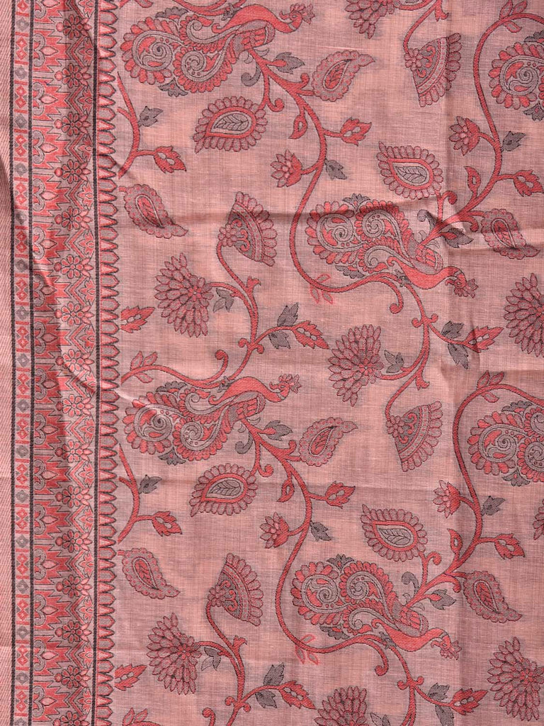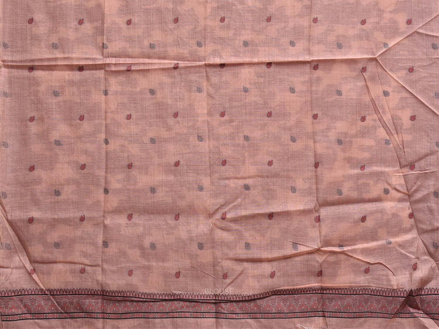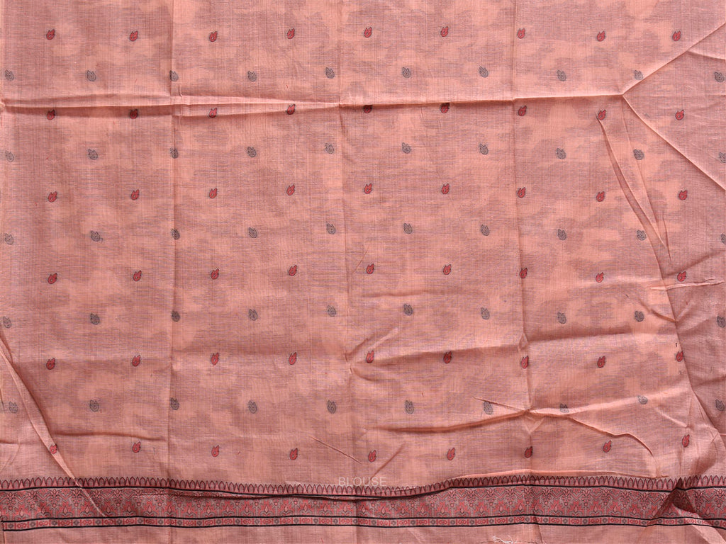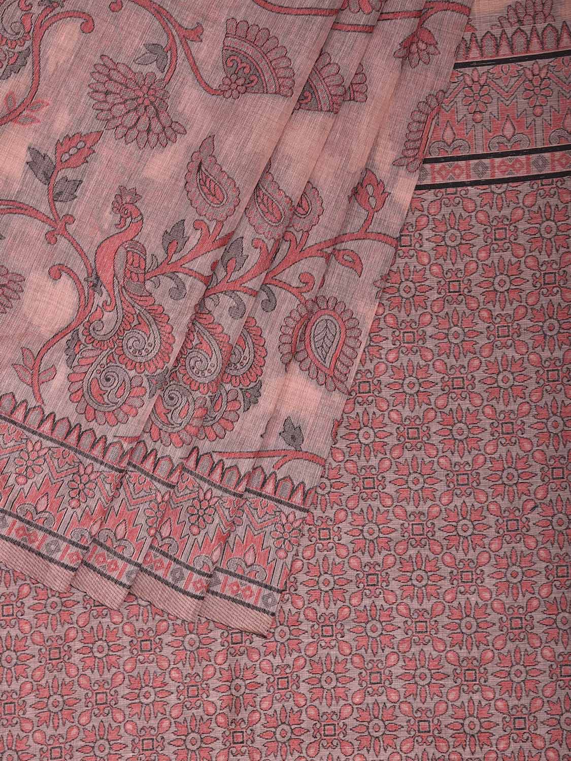 Light Peach Dhakai Jamdani Cotton Viscose Saree with All Over Peacocks Design. These are some of the traditional Dhakai Jamdani designs, these sarees have geometric designs and sometimes floral or combination of both. We advice gentle handwash separately for fabric care.