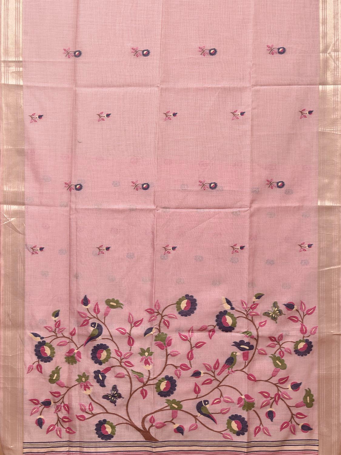 Light Pink Dhakai Jamdani Cotton Viscose Saree with Birds and Floral Pallu Design. These are some of the traditional Dhakai Jamdani designs, these sarees have geometric designs and sometimes floral or combination of both. We advice gentle handwash separately for fabric care.