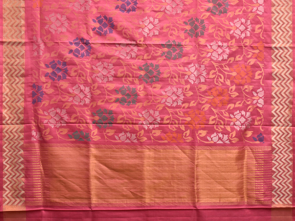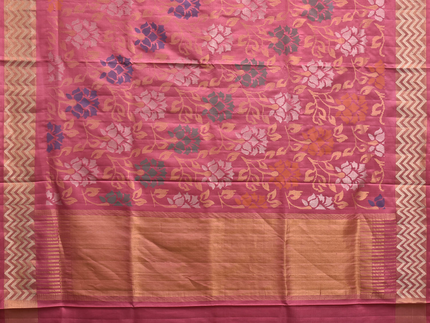 Light Pink Uppada Silk Handloom Saree with All Over Floral and Zig-Zag Border Design. Uppada sarees are known for light weight sarees with jamdani weaving technique. With so many traditional designs it is considered for the very special occasion wear. We advice dry clean for fabric care.