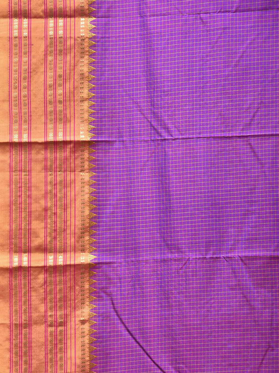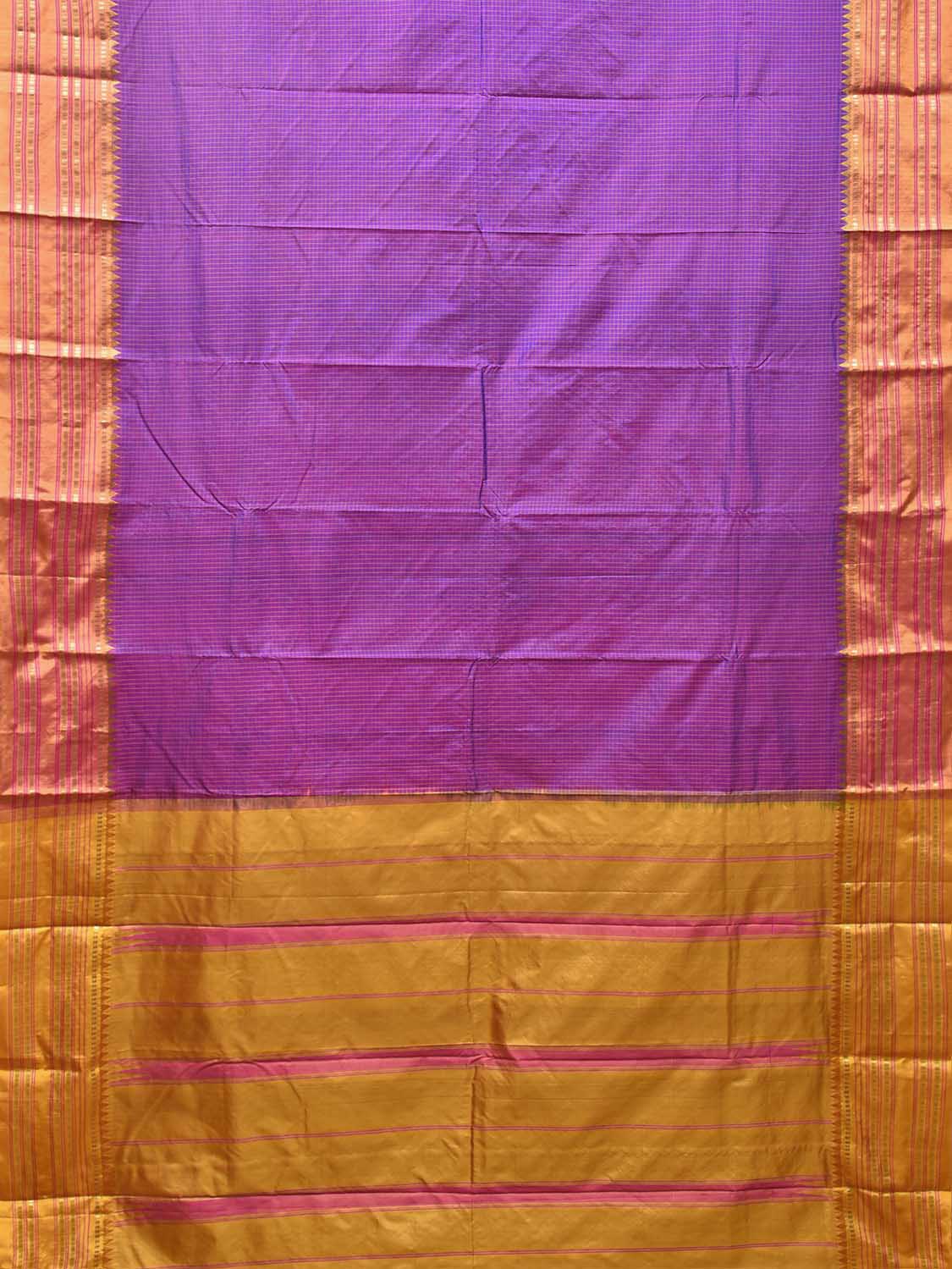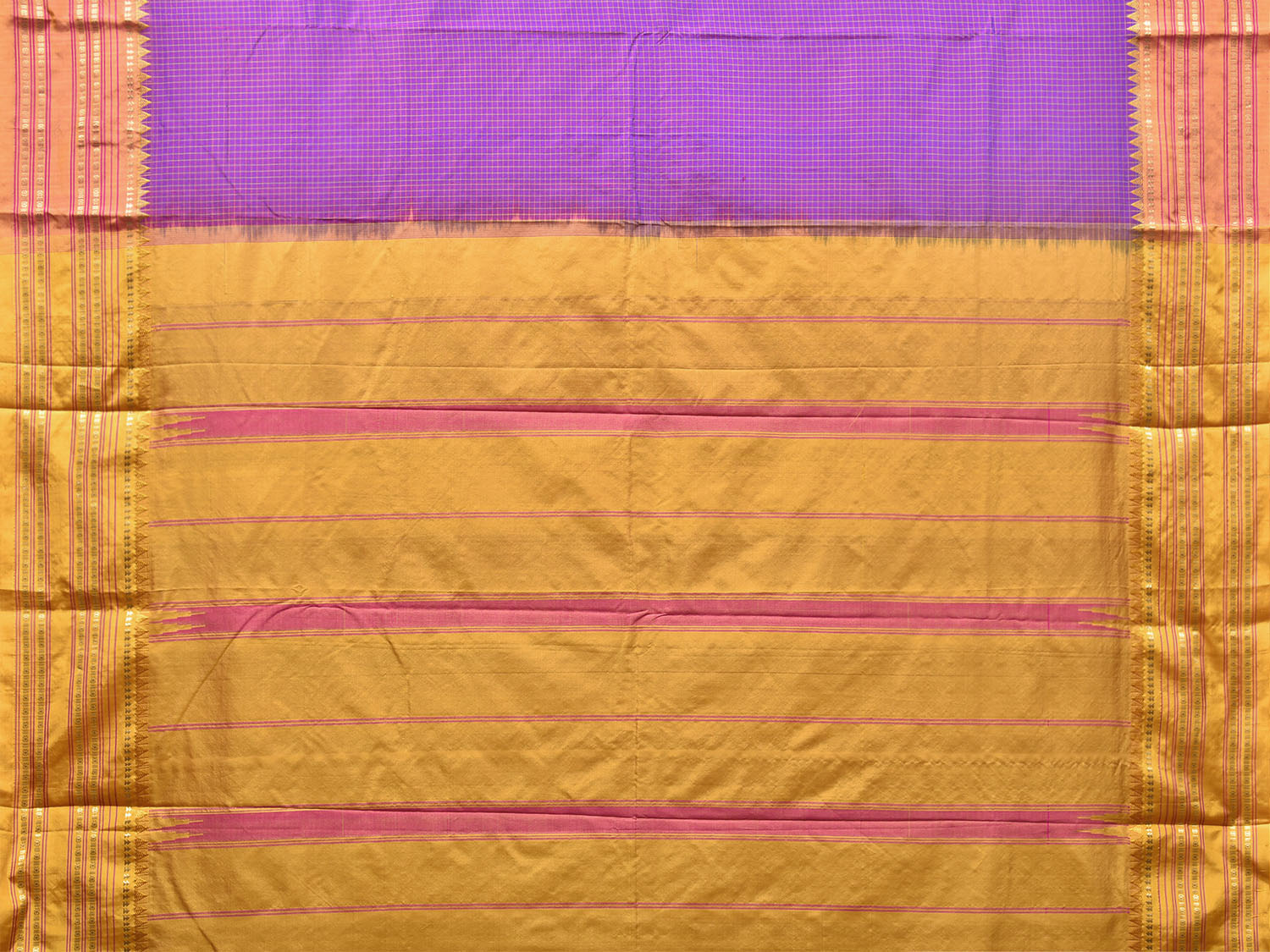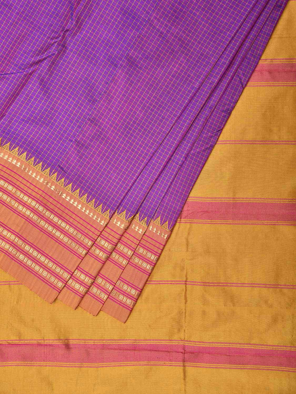 Magenta and Mustard Narayanpet Silk Saree with Checks Design. For fabric care we advise dry clean.