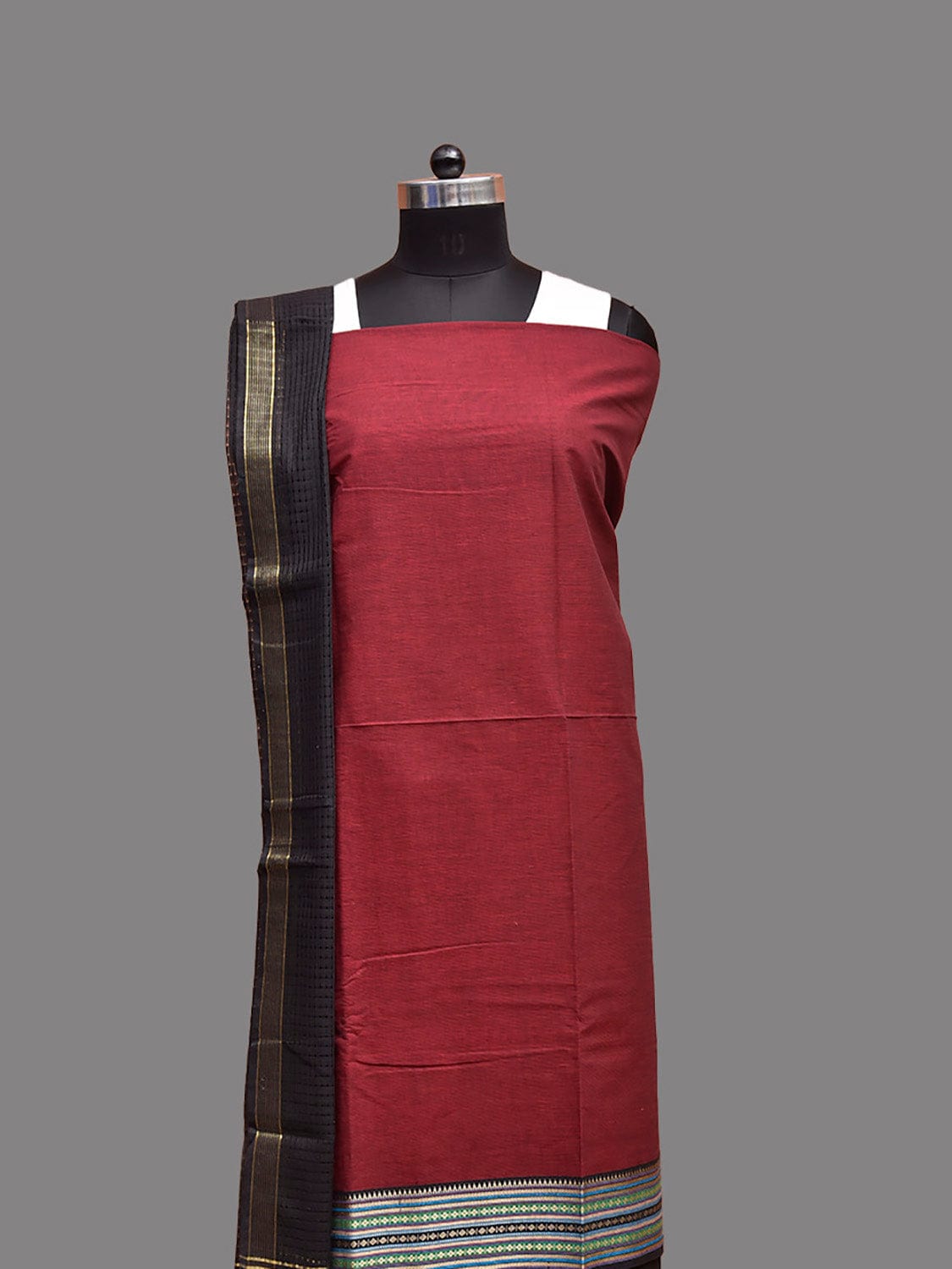 Maroon and Black Kanchipuram Cotton Dress Material with Top Bottom and Dupatta 2.5mt Length. We Advise Gentle Handwash for Fabric Care.