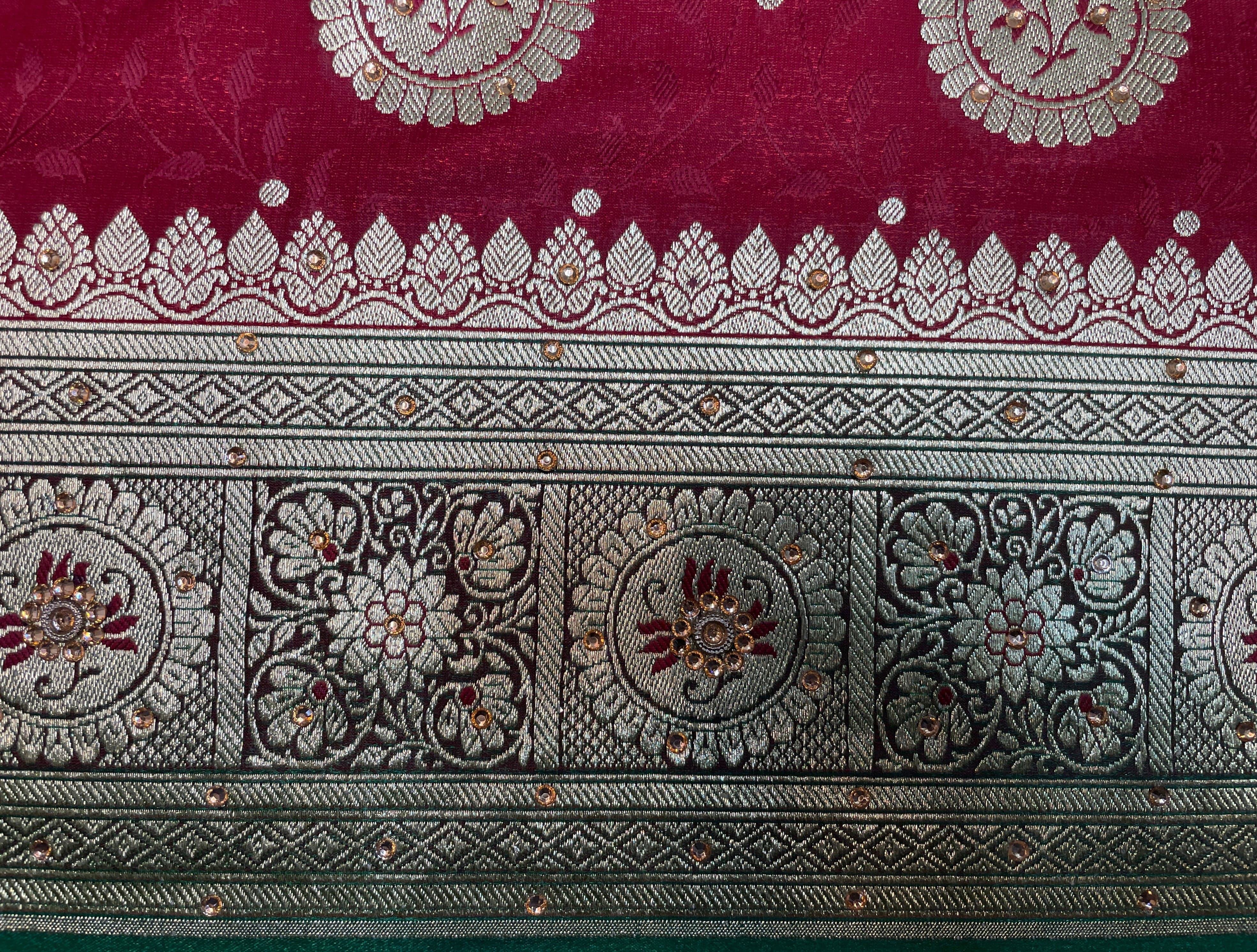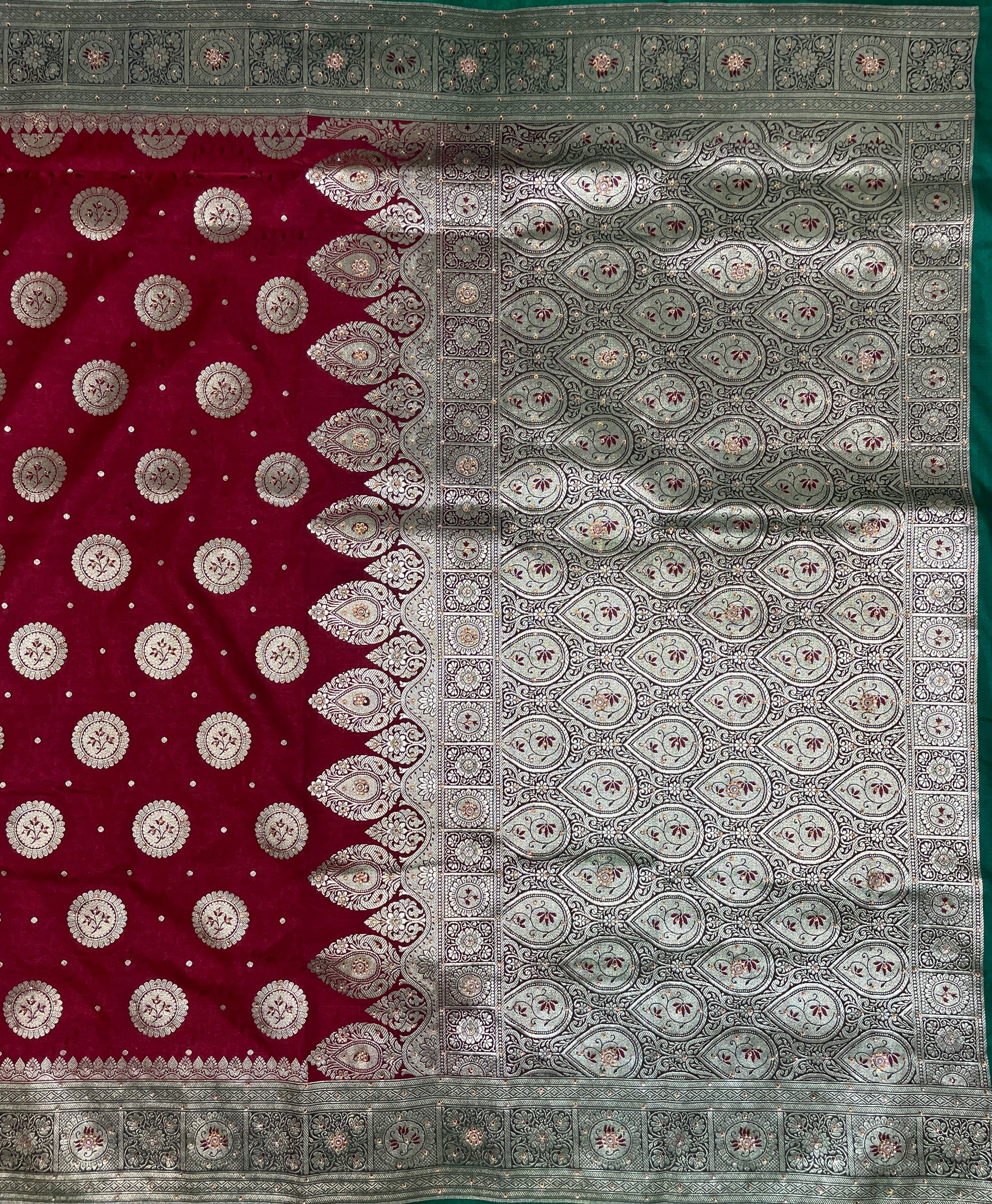 Maroon And Green Katan Banarasi Saree with Silver Zari Floral Weaving And Grand Pallu B0639ds
